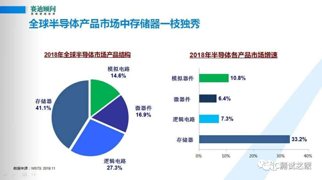 众所周知,芯片产业是《中国制造2025计划》第一实体经济,而Memory芯片又是国家首要发展的芯片细分种类,长江存储、福建晋华的建立和运营无不说明了此点。 据业内知名分析公司-赛迪顾问的统计结果显示,2018年Memory芯片出货量占芯片总出货量的41.1%!市场增速也达到33.2%!