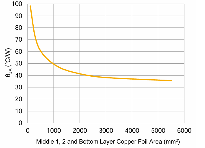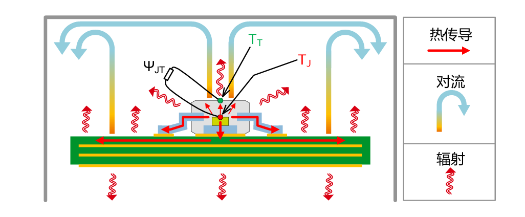 封装半导体器件的热特性与三温测试随着行业趋势向更小、更快和更高功率的设备发展,热管理变得越来越重要。毕竟,如果不对热问题进行仔细权衡,则更高的器件性能可能会付出代价——温度升高和可靠性降低。随着行业趋势向更小、更快和更高功率的设备发展,热管理变得越来越重要。毕竟,如果不对热问题进行仔细权衡,则更高的器件性能可能会付出代价——温度升高和可靠性降低。 一.热阻的概念 1.描述封装器件热性能的常用方法是使用“热阻”,用希腊字母“theta”或θ表示。对于半导体器件,热阻表示在每个瓦特功率(热量)散失到芯片表面时,芯片结点温度上升的稳定状态。其单位为摄氏度/瓦(℃/W)。 2.最常见的例子是 Theta-JA(结点至环境温度)、Theta-JC(结点至外壳温度)和 Theta-JB(结点至电路板温度)。知道了参考温度(即环境温度、外壳温度或电路板温度)、功率和相关的 Theta 温值,就可以计算出结点温度。Theta-JA 通常用于使用安装在环氧树脂玻璃印刷电路板上的元件的自然对流和强制对流空气冷却系统。Theta-JC 适用于直接安装在 PCB 或散热片上的高导电率封装。θ-JB适用于已知封装邻近电路板温度的情况。 3.ψ-JB和ψ-JT实际上是热特性参数,而不是严格的热阻,因为它们描述的是器件内部结点与特定参考点(例如电路板或封装顶部)之间的温升关系,并不直接代表一个明确的两点间热流路径。这种区别对于正确理解和应用这些参数来评估电子设备的热性能非常重要。 二.常用术语 ● TJ (Die Junction Temp, °C):半导体芯片内部结温点(即实际产生热量的地方)的温度。 ● TC (Package Case Temp, °C):封装外壳的温度,通常是在靠近芯片一侧测量的。 ● TB (Board Temp Adjacent to Package, °C):紧邻封装底部的电路板表面的温度。 ● TT (Top of Package Temp at Center, °C):封装顶部中心位置的温度。 ● TA (Ambient Air Temp, °C):环境空气温度,即设备周围空气的温度。 ● θJA (Theta-JA, °C/W):从结点到环境空气的热阻,表示结点温度与环境空气温度之间的温差相对于耗散功率的比例。 ● θJC (Theta-JC, °C/W):从结点到封装外壳的热阻,表示结点温度与封装外壳温度之间的温差相对于耗散功率的比例。 ● θJB (Theta-JB, °C/W):从结点到电路板的热阻,表示结点温度与电路板温度之间的温差相对于耗散功率的比例。 ● ΨJB (Psi-JB, °C/W):结点到基板热特性参数,不同于θJB,它提供了基于特定条件下的实验数据来估算结温的方法。 ● ΨJT (Psi-JT, °C/W):结点至顶(封装顶部)热特性参数,类似于ΨJB,但它是关于封装顶部中心处温度的。 ●P(Power dissipated bydevice,Watts):设备耗散的功率,单位为瓦特(W),指的是器件工作时产生的热量。 三.热阻和热特性参数的使用方法 1.热阻θJA的使用方法 热阻θJA是从器件PN结到周围环境温度的热阻。θJA的符号还 有RthJA、RθJA、Theta-JA 。θJA如图1所示。另外,如式(1)所示,结温度和周围环境温度的温差除以功率损耗(热流量)。 图 1 : θJA的定义 数据表中记载θJA是在 JEDEC 标准 JESD51-2A 中定义的环境中测量的值。用于比较在相同环境下测量的其他产品的散热性能。 在特定的应用下、环境与 JEDEC 不同, θJA的值也不一样。因此,在特定应用下不能使用数据表中记载的θJA、将式(1)变形为 TJ 的式子来推定结温度。 No.1.θJA的使用案例 案例A 在不同的产品之间比较θJA,选择散热性能好(θJA低)的产品来使用。 在这个例子中,产品A和B的基板条件相同,所以可以进行 比较,但是产品C的条件不同,所以不能进行比较。需要得 到相同条件的数据。 案例B 预先通过现有 应用已判断结温度时,在不同的产品间比较θJA,确定结温度相对变化多少度。即使JEDEC下的θJA和现有应 用下的θJA不同,是相对比较,也作为依据处理, 如式(2)所示。 在使用产品A的当前应用中,结温度为155℃。推测变更为产品B的结温度会达到多少。功率损耗计算为2W。 ![]() 案例C TO 封装等通孔部件由于对PCB散热的影响小,所以IC单体 θJA 记载在数据表中。如果应用中不使用散热器,可以使用公式(3)估计结温度。应用下的环境温度,需要考虑包含由于自 身发热和其他零件发热导致环境温度上升部分的状态。 IC单体的θJA为70°C/W、功率损耗为1W、壳体内周围环境 温度的最大值为65°C时,可按以下公式进行推测: 案例D θJA的使用方法项中,虽然写了不能使用数据表中记载 的θJA、将式(1)变形为TJ 的式子来推定结温度。在电路设计 阶段估计结温时,理解根据PCB的不同θJA变化的基础上可以使用。SMD(Surface Mount Device)使用此方法进行粗略估计。 TJ的推定使用式(3), θJA 使用哪个值变得重要了。θJA使用数据表中记载的值,如果比起将来完成的PCB 的θJA,数据表的θJA低的情况下余量为负了,结温度超过绝对最大额定值的可能性变大。 为了防止这种情况,使用热阻比设计的PCB还高的条件下的 θJA。例如,如果设计的PCB为4层,则使用数据表中记载 的1层PCB的θJA的方法。 图2 : HTSOP-J8 封装的θJA 因为1层和4层PCB的铜箔面积有很大的不同θJA也有很大的差别(图3)。如果余量取得过大,结温明显超过时,则可取得铜箔面积可变时的θJA,选择合适余量的θJA(图4)。 图3 : 1 层和 4 层PCB的铜箔面积差异 图4 : 改变铜箔面积时θJA的变化 2.热阻θJC的使用方法 热阻θJC 是从器件PN 结到壳体表面的热阻。θJC的符号还有 RthJC、RθJC、Theta-JC 。数据表中记载θJC测量采用JEDEC标 准JESD51-