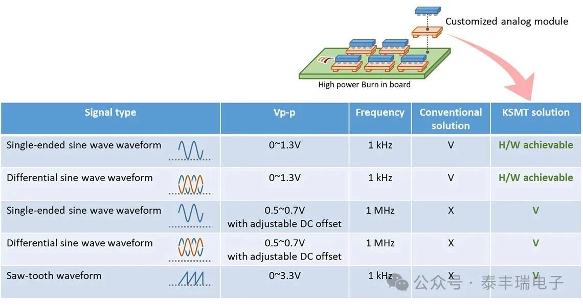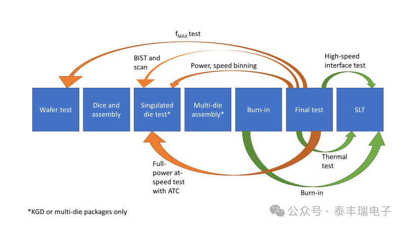 芯片制造后端测试解决方案半导体有两大测试,一般分为 2 个阶段:CP(芯片探测或电路探测)和 FT(最终测试),旨在测试封装的 IC。IC 封装后,需要进行另一轮检查,以控制芯片的良率和质量,以确保芯片的功能和速度符合设计要求。这也是分拣不合格芯片以节省后期生产成本的阶段. ATE Semiconductor Test Socket Socket 1.产品说明 用于BGA/LGA/QFN/DFN/QFP/PGA/CMOS 图像传感器封装等的解决方案。 提供 2 (TP + BP) 至 4 (GP + TP + FP + BP) 片式插座设计。 适用于工程/SLT/ATE 测试。 2.规格 最小间距为 0.25 毫米及以上。 最多可提供 5000 引脚数。 插座工作温度为 -50°C 至 200°C。 ATE/SLT Socket 封装类型 LGA/BGA 间距:1.0 毫米 引脚数 4077 特性:高引脚数。用于高功率 SLT 封装类型 QFN 间距:0.35 毫米 引脚数 105 特性:标准 2(TP + BP)个插座设计 封装类型 QFP 间距:0.4 毫米 引脚数 120 特性:QFP 标准 4 (GP+FP +TP+BP) 件设计 封装类型 BGA/LGA 间距:0.8 毫米 引脚数 787 特性:带浮动板。工程/ATE 测试 封装类型 BGA/LGA 间距:0.35 毫米 引脚数 1609 特性 用于Handler/ATE 测试 封装类型 WLBGA 间距:0.4 毫米 引脚数 16 特性 适用于 Min SQ1.69mm 封装。工程测试 封装类型 LGA/BGA 间距:0.5 毫米 引脚数 86 特性:带浮动板工程测试 封装类型 BGA 间距:1.0 毫米 引脚数 4344 特性:高引脚数用于高功率 SLT 封装类型 BGA 间距:0.4 毫米 引脚数 22 测试高度:1.90 毫米 特性:高带宽插座。4 个Socket 设计,无屏蔽技术。用于传感器设备测试 ATE TEST Socket ![]() ATE Semiconductor Test Load bord 负载板 3.负载板 Load Board 是一块高度定制的PCB,作为IC 与自动测试设备ATE(Automatic Test Equipment)之间的传输媒介。 随着集成电路设计日渐复杂,在测试及验证IC所花费的工夫也越来越多,对于Load Board 的设计及质量要求也日益渐高。 泰丰瑞电子在测试载板的设计上,利用信号完整性SI(Signal Integrity)、电源完整性PI(Power Integrity)的模拟,来优化及改善测试载板的设计。 针对客户不同的需求模拟数据来调整测试载板Layout,以满足客户的标准。 雍智科技在提供设计载板领域深耕数十年,对于不同自动测试设备(ATE)的平台有相当多的经验,并且也针对不同的测试平台建立了数据库(Data Base)、设计的准则(Guide Line),来增加客户新产品导入NPI (New Product Introduction)以及缩短设计的时间 4.System Level Test 系统级测试载板(SLT) 半导体制程节点的演进加上现今芯片为堆叠算力、增强运算速度,驱使芯片的设计越趋复杂,晶体管密度大幅提升,对于如何抓出缺陷、管控良率,以及避免交出不良品到客户手上成为现今芯片设计公司的重点。 为此,以更全面、系统级的方式去验证芯片的设计成为业界测试芯片的一种方式。 系统级测试能模拟实际终端应用的场景,透过运行程序来检验芯片的良率,此方式亦能补足以往CP、FT测试覆盖率(Coverage Rate)不足的问题。 为满足客户的需求,开始便与客户着手进行SLT 载板的研究及开发,具有丰富的量产经验。 5.可靠度测试(Reliability Test)目的 以质量的角度,电子零件在生产之初尚不成熟时,得经过 “Burn In” 的步骤让一些瑕疵的电子产品提早筛出,并以统计数据来看,可得到浴缸曲线(Bath-Tube Curve),也就是说在使用初期及末期会有较多的电子零件不良,但使用一段时间后电子零件的不良率就会稳定下来。 此目的是为了筛选出在产品开发初期,因为制程不良,设计缺陷等因素,造成产品有潜在性失效或故障的风险,经由此项测试来筛选,避免顾客在使用中造成故障失效。 而BIB (Burn In Board)就是作为半导体IC产品载具,将欲测试之IC透过SOCKET或是直接将IC mount方式与BIB连结,放入测试机台(Oven)内进行不同温度、电压、信号等等之条件反复测试(HTOL, LTOL,HAST & THB等... ) 求取出Bathtub Curve 浴缸曲线,以筛选出前、后期不良产品。 6.定制老化板Burn In Board公板和专版设计 Burn In Board – HTOL ( High Temperature Operation Life )HTOL主要是模拟产品在高温的环境下,连续通电(加入电压或是电流)的寿命试验,以检测产品本身功能性与特性是否会因环境条件而有所改变,以评估IC产品的长时间的作寿命。 ![]() 7.Burn In Board - HAST ( High Accelerated Stress Test ) 模拟当产品在极高的温度湿气下,将加速水气透过外部保护材料与金属导线间介面渗透至内部,以评估IC构装,抵抗湿气能力。 HAST ![]() Burn In Board-Socket Card 8.外供电路 根据客户需求(H/W或测试机硬件限制)设计额外的应用电路>>成本降低,增加硬件/机台利用率。 9.热模拟分析流程 由热模拟进行从零件到系统级结构和机械性能的分析,实现在复杂的系统中或实验条件中的热分析,有效率的提升散热性能。 1.热模拟分析项目 2.热模拟分析 10.电源完整性(Power Integrity) 1.稳定供电:电源完整性关注于电源系统的稳定性,确保芯片、封装和整个系统得到稳定而干净的电源供应。 这对于防止电压噪声、电流波动等问题至关重要。 2.降低功耗损耗:良好的电源完整性有助于降低功耗损耗,确保电能有效供应到各个组件,提高整体系统的效率。 ![]() ATE TEST 11.信号完整性(Signal Integrity) 1.信号传输质量:信号完整性关注信号在电路板、连接器、传输线等传输媒介中的传播质量。 良好的信号完整性确保信号以预期的方式传输,减少信号失真和时序问题,从而提高数据传输的质量。 2.抗干扰能力:信号完整性也涉及到抗干扰能力,包括对串音(crosstalk)的抵抗力。 这对于保持信号稳定性和防止不必