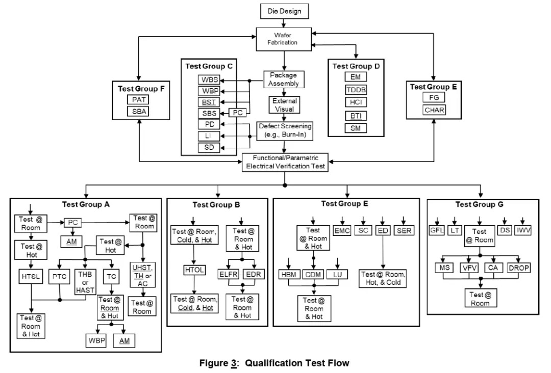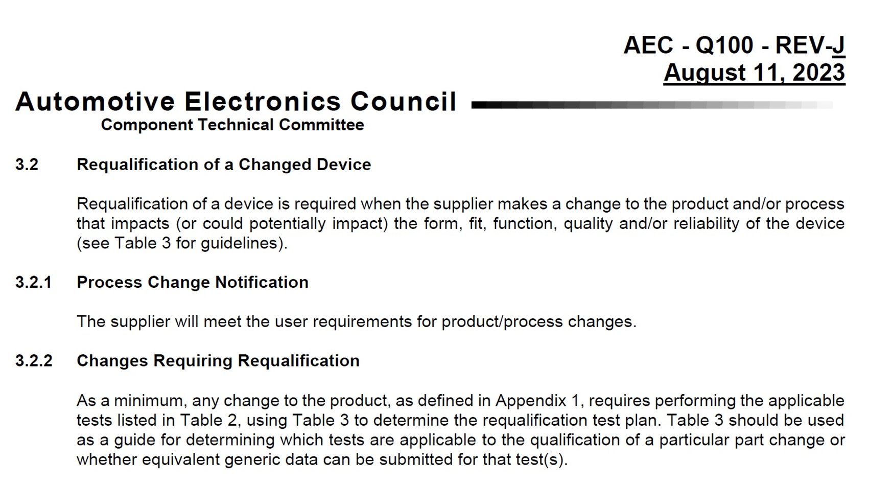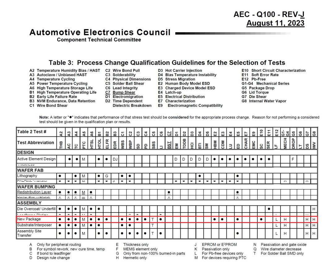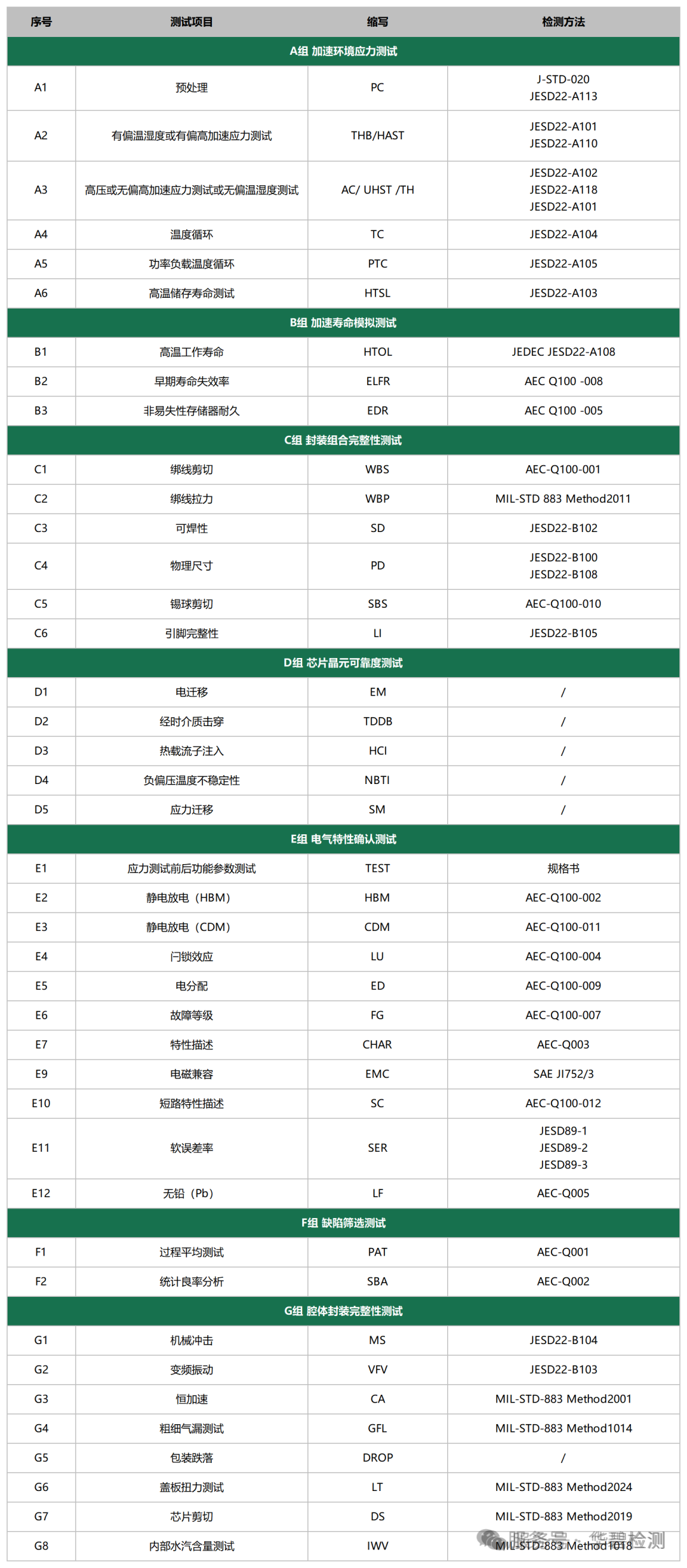 AEC-Q100的常见问题 Q.芯片参加 AEC-Q100 测试认证需要做哪些准备? 芯片需要确认以下信息: Wire Bonding及其材质 AEC-Q100标准中包含了与Wire Bonding相关的测试项(如WBS、WBP)。车规芯片内部是否存在Wire Bonding决定了是否需要执行这些测试项。此外,Wire Bonding的材质也至关重要,金线参考AEC Q100标准,而铜线(含铜)则在AEC- Q100的基础上增加了AEC-Q006的要求。 应用等级 车规芯片的应用等级根据其在汽车中使用的环境温度进行划分,等级从0(最高)到3(最低)。应用等级决定了测试认证时参考的具体测试条件。 湿度敏感等级(MSL) 湿度敏感等级(MSL)的选取应参考JESD22-A113/J-STD-020标准。车规芯片的湿度敏感等级最低要求为MSL 3。 点击查看大图 Q.每一款芯片都需要参加AEC-Q100的所有测试项吗? AEC-Q100 测试认证包含多个项目,但并非所有芯片都需要参加所有测试项,有些测试项是为特定类型的芯片“量身定制”的,例如: ●B3 EDR仅针对非易失性存储芯片/含非易失性存储模块的芯片 ●C5 SBS仅针对BGA封装芯片 ●E10 SC仅针对智能电源管理芯片 ●E11 SER仅适用于≥ 1Mbit的SRAM和DRAM ●G组测试仅针对内含空腔封装的产品 Q.如何判断一款芯片是否要做功率温度循环(Power Temperature Cycling, PTC)测试? PTC测试针对那些在预期应用中功率耗散反复变化≥1瓦特且功率上升时间<0.1秒而导致结温变化≥40ºC的芯片,如用于感应负载的智能功率开关。 Q.有哪些测试涉及到硬件/夹具制作? AEC-Q100标准中涉及硬件/夹具制作的主要有THB/HAST、PTC、HTOL、ELFR、EDR、ESD、EMC、MS、VFV等。 Q.静电放电测试(ESD)和闩锁测试(LU)要求是什么? ESD测试包括人体模型(HBM)和机器模型(CDM),针对不同类型和频率的芯片有不同的电压要求。LU测试则是针对信号Pin和电源Pin的过压测试。 Q.家族系列产品是否都需要通过完整的AEC Q100测试认证? 不需要。AEC-Q100提供了关于通用数据使用的指导原则,允许在系列中的一个代表产品成功完成资格认定后,通过关联性使系列内其他产品(除ESD、LU、ED)获得资格认定。只需根据系列内产品与代表产品的差异,依据AEC-Q100 Table 3(见下表)执行必要的补充测试即可。 点击查看大图 AEC-Q100 测试流程 下文将围绕AEC-Q100标准,简单介绍其测试流程,以及各个测试项的测试原理,旨在让读者了解各个测试项考核的内容以及大致的原理,具体的测试规范和方法将不在此展开深入介绍。 从Test Flow中可以看出,AEC-Q100测试项包含A/B/C/D/E/F/G共七组,各组测试项的考核侧重点不同,覆盖了从Wafer到封装后的产品。 E组实验项 D组实验项 C组实验项 F组实验项 E组实验项 A组实验项 B组实验项 G组实验项 车规芯片变更,如何通过AEC-Q100验证? AEC-Q100是汽车电子委员会(AEC)制定的一系列标准之一,专为汽车电子组件的质量认证而设计。当某款车规芯片发生变更时,此时需根据AEC-Q100 3.2.2的要求,执行必要的测试项目,以确保变更后的芯片能够满足车规要求。 ![]() 点击图片查看大图 变更项目验证流程 以ASSEMBLY中New Package为例: 按照标准要求,需要对以下22项(视芯片参数选取)进行测试并确保通过,从而证明芯片符合车规认证要求。 A组 (含PC) THB、AC、TC、PTC、HTSL B组 HTOL、ELFR C组 WBS、WBP、SD、PD、SBS、LI E组 HBM、CDM、ED、SC、LF G组 MECH、DS、IWV 点击图片查看大图 如果芯片的变更仅限于表面字符,那么仅需补测C组中的SD即可。对于其他类型的变更,以ASSEMBLY中Wire Bonding为例,则需要补测以下项目: A组 (含PC) THB、AC、TC、PTC、HTSL C组 WBS、WBP E组 ED、SC、LF G组 MECH 综上 变更验证的基本原则是清晰识别具体发生变更的内容,然后对照AEC-Q100标准中的测试项目表格,选定必要的补测项目并执行。只有当所有选定的测试项目都通过时,才能证明新样品符合车规认证。 华碧检测芯片测试能力及AEC-Q100整体技术要求 ![]() 华碧实验室是国内领先的集检测、鉴定、认证和研发为一体的第三方检测与分析的新型综合实验室,拥有丰富的车规级电子认证经验,已成功帮助300多家企业顺利通过AEC-Q系列认证,通过AEC-Q100对每一个芯片个案进行严格的质量与可靠度确认。 |