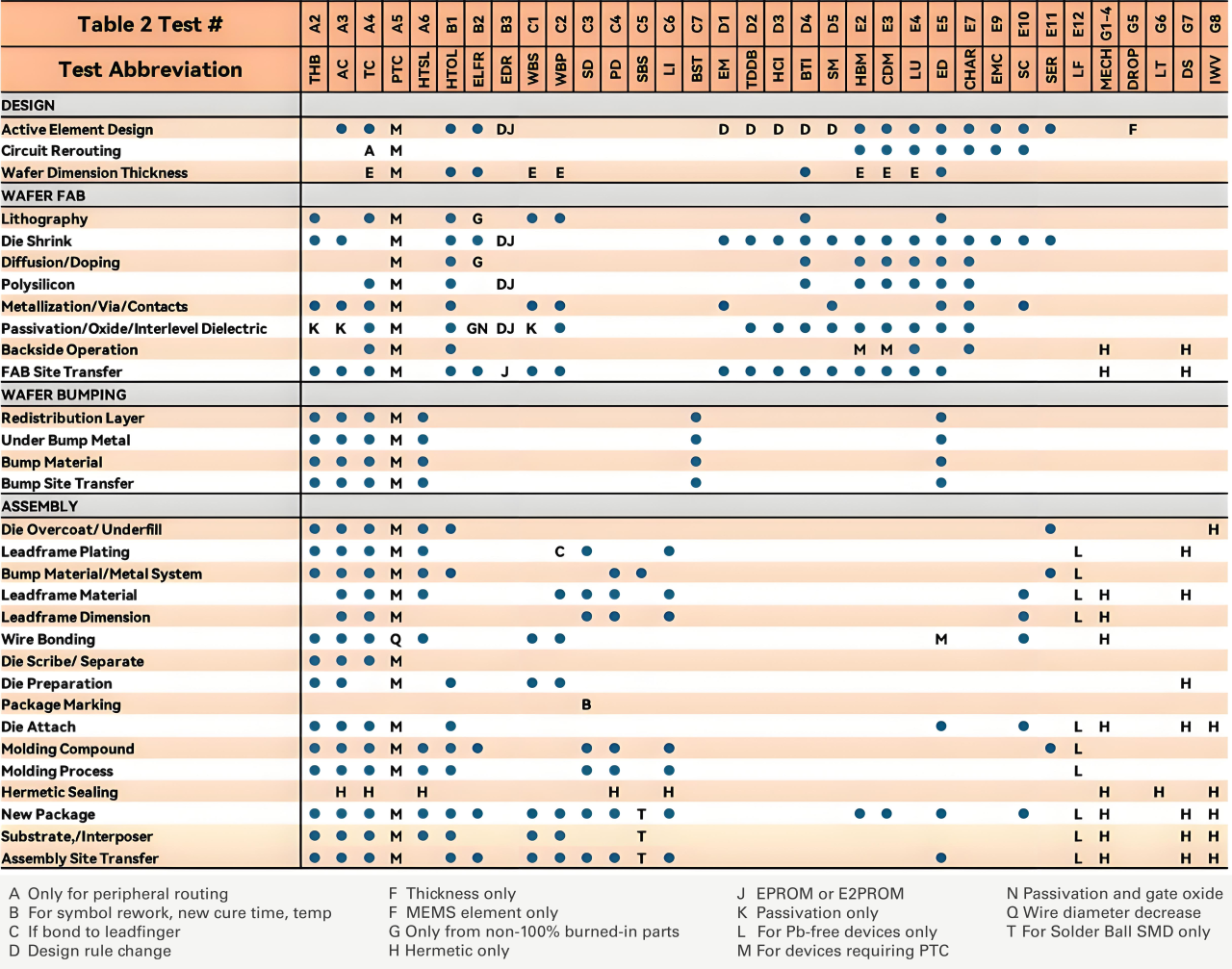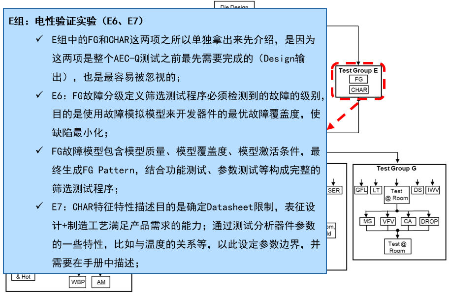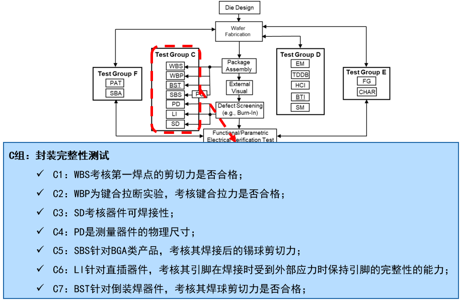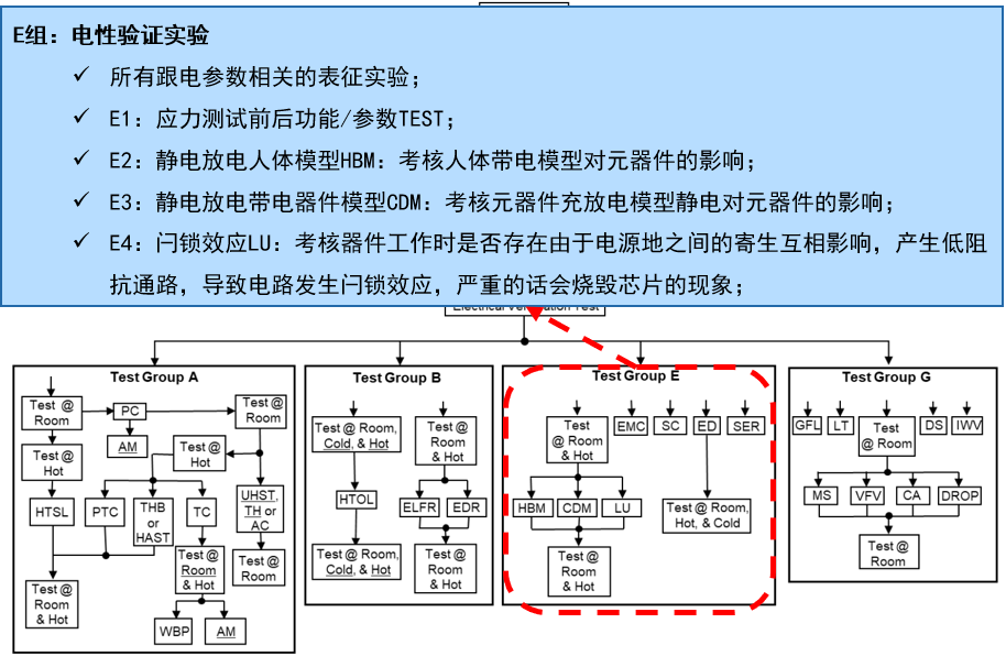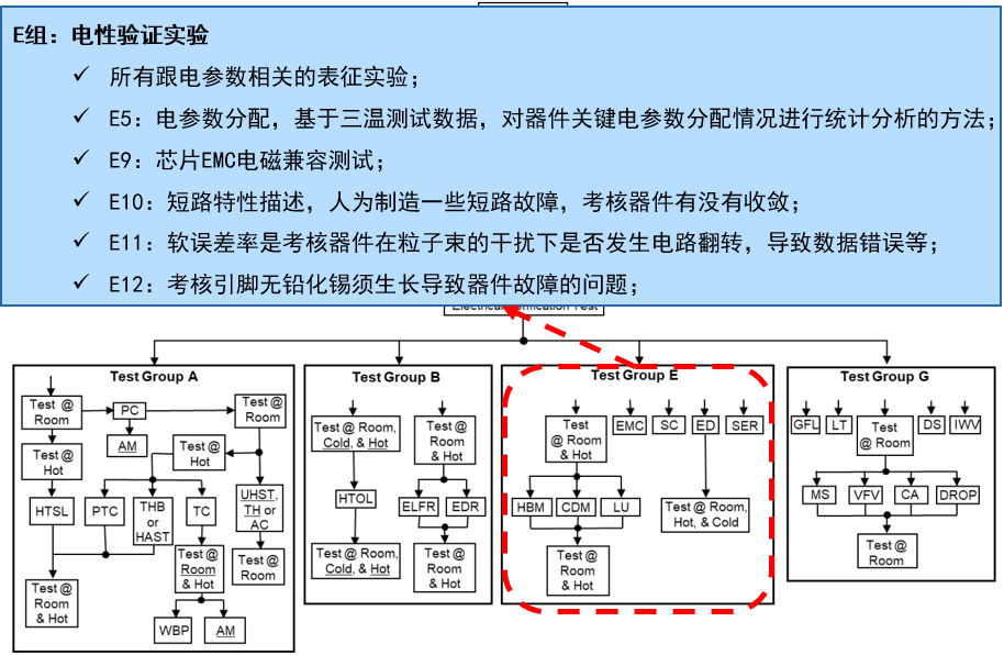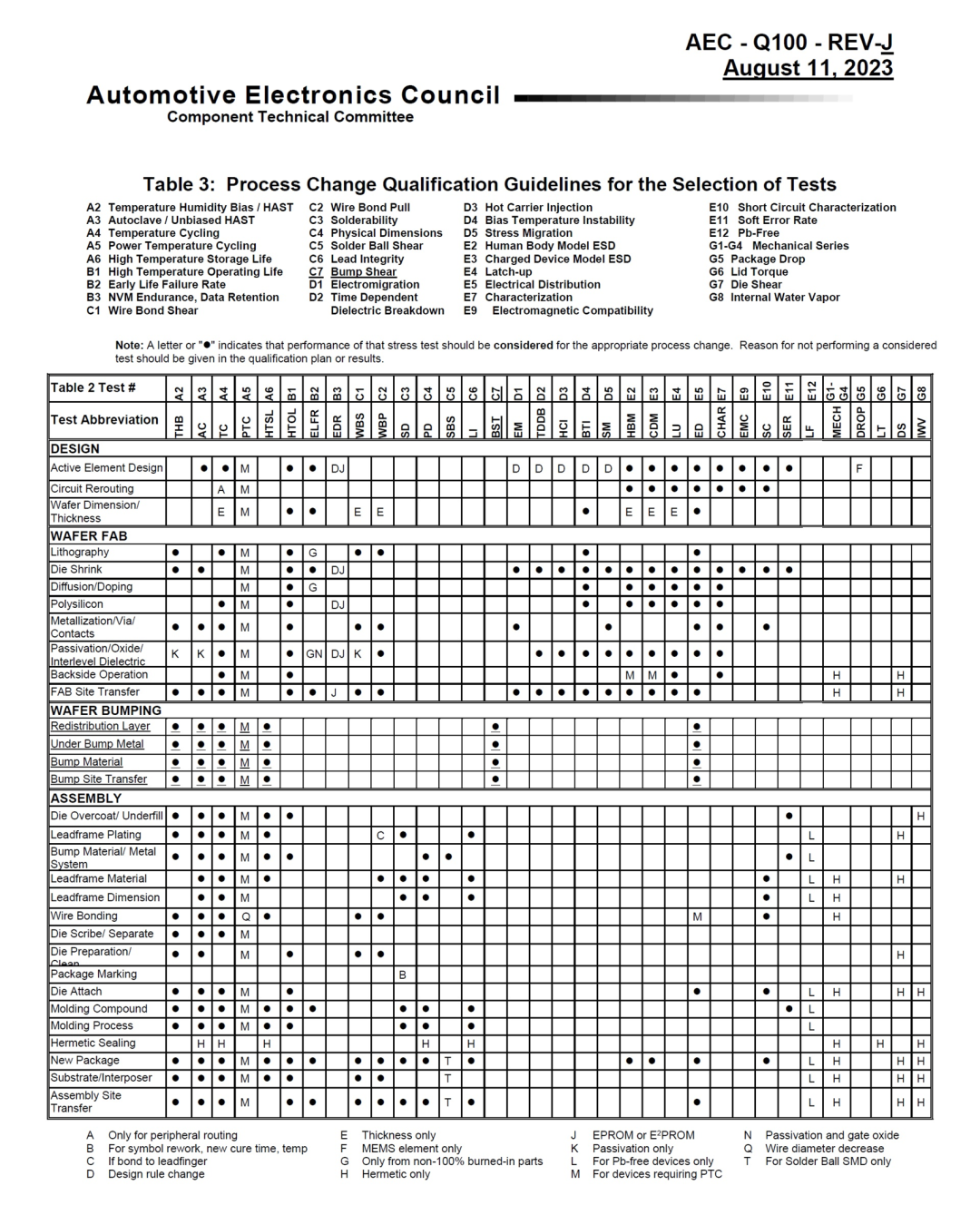 AEC-Q100的常见问题 Q.芯片参加 AEC-Q100 测试认证需要做哪些准备? 芯片需要确认以下信息: Wire Bonding及其材质 AEC-Q100标准中包含了与Wire Bonding相关的测试项(如WBS、WBP)。车规芯片内部是否存在Wire Bonding决定了是否需要执行这些测试项。此外,Wire Bonding的材质也至关重要,金线参考AEC Q100标准,而铜线(含铜)则在AEC- Q100的基础上增加了AEC-Q006的要求。 应用等级 车规芯片的应用等级根据其在汽车中使用的环境温度进行划分,等级从0(最高)到3(最低)。应用等级决定了测试认证时参考的具体测试条件。 湿度敏感等级(MSL) 湿度敏感等级(MSL)的选取应参考JESD22-A113/J-STD-020标准。车规芯片的湿度敏感等级最低要求为MSL 3。 点击查看大图 Q.每一款芯片都需要参加AEC-Q100的所有测试项吗? AEC-Q100 测试认证包含多个项目,但并非所有芯片都需要参加所有测试项,有些测试项是为特定类型的芯片“量身定制”的,例如: ●B3 EDR仅针对非易失性存储芯片/含非易失性存储模块的芯片 ●C5 SBS仅针对BGA封装芯片 ●E10 SC仅针对智能电源管理芯片 ●E11 SER仅适用于≥ 1Mbit的SRAM和DRAM ●G组测试仅针对内含空腔封装的产品 Q.如何判断一款芯片是否要做功率温度循环(Power Temperature Cycling, PTC)测试? PTC测试针对那些在预期应用中功率耗散反复变化≥1瓦特且功率上升时间<0.1秒而导致结温变化≥40ºC的芯片,如用于感应负载的智能功率开关。 Q.有哪些测试涉及到硬件/夹具制作? AEC-Q100标准中涉及硬件/夹具制作的主要有THB/HAST、PTC、HTOL、ELFR、EDR、ESD、EMC、MS、VFV等。 Q.静电放电测试(ESD)和闩锁测试(LU)要求是什么? ESD测试包括人体模型(HBM)和机器模型(CDM),针对不同类型和频率的芯片有不同的电压要求。LU测试则是针对信号Pin和电源Pin的过压测试。 Q.家族系列产品是否都需要通过完整的AEC Q100测试认证? 不需要。AEC-Q100提供了关于通用数据使用的指导原则,允许在系列中的一个代表产品成功完成资格认定后,通过关联性使系列内其他产品(除ESD、LU、ED)获得资格认定。只需根据系列内产品与代表产品的差异,依据AEC-Q100 Table 3(见下表)执行必要的补充测试即可。 点击查看大图 AEC-Q100 测试流程 下文将围绕AEC-Q100标准,简单介绍其测试流程,以及各个测试项的测试原理,旨在让读者了解各个测试项考核的内容以及大致的原理,具体的测试规范和方法将不在此展开深入介绍。 从Test Flow中可以看出,AEC-Q100测试项包含A/B/C/D/E/F/G共七组,各组测试项的考核侧重点不同,覆盖了从Wafer到封装后的产品。 E组实验项 D组实验项 C组实验项 F组实验项 E组实验项 A组实验项 B组实验项 G组实验项 车规芯片变更,如何通过AEC-Q100验证? AEC-Q100是汽车电子委员会(AEC)制定的一系列标准之一,专为汽车电子组件的质量认证而设计。当某款车规芯片发生变更时,此时需根据AEC-Q100 3.2.2的要求,执行必要的测试项目,以确保变更后的芯片能够满足车规要求。 ![]() 点击图片查看大图 变更项目验证流程 以ASSEMBLY中New Package为例: 按照标准要求,需要对以下22项(视芯片参数选取)进行测试并确保通过,从而证明芯片符合车规认证要求。 A组 (含PC) THB、AC、TC、PTC、HTSL B组 HTOL、ELFR C组 WBS、WBP、SD、PD、SBS、LI E组 HBM、CDM、ED、SC、LF G组 MECH、DS、IWV 点击图片查看大图 如果芯片的变更仅限于表面字符,那么仅需补测C组中的SD即可。对于其他类型的变更,以ASSEMBLY中Wire Bonding为例,则需要补测以下项目: A组 (含PC) THB、AC、TC、PTC、HTSL C组 WBS、WBP E组 ED、SC、LF G组 MECH 综上 变更验证的基本原则是清晰识别具体发生变更的内容,然后对照AEC-Q100标准中的测试项目表格,选定必要的补测项目并执行。只有当所有选定的测试项目都通过时,才能证明新样品符合车规认证。 华碧检测芯片测试能力及AEC-Q100整体技术要求 ![]() 华碧实验室是国内领先的集检测、鉴定、认证和研发为一体的第三方检测与分析的新型综合实验室,拥有丰富的车规级电子认证经验,已成功帮助300多家企业顺利通过AEC-Q系列认证,通过AEC-Q100对每一个芯片个案进行严格的质量与可靠度确认。 |