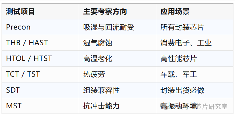 芯片为啥能用好几年?揭秘背后的“压力测试”在半导体产业链中,芯片从设计、制造到封装,每一步都至关重要。然而,即便芯片功能测试全部通过,也不能保证其在真实应用场景中长期稳定运行。因此,可靠性测试(Reliability Testing)成为芯片量产前不可或缺的一环。它不仅是质量的“试金石”,更是产品能否在市场立足的关键保障。 本文将系统梳理芯片可靠性测试的核心概念、常见项目及其意义,帮助读者快速掌握这一关键环节。 一、什么是芯片可靠性测试?可靠性,是指产品在规定条件下和规定时间内,持续完成规定功能的能力。对芯片而言,即在高温、高湿、温度变化、电压波动等复杂环境下,仍能保持性能稳定、不发生失效的能力。 可靠性测试的目的不是验证芯片“能不能用”,而是预测它“能用多久”。通过在实验室中模拟极端环境,加速芯片老化过程,提前暴露潜在缺陷,从而确保出厂芯片具备足够的寿命和稳定性。 简单来说: 功能测试是“今天能不能工作”, 可靠性测试是“未来几年还能不能持续稳定工作”。