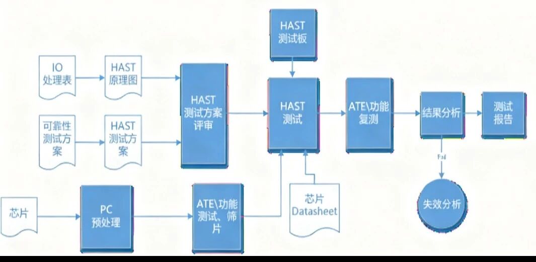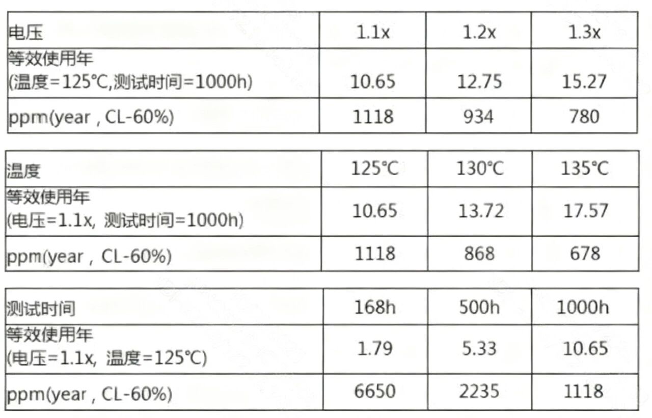 1. 前言 本次介绍上篇《芯片测试学习笔记》文章提到的可靠性测试项其中两项:HTOL和HAST测试。 2. HTOL(High Temperature Operation Life) HTOL测试是芯片电路可靠性的一项关键性的基础测试,采用应力加速的方式模拟芯片的长期运行,以此评估芯片寿命和长期上电运行的可靠性。 2.1 应力加速方式 电压拉偏 一般按1.1x电压设置,但可以设置更高的电压,说明如下: 推荐设置为“Maximum Operating Voltage”电压,一般超出正常电压5%~10%左右,该电压在Datasheet中有详细规定。 如果该电压下芯片结温达不到要求,则需要提高电压以满足老化加速条件,但是不能超过“Absolute Maximum Rated Voltage”,否则会对器件产生破坏性损伤。这两个电压参数芯片Datasheet一般都会给出。 温度拉偏 最低结温Tj要求125°℃,且结温不得高于150℃。 然而,对于没有集成内部温度传感器的IC,结温无法直接测量,需要用公式推算: Tj = Tc + θjc x P Tj:结温,Junction Temperature。 Tc:壳温,Case Temperature,封装外壳温度,可通过外部温度计测量 θjc:PN结-外壳的热阻,表征材料的导热性,芯片Datasheet会给出 P:芯片总功耗 2.2 老化寿命估算 2.3 行业标准 JESD22A108D Temperature, Bias, and Operating Life JESD47I Stress-Test-Driven Qualification of Integrated Circuits AEC - Q100 - REV-HFAILURE MECHANISM BASED STRESS TEST QUALIFICATION FOR INTEGRATED CIRCUITS 2.4 测试设备 2.5 样本数量 参考《JESD47I》标准,样本量按照LTPD抽样规则,要求如下: 样本量为3Lots/77units,即三个批次(批次间隔时间15天),每批次77个样本。 实际测试中,一般会用TT芯片做第一、第三批次测试,第二批用corner芯片。 2.6 Pattern/测试程序 芯片需要一直保持上电运行测试程序,所以对测试程序有一定要求。 通常是机台+Pattern的方式,租借第三方公司机台,自己开发Pattern。 还有一种简易方案:芯片直接运行HTOL测试程序,通过LED监控运行状态。 向量覆盖率要求: 1. logic电路:Scan ATPG的stuck-at fault coverage大于70%; 2. Memory BIST:覆盖所有memory; 3. CPU/DSP:Scan ATPG的stuck-at fault coverage大于70%; 4. 模拟电路:PLL/ADC/DAC/SERDES等关键IP。 2.7 测试过程 1. 初始测试(Initial Test)测试前对芯片进行全面的电气参数测试,记录初始状态作为基准; 2. 高温工作阶段将芯片放入高温箱,施加工作电压并运行测试向量; 3. 中间 / 终点测试(Interim/Final Test)测试结束后,将芯片恢复至常温,ATE复测与初始状态对比: · 若参数变化在允许范围内(波动≤10%),则通过测试; · 若出现功能失效、参数漂移超标(如漏电增大、时序异常),则判定为失效,需分析原因(如工艺缺陷、设计漏洞)。 2.8 经验笔记 1. 通常168h中途就会进行读点(168h是浴盆曲线的挂点),不需要等到1000h全部做完; 2. HTOL测试中途是可以停下来的,只要累计达1000h即可; 3. HTOL板子都是Socket,不能是贴片,同时要给芯片编号,因为还需要在ATE读点; 4. 需要多预留几个Socket和样片,高温老化环境可能会影响Socket可靠性; 5. 不同封装的芯片需要重做HTOL,报告不能复用; 6. 热阻是封装测试厂可提供的参数。 3. HAST测试(高加速应力测试) HAST高加速老化测试是主要用于评估在温湿环境下产品或者材料的可靠性,是通过在高度受控的压力容器内设定和创建温度、湿度、压力的各种条件来完成的。 这些条件加速了水分穿透外部保护性塑料包装并将这些应力条件施加到材料本体或者产品内部。 相对于传统的高温高湿测试,HAST增加了容器内的压力,使得可以实现超过100℃条件下的温湿度控制,能够加速温湿度的老化效果(如迁移腐蚀,绝缘劣化,材料老化等),大大缩短可靠性评估的测试周期,节约时间成本。 3.1 应力加速方式 · 电压拉偏 uHAST测试不带电压拉偏,不需要关注。 bHAST需要带电压拉偏,遵循以下原则: 1. 所有电源上电,电压:最大推荐操作范围电压(Maximum Recommended Operating Conditions); 2. 芯片功耗最小(数字部分不翻转、输入晶振短接、其他降功耗方法); 3. 输入管脚在输入电压允许范围内拉高。 温度拉偏 测试过程中,监控芯片壳温、功耗数据推算芯片结温,要保证结温不能过高,并在测试过程中定期记录。 如果壳温与环温差值或者功耗满足下表三种关系时,特别是当壳温与环温差值超过 10℃时,需考虑周期性的电压拉偏策略。 3.2 测试设备 3.3 样本数量 3.4 测试过程 与HTOL有个明显区别,HAST是不需要运行测试程序。 |