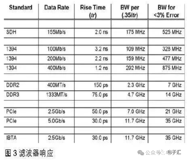 01理解示波器带宽---上升时间和信号保真度当示波器用户选择示波器进行关键的测量时,示波器的主要参数指标往往是选择哪一款示波器的唯一标准。示波器最主要的指标参数是: (1)带宽;(2)采样率;(3)记录长度。 带宽- 这个指标能告诉我们什么? 模拟带宽是一个测量指标,简单的定义是:示波器测得正弦波的幅度不低于真实正弦波信号3dB的幅度时的最高频率(参考IEEE-1057)。如图1,是一个理想的示波器带宽和幅度测量误差的曲线图,从图1可以看出,当被测正弦波的频率等于示波器的带宽(示波器的放大器的响应是一阶高斯型)时,幅度测量误差大约30%。如果想测量正弦波的幅度误差只有3%,被测正弦波的频率要比示波器的带宽要低很多(大约是示波器的带宽的0.3倍)。由于大多数信号是比正弦波复杂的多,使用示波器测量信号的通用法则是:示波器的带宽是被测信号的频率的5倍。 带宽- 不能告诉我们什么? 最典型的用户选择示波器显示和测量复杂的电和光信号,观测信号在示波器上幅度对时间的显示。模拟带宽,一个示波器重要的指标,它应该定义在频域,而不是在时域。根据采样理论,复杂的信号在频域包含丰富的频谱成分(包含多次正弦波的谐波成分),见图2.利用频谱分析,可以看到被采样信号的频率成分,然而,如果要充分描述这些频率成分的特点,就必须知道组成复杂信号的每个成分的准确幅度和相位信息。在这种情况下,带宽除了能够告诉将怎样捕获这些细节,其它什么也不能告诉我们。从带宽的测量角度,我们只知道,输入一个频率和带宽相同的正弦波,示波器的幅度测量误差为30%。 带宽和上升时间的关系是什么? 除了对通用的信号分析,大多数的工程师也有对时间测量感兴趣,如方波的上升时间和下降时间。因此,从指定的带宽可以评估示波器系统的上升时间,我们可以使用下面公式:tr= 0.35/BW(或0.42/BW);即: BW =0.35/tr(或0.42/tr)=5*Fclock(一般普通信号的tr=7%*T,其中:T=1/Fclock)。实际信号的带宽:信号谐波幅值将为0次波(基波)的70%(即下降3dB)时的谐波频率。 这里的0.35是示波器带宽和上升时间(一阶高斯模型的10%-90%上升时间)之间的比例系数,示波器的放大器大多数使用的是一阶高斯型RC低通滤波器的响应模型。使用这个公式很容易计算出 tr上升时间,但是,实际往往不是这样的。图3的表格给出了不同信号标准所需要的测量系统带宽的建议,建议的系统带宽能够保证上升时间或其它测量得到合理的测试精度。注意,仪器系统很多因素都会影响在示波器测试上升时间结果的精度,这些因素包括信号源,探头,以及示波器。图3表格是假设信号和示波器的测试系统都是一阶响应特性,但是在实际上,特别是今天的高速串行信号,这个假设与实际相差甚远。对于最大平坦包络延迟响应,示波器的带宽和上升时间的关系系数接近0.45。在图3中,可以看出上升时间和带宽比例系数的变化,20GHz 幅频响应模型也发生变化,从简单的一阶响应到32 阶响应。16 阶和32阶响应类似现在的高性能示波器的响应特性,这类高性能示波器的tr/BW 比例系数接近0.4或0.45。对于这样的比例系数,示波器的幅频响应从低频到示波器带宽截止频率的平坦度非常好。另外,如果仪器使用非常好的滤波器,那么它的幅度和相位都会得到较好的补偿,以便以最好的保真度捕获和分析复杂信号。什么是真正意义上最好的示波器?两台示波器具有相同带宽性能可以有不同的上升时间,以及不同的幅频响应和相位响应!因此,只有知道示波器的带宽,将无法可靠地知道其测量能力或其能够准确捕捉复杂信号(像高速串行数据流)的能力。同时,示波器的真实的上升时间和从示波器带宽计算出的上升时间结果是否一致值得商榷。要得到示波器真实上升时间和下降时间,唯一可靠的途径就是利用一个上升时间比示波器快的理想阶跃信号去测量。 02探头带宽和上升时间 带宽为了满足示波器探头设计要求,探头带宽是大频率范围。例如,一个100 MHz的示波器探头要求所测量的频率范围达到100MHz,探头能够捕捉信号在指定频率范围的变化。事实上,每个探头制造商认为,在最大指定的带宽,探头的频率响应是下降3dB。在频率超出了3dB点,信号幅度会大大衰减,测量结果可能是不可预测的。精确测量幅度的原则是:测量系统的带宽应是被测波形频率的3至5倍以上。这个建议可确保足够的带宽捕获非正弦波波形的高频率成分,如方波。例如,一个带宽是300MHz至500MHz测量系统,建议捕获100MHz的方波信号。 关于带宽见图1,随着频率的增加,信号的幅度衰减。同样地 如前所述,探头制造商指定带宽到3dB内的幅度损失对测试信号没有明显影响,在3dB外,随着高频成分的衰减,在方波信号的上升和下降边缘发生明显的变化。使用探头测试信号时,选择探头带宽应是被测信号频率的3 到5 倍以上 ,幅度误差从在3 dB 上的 30% 减少至约3%。 上升时间带宽描述了频域特性,但不提供完整的描绘探头,示波器是如何对时间复现复杂波形形状的。要充分理解其波形复现过程,阶跃响应是获取时域特性是必须的。时域特性通过探头的上升时间来表征,输入一个比测试系统快很多的阶跃信号来评估系统的阶跃响应,从而得到的上升时间。选用探头的规则,探头的上升时间应该比被测信号的上升时间快3至5倍。 示波器采样率 常见的数字存储示波的采样率单位是1GS/s,代表什么含义? 是每秒采
