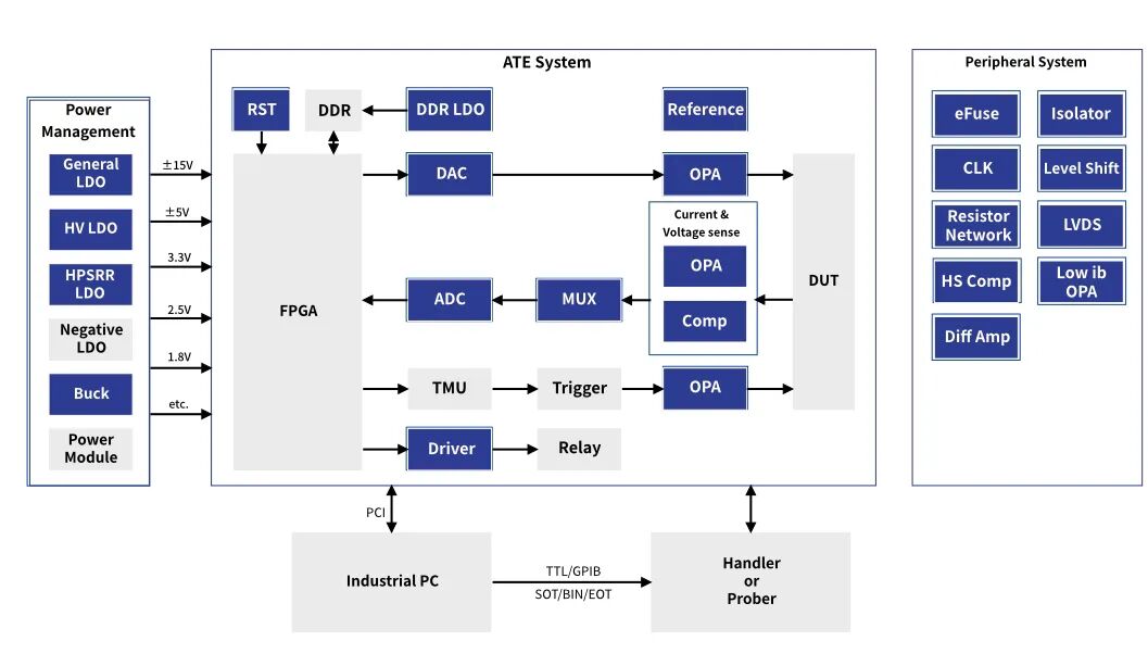 1 ATE设备概述自动测试设备(Automatic Test Equipment,简称ATE)是以计算机为核心的机电一体化测试系统,它通过集成数字万用表、示波器等测试仪器及专用软件平台,实现电子设备和工业产品性能验证、质量评估与故障隔离的自动化流程。在半导体产业中,ATE特指集成电路(IC)自动测试机,用于检测集成电路功能之完整性,成为集成电路生产制造之最后流程,对于确保集成电路产品质量具有不可替代的作用。 ATE系统采用可编程测试程序控制激励信号生成和数据采集分析,可完成集成电路、印刷电路板等被测对象的功能测试、参数验证及故障定位。根据国家军用标准要求,ATE需具备自检能力与标准化接口,其测试精度需高于被测装备,且校准过程遵循传递标准运行规范。这些特性使得ATE成为电子制造业中保证产品质量、降低生产成本的关键工具。 ATE设备的发展历程见证了电子产业的技术演进。从20世纪80年代的第一代基于GPIB总线的分立仪器组合,到2000年代基于PXI架构的模块化测试系统,再到2020年代的云原生智能测试平台,ATE系统始终与时俱进。 尤其是第三代ATE系统已集成智能云平台,支持跨操作系统软件开发,可满足5G通信、航空航天等行业复杂测试需求。现代ATE系统通过模块化架构实现多场景适配,在射频通信、半导体测试等领域展现出空间利用率提升80%、测试效率提高4倍的优势。 在半导体制造流程中,ATE应用于两个关键测试环节:晶圆测试(Wafer Test)和封装测试(Final Test)。晶圆测试是在芯片尚未被切割封装前,对仍在晶圆上的每个芯片进行基本功能测试,以识别并淘汰无效的芯片,避免不必要的封装成本。封装测试则是在芯片完成封装后,进行全面性能测试,确保产品符合设计规格要求。这两个测试环节共同构成了半导体产品出厂质量保证的双重防线。 2 ATE设备的核心功能与重要性 ATE设备在半导体制造过程中扮演着"质量守门员"的角色,其核心功能主要体现在三个方面:性能验证、质量评估与故障隔离。具体而言,ATE通过预编程的测试序列,自动向被测器件(DUT)施加输入信号,捕获并分析输出响应,进而判断器件功能是否正常、参数是否达标。这一过程不仅能够验证芯片的逻辑功能,还能测量其直流参数(如漏电流、驱动能力)和交流特性(如信号建立时间、时钟抖动参数),全面评估芯片的性能指标。 在故障检测与隔离方面,高性能ATE系统能够实现不低于98%的故障检测率和95%的故障隔离率,凭借高速DSP处理器与优化指令集,平均检测时间可控制在50毫秒以内。这种高效的故障定位能力对于复杂集成电路的调试与修复至关重要。案例显示,采用ATE检测智能手机主板可使故障定位时间从45分钟缩短至8分钟,维修效率提升82%。同时,ATE系统内置的自检程序每日执行校准验证,确保电压测量不确定度≤0.05%,保障了测试结果的准确性与可靠性。 ATE设备的经济价值在半导体产业中尤为突出。在芯片制造过程中,早期发现并淘汰缺陷产品可以避免后续不必要的加工成本。特别是对于高端芯片,封装成本可能占到总成本的20%-40%,通过晶圆测试有效筛选,能显著降低生产成本。同时,ATE的测试数据还为制造过程提供统计反馈,帮助厂商优化工艺参数,提高整体良率。据行业估计,测试成本约占芯片总生产成本的5%-10%,但通过有效测试节省的成本往往远高于这一比例。 随着芯片复杂度不断提升,ATE系统的测试挑战也日益增加。现代处理器芯片(如CPU、GPU和AI加速器)在1V电压下工作电流可能高达1000A,同时对噪声极为敏感,这要求ATE系统配备先进的供电网络(PDN)和低噪声测量能力。而5G射频芯片、混合信号SoC等新型器件,则要求ATE系统支持更广泛的信号频率和更复杂的测试协议,推动着ATE技术持续创新。 3 ATE设备的测试原理与技术架构 3.1 系统架构 ATE设备的硬件架构通常包含三大核心模块:控制器单元、激励测量模块和开关系统。控制器单元作为系统的大脑,通常运行Linux或Windows系统,通过GPIB、USB或以太网等接口协调各子系统工作。激励测量模块则集成数字衰减器(步进精度0.1dB)、矢量网络分析仪等高精度仪器,负责生成测试信号并测量响应。开关系统采用气动或机器人自动化技术构建测试路径,实现多通道快速切换,例如在射频组件测试中可自动完成81个S参数测试迭代,相较传统手动测试效率提升9倍。 现代ATE系统普遍采用模块化架构,如PXI(PCI eXtensions for Instrumentation)架构,使得系统能够根据测试需求灵活配置各种仪器模块。这种模块化设计显著提升了系统的适应性和可扩展性,允许测试工程师根据不同的测试任务(如数字测试、射频测试或混合信号测试)配置相应的硬件资源。模块化ATE系统的一个关键优势在于,测试仪器资源可以共享和重复利用,大幅降低了测试平台的总体拥有成本。 3.2 测试流程 ATE设备的测试流程可以概括为四个基本步骤:测试程序加载、信号激励施加、响应采集分析和结果判定输出。首先,测试程序通过控制器加载到ATE系统中,这些程序通常包含详细的测试序列、参数限值和故障处理程序。接着,ATE通过引脚电子电路向被测器件施加精确的电气信号激励。然后,系统采集被测器件的响应信号,并通过数字信号处理器(DSP)或专用算法进行数据分析。最后,系统根据预设的合格/不合格标准对器件进行分类,并生成测试报告。 为了提高测试效率,现代ATE采用并行测试技术,同时测