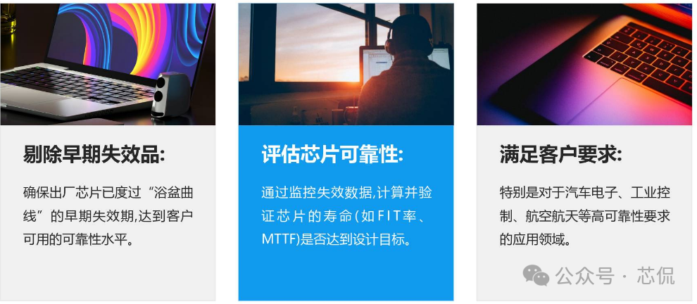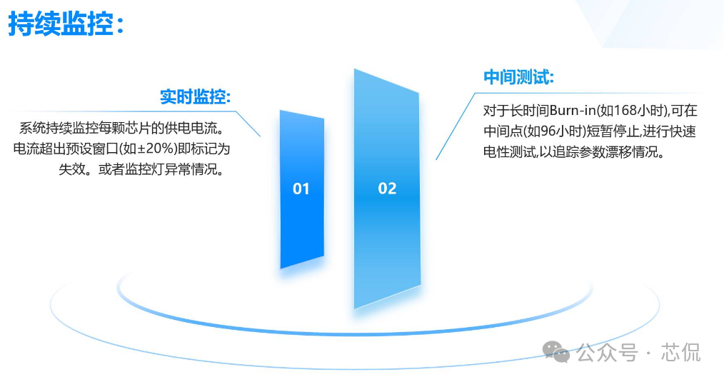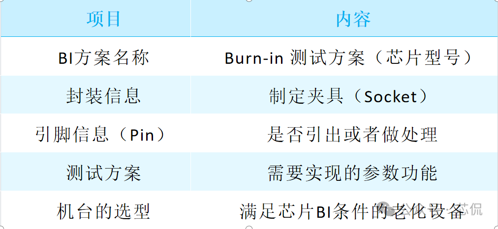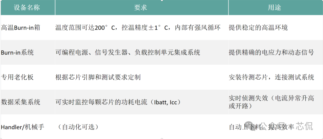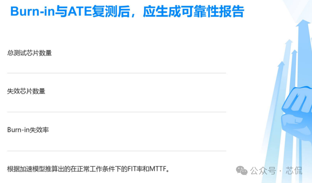 芯片产品中的Burn in 测试方案分如下几个步骤:一, Burn-in测试方案与流程 根据产品的特性与需求,制定一套完整的BI测试方案 实现芯片所需验证到的功能,主要方案需求如下: 主要流程: ![]() 二,测试目的 建立标准化的Burn-in测试流程,通过施加高温和偏压应力,加速芯片内部潜在的缺陷(如氧化层缺陷、金属电迁移、接触不良等)失效。 ![]() 三,老化炉选型与硬件开发 小功耗芯片,使用总体控制温度的老化箱即可。 大功耗芯片,需要进行独立温控,在最接近芯片的附近增加温度传感器与加热棒。方便时时调整芯片的温度,满足结温要求。对老化炉的选择更加多样性。可以是老化炉,也可以是敞开式的老化设备。 箱式老化设备图一 硬件开发流程与大致周期: ![]() 四,主要老化方案 静态Burn in 只给芯片施加额定电压偏置,但不提供动态信号。常见最大额定工作电压的1.1 ~ 1.2倍。芯片内部电路不进行开关操作(常见于军工级的一道老化测试流程)。 如: 额定电压为1.8V的芯片,可施加1.98V进行Burn-in。 ![]() 动态功耗第一,二项必备, 三四项根据产品要求可选。 五,设备要求 ![]() 六,测试流程 ![]() ![]() ![]() ![]() 七,判断失效标准 终点测试中失效:任何电参数(如漏电流、驱动能力、功能)超出初始测试的规格范围。与初始测试值相比,参数漂移超过规定的百分比(如超过50%) 外观检查失效:封装出现任何物理损伤。 失效分析:所有失效芯片必须进行失效分析,使用显微镜、X-Ray、开封,SEM/EDS等技术定位失效点,确定失效模式(EOS/ESD、工艺缺陷、设计缺陷等),并反馈给设计和工艺部门。 八,可靠性数据计算 ![]() 九,注意事项 芯片的Burn-in是一个高度专业化和标准化的过程,是确保芯片交付高可靠性的关键步骤。Burn in方案需根据芯片的工艺、设计和应用场景进行参数细化。 |