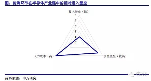 综合来看,在整个半导体产业链上,封测环节技术壁垒最低,中国厂商最易切入并追赶行业龙头企业;人力成本要求高,中国厂商相对于欧美厂商具有巨大的竞争优势;资本壁垒较高,这一点正好符合政府成立产业发展基金,通过直接的资金支持能够快速推动我国半导体封测产业高速发展。
