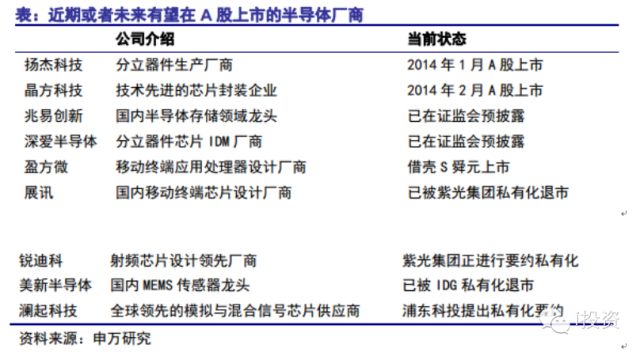 即将上市的公司有已经在证监会进行预披露的半导体公司兆易创新和深爱半导体,借壳S舜元的盈方微。未来,有望在A股上市的半导体公司,还有展讯、锐迪科、美新半导体、澜起科技等在美国进行私有化退市的公司。后续还将有越来越多的半导体优质公司上市。