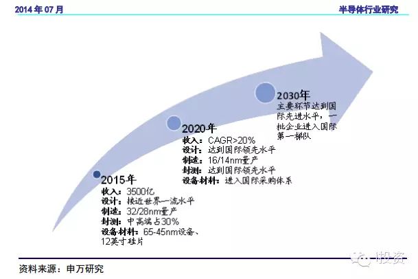 晶 圆制造环节,2015年实现32/28nm量产,2020年16/14nm量产,过去制造环节是国内集成电路发展最薄弱环节,本次《纲要》提出了具体发展 目标有利于产业链的均衡发展,利好国内集成电路全产业链。封装测试环节,2015年中高端占30%,2020年达到国际领先水平。