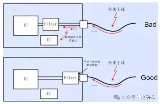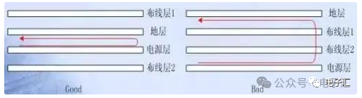 除了元器件的选择和电路设计之外,良好的印制电路板(PCB)设计在电磁兼容性中也是一个非常重要的因素。PCB EMC 设计的关键,是尽可能减小回流面积,让回流路径按照设计的方向流动。最常见返回电流问题来自于参考平面的裂缝、变换参考平面层、以及流经连接器的信号。 跨接电容器或是去耦合电容器可能可以解决一些问题,但是必需要考虑到电容器、过孔、焊盘以及布线的总体阻抗。 文章将从 PCB 的分层策略、布局技巧和布线规则三个方面,介绍 EMC 的 PCB 设计技术。 一、PCB 分层策略 电路板设计中厚度、过孔制程和电路板的层数不是解决问题的关键,优良的分层堆叠是保证电源汇流排的旁路和去耦、使电源层或接地层上的瞬态电压最小并将信号和电源的电磁场屏蔽起来的关键。 从信号走线来看,好的分层策略应该是把所有的信号走线放在一层或若干层,这些层紧挨著电源层或接地层。对於电源,好的分层策略应该是电源层与接地层相邻,且电源层与接地层的距离尽可能小,这就是我们所讲的“分层”策略。下面我们将具体谈谈优良的 PCB 分层策略。 1、布线层的投影平面应该在其回流平面层区域内。布线层如果不在其回流平面层地投影区域内,在布线时将会有信号线在投影区域外,导致“边缘辐射”问题,并且还会导致信号回路面积地增大,导致差模辐射增大。 2、尽量避免布线层相邻的设置。因为相邻布线层上的平行信号走线会导致信号串扰,所以如果无法避免布线层相邻,应该适当拉大两布线层之间的层间距,缩小布线层与其信号回路之间的层间距。|电子汇 3、相邻平面层应避免其投影平面重叠。因为投影重叠时,层与层之间的耦合电容会导致各层之间的噪声互相耦合。 二、多层板设计 时钟频率超过 5MHz,或信号上升时间小于 5ns 时,为了使信号回路面积能够得到很好的控制,一般需要使用多层板设计。在设计多层板时应注意如下几点原则: 1、关键布线层(时钟线、总线、接口信号线、射频线、复位信号线、片选信号线以及各种控制信号线等所在层)应与完整地平面相邻,优选两地平面之间,如图 1 所示。 图 1 关键布线层在两地平面之间 关键信号线一般都是强辐射或极其敏感的信号线,靠近地平面布线能够使其信号回路面积减小,减小其辐射强度或提高抗干扰能力。 2、电源平面应相对于其相邻地平面内缩(建议值 5H~20H)。电源平面相对于其回流地平面内缩可以有效抑制“边缘辐射”问题,如图 2 所示。 图 2 电源平面应相对于其相邻地平面内缩 此外,单板主工作电源平面(使用最广泛的电源平面)应与其地平面紧邻,以有效地减小电源电流的回路面积,如图 3 所示。 图 3 电源平面应与其地平面紧邻 3、单板 TOP、BOTTOM 层是否无≥50MHz 的信号线。如有,最好将高频信号走在两个平面层之间,以抑制其对空间的辐射。 三、单层板和双层板设计 对于单层板和双层板的设计,主要应注意关键信号线和电源线的设计。电源走线附近必须有地线与其紧邻、平行走线,以减小电源电流回路面积。 单层板的关键信号线两侧应该布“Guide Ground Line”,如图 4 所示。双层板的关键信号线地投影平面上应有大面积铺地,或者同单层板地处理办法,设计“Guide Ground Line”,如图 5 所示。关键信号线两侧地“保卫地线”一方面可以减小信号回路面积,另外,还可以防止信号线与其他信号线之间地串扰。 图 4 单层板的关键信号线两侧布“Guide Ground Line” 图 5 双层板的关键信号线地投影平面上大面积铺地 总的来说,PCB 板的分层可以依据下表来设计。 四、PCB 布局技巧 PCB 布局设计时,应充分遵守沿信号流向直线放置的设计原则,尽量避免来回环绕,如图 6 所示。这样可以避免信号直接耦合,影响信号质量。|电子汇 此外,为了防止电路之间、电子元器件之间的互相干扰和耦合,电路的放置和元器件的布局应遵从如下原则: 图 6 电路模块沿信号流向直线放置 1、单板上如果设计了接口“干净地”,则滤波、隔离器件应放置在“干净地”和工作地之间的隔离带上。这样可以避免滤波或隔离器件通过平面层互相耦合,削弱效果。此外,“干净地”上,除了滤波和防护器件之外,不能放置任何其他器件。 2、多种模块电路在同一 PCB 上放置时,数字电路与模拟电路、高速与低速电路应分开布局,以避免数字电路、模拟电路、高速电路以及低速电路之间的互相干扰。另外,当线路板上同时存在高、中、低速电路时,为了避免高频电路噪声通过接口向外辐射,应该遵从图 7 中的布局原则。 图 7 高、中、低速电路布局原则 3、线路板电源输入口的滤波电路应应靠近接口放置,避免已经经过了滤波的线路被再次耦合。 图 8 电源输入口的滤波电路应应靠近接口放置 4、接口电路的滤波、防护以及隔离器件靠近接口放置,如图 9 所示,可以有效的实现防护、滤波和隔离的效果。如果接口处既有滤波又有防护电路,应该遵从先防护后滤波的原则。因为防护电路是用来进行外来过压和过流抑制的,如果将防护电路放置在滤波电路之后,滤波电路会被过压和过流损坏。 此外,由于电路的输入输出走线相互耦合时会削弱滤波、隔离或防护效果,布局时要保证滤波电路(滤波器)、隔离以及防护电路的输入输出线不要相互耦合。 图 9 接口电路的滤波、防护以及隔离器件靠近接口放置 5、敏感电路或器件(如复位电路等)