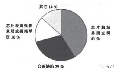 摘要:常用电路保护器件的主要失效模式为短路,瞬变电压抑制器(TvS)亦不例外。TvS 一旦发生短路失效,释放出的高能量常常会将保护的电子设备损坏.这是 TvS 生产厂家和使用方都想极力减少或避免的情况。通过对 TVS 筛选和使用短路失效样品进行解剖观察获得其失效部位的微观形貌特征.结合器件结构、材料、制造工艺、工作原理、筛选或使用时所受的应力等。采用理论分析和试验证明等方法分析导致7rvS 器件短路失效的原因。分析结果表明引发 TvS 短路失效的内在质量因素包括粘结界面空洞、台面缺陷、表面强耗尽层或强积累层、芯片裂纹和杂质扩散不均匀等。使用因素包括过电应力、高温和长时间使用耗损等。 1、引言 瞬变电压抑制器( TVS:Transient Voltage Suppressor)是为了解决电子设备电压瞬变和浪涌防护问题而设计出的一种高性能的电子电路保护器件,瞬变电压抑制二极管,主要用于对电路进行瞬态保护。当TVS 管两端经受瞬间的高能量冲击时,它能以极高的速度把两端间的阻抗变为低阻抗,吸收一个大电流,从而把它两端间的电压钳制在一个预订的数值上,保护后面的电路原件不因瞬态高电压冲击而损坏。国内外在电子产品和国内高可靠设备中的应用都十分普遍。随着TVS 使用范围和使用数量的增加,TVS 自身的可靠性备受关注,因为 TVS 可靠性不仅是 TVS 本身的问题,还关系到被保护电子电路的使用可靠性。研究 TVS 的可靠性须对 TVS 的失效模式和失效机理有深入的了解。文献表明 TVS 的失效模式有短路、开路和电特性退化。其中,短路失效最为常见,且对电路的影响最为严重。目前,国内对国产TVS 短路失效机理的研究缺乏深度,不够系统,因此,对国产 TVS 短路失效机理进行深入、系统的研究十分必要。 2、TVS 短路失效样品和失效分析程序在国内主要TVS 生产厂商的支持下,搜集了有关国产 TVS 筛选和使用中短路失效的样品和筛选应力条件或使用条件等失效数据,对这些样品进行电参数测试、开帽、去保护胶、管芯与电极分离、去焊料和显微观察等步骤,找出失效部位,分析引发TVS 短路失效的内在质量因素或使用因素,以及失效的发生过程。其中内在质量因素即与器件设计、材料、工艺、组装、封装相关的引起器件失效的因素;使用因素即除内在质量因素以外的引起器件失效的因素,通常与过电引力、静电放电、过载、错误使用等相关。 3、引发 TVS 短路失效的内在质量因素和失效机理 TVS 器件主要由芯片、电极系统和管壳3 部分构成。其中芯片是核心,通常在单晶硅片上采用扩散工艺形成。将扩散好的芯片经过腐蚀成台面状、芯片镀镍、烧焊、涂保护胶、封帽、点焊上引线、外引线镀锡等工序便完成TVS 器件的制造。如果 TVS 制造工艺过程中控制不良,则可能造成 TVS 器件的固有缺陷,使TVS 成品率和可靠性降低,在筛选或使用中容易失效。TVS 筛选短路失效样品分析和统计表明,TVS 引发筛选短路的内在质量因素有很多,各因素的比例如图 1 所示。这些因素也是使用中引发 TVS 短路失效的主要内在质量因素。 图 1-引发 TVS 筛选短路失效的内在质量因素分布 3.1 芯片粘结界面空洞 引发 TVS 短路的最典型的原因是管芯与内引线组件、底座铜片烧结不良,在烧结界面出现大面积空洞,如图2 所示。 空洞可能是由于焊料不均匀或粘结界面各层材料玷污、氧化使焊料沾润不良,造成烧焊时焊料与芯片或金属电极没有良好的熔合焊接引起的。空洞面积较大时,电流在烧结点附近汇聚,管芯散热困难,造成热电应力集中,产生局部热点,严重时引起热奔,使器件烧毁。对这些烧毁的器件进行解剖分析,可以看到有芯片局部较深的熔融;空洞面积较小时,可加速焊料热疲劳,使焊料层会产生疲劳龟裂,引起器件热阻增大,最终 导致器件过热烧毁。 3.2 台面缺陷 TVS 台面缺陷造成的失效常常是批次性的。TVS 制造工艺过程中造成芯片台面损 伤的原因主要有两个:a0 u/ E: A 1)芯片在酸蚀成型时,由于氢氟酸、硝酸混合液配方过浓或温度过高而反应剧烈 烧焊过后进行碱腐蚀清洗时,腐蚀液浓度过大、温度过高而造成碱腐蚀清洗过重。在显微镜下观察碱腐蚀清洗过重的台面,可以看到台面有类似被冲刷的痕迹,如图3 所示,这是因为硅片在(1,0, 0)晶向被碱腐蚀清洗试剂腐蚀的速率最快。) 3-碱腐蚀清洗过重的台面 台面缺陷或损伤的 TVS 器件经过温度循环和箝位冲击等筛选试验后,进行电参数测试时通常表现为短路或击穿特性异常,从而被剔除。但轻微台面损伤的TVS 器件在筛选后电参数测试时不易被发现,可能被列为良品出厂。这些 TVS 器件在使用过程中经受长时间热、电、机械等应力的作用后,台面缺陷加剧,在缺陷处形成载流子产生复合中心,使表面反向漏电流大大增加。大的表面反向漏电流使pn 结边缘温度升高,产生热电综合效应,最终导致 pn 结边缘半导体材料温度过高烧毁。 3.3 表面强积累层或强反型层 即便TVS 器件芯片台面完好,TVS 短路失效也容易发生在表面。这是由于晶体结构的周期性在表面上中断,加上半导体表面往往存在许多磨片、抛光、喷砂、切片等引起的晶格缺陷,吸附腐蚀时残留的化学品、气体或其它污染物,会使半导体表面带电。表面电荷被保护胶钝化,并吸附或排斥半导体体内的自由载流子,在pn 结边缘形成表面积累层、耗尽层或反型层等表面空间电荷层。在外加
