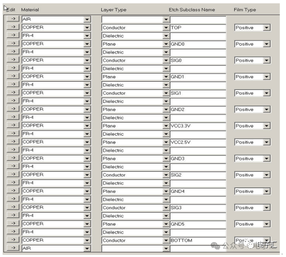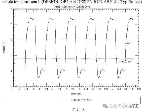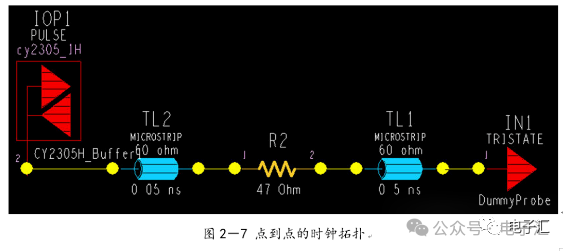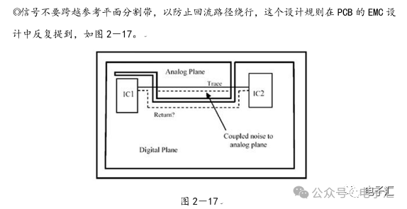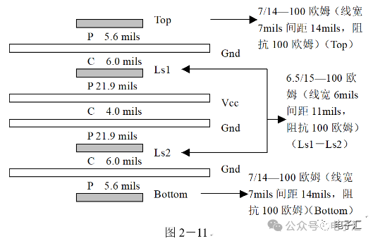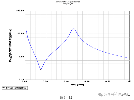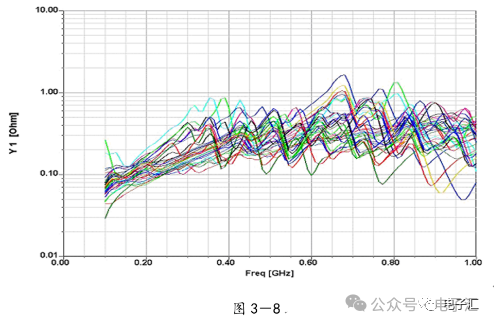 由上表的参数,得到如下的无引线电容的阻抗-频率曲线,如图1-9所示。 考虑引线与过孔的影响,可以推算出电容加上两端引线和过孔的阻抗-频率响应曲线,如图1-10所示: 图1-11反映了有引线/过孔的电容(绿色曲线)和无引线/过孔电容(红色曲线)的阻抗-频率特性的比较,可以看出电容的谐振点有向下漂移的趋势。 4、电源完整性分析软件对电容分布参数的计算: 使用SIWAVE也可以分析出电容的引线及过孔的电感对谐振点的影响,将上面的例子转换成siw文件,加入上述参数的电容(NPO 1000pf),设定PORT,得到如图1-12的阻抗-频率曲线。 从图1-12可以看出:SIWAVE计算阻抗时已经考虑了引线及过孔的影响,1000pf电容的谐振点已经由225MHz向下漂移到150MHz左右。 【仿真电容问题总结】 1) 电容的建模问题是PI仿真非常重要的一步,电容厂家很多,参数不一致,影响PI仿真结果的准确性。一般国内的电容厂家的ESL/ESR值很难提供,可以借助于仪器测量得到参数; 2) 在PCB上完成电容引线时,应该以最小ESL为原则,如:加粗引线,加大过孔等,尽量减小分布电感对谐振点的影响; 3) 可以适当采用电容组合; 4) 对高频段采用小电容要慎重,以防引线/过孔电感造成实际谐振点的向低漂移与产生新的谐振点(反谐振),高频段应该以改进与优化PCB设计为原则。 电源完整性分析与EMI控制 PCB板上存在有两个主要辐射源。第一是来自顶层和底层的传输线。假设这些线相对应的参考平面是理想的,那么它们的差模辐射是可以根据导线电流计算得到的。对于顶层和底层的传输线,尤其是时钟,应避免1/4波长的走线;第二个源就是边缘辐射。电磁场从激发区域经过电源地平面间传播到边缘,在那里产生辐射。平面上存在的任何过孔、不连续阻抗等,都将转变为电源/地噪声和边缘辐射,因此,边缘辐射直接和电源/地噪声和电源完整性相关。一块具有良好信号完整性的PCB很自然的具有较低的电源/地噪声和较低的边缘辐射。 下面结合高速PCB的SI和设计过程和本人在设计中积累的经验,介绍一些通用的设计规则和值得注意的设计要点: 1、信号的过冲与振铃: 信号质量是我们首要关注的问题,信号的过冲与振铃会带来一系列可靠性问题,在EMI的测试方面,数据/地址等信号线的过冲与振铃是辐射背景噪声的主要贡献者。 图2-1 解决信号过冲与振铃问题的主要手段是端接,选用适当的拓扑结构等。 在我们进行高速系统级仿真时,往往常常分析的问题是:当CPU通过总线,接插件,板间级连,PCB走线和多个对象通讯时,在不同对象个数、不同信号传输方向的情况下,系统的各个接收端波形会产生很大的差异,采用适当的端接策略可以解决这些SI问题, 下面举例说明: 图2-2是一个典型的CPU通过板级互连的点到多点拓扑结构图,在源端已经加匹配电阻端接,以下是CPU发送,IOP5接收,在不同负载的条件下,IOP5的接收波形,图2-3是IOP6不用,其余3个接收端使用的情况下,IOP5的接收波形,可以看出,接收端有明显的过冲。 解决的方法有:更改拓扑结构、调整PCB走线的线长,阻抗、更换器件、调整端接方案等。通过改变图2-2的拓扑结构的端接电阻的位置,得到拓扑结构图2-4,我们得到当IOP6不用,其余3个接收端使用的情况下,IOP5的接收波形,见图2-5。 比较图2-3和图2-5可以看出,信号的单调性(monotonic),过冲(Overshoot,undershoot)等方面已经得到了明显的改善,同时,时序的改善也是显而易见的。 2、时钟电路的处理 时钟电路的设计和EMI问题切切相关,高速PCB的时钟电路的设计必须遵循严格的设计原则保证SI和PI的要求,由于时钟的周期性,在远场表现为离散的频谱,EMI超标的部分往往是时钟或时钟的谐波,时钟对远场EMI的贡献如图2-6所示。 在高速PCB的时钟电路的设计中,建议遵循以下几个设计原则: ◎在点到点或点到多点的时钟电路设计中要做严格的SI分析确保时钟最小的过冲与最大噪声余量,时钟电路一般采用源端匹配和终端上下拉的方式匹配,如图2-7、图2-8、图2-9,串阻值可以在SQ中用扫描的方法获得,在保证时序空间有较大余量的前提下,可以调整串阻值将延适当变缓以减小EMI。 图2-9 点到多点不等长的时钟拓扑 ◎晶振的电源单独供电,通过磁珠加电容滤波电路,将时钟供电电源与VCC在PCB上隔开,如图2-10,供电电源由VCC经过磁珠Z6和电容C252(0.01u)和C253(1000pf)组成独立的电源滤波电路,同样的设计方法可以用于带PLL时钟分配器等电路。 ◎时钟线应尽量走线在内层并少打过孔,保证时钟与回流路径的最小面积。 3、合理的叠层设计 高速PCB的叠层设计在保证电源/地阻抗及EMI控制方面有较大影响,多层板的叠层设计在SI方面的设计指南中重点提及,可以参阅其它SI设计文档,这里举一例说明,如图2-11是一个常用的8层板叠层设计,图2-12是12层背板叠层设计图: 为保证电源完整性的要求,减小高速PCB的EMI,叠层设计一般遵循以下几个设计原则: ◎电源和地平面采用紧耦合,及电源平面紧贴地平面; ◎在线宽可以满足的条件下,信号线尽量与参考平面(一般是地)紧耦合; ◎尽量以地平面为参考平面。 4、控制信号线的回流路径 EMI取决于两个谐振回路,一个是“旁路环路”,由IC和旁路电容构成;另一个是“信号环路”,包括信号线在内。根据克希霍夫定律,任何时域信号由源到负载的传输都必须有一个最低阻抗的路径。图中I=I′,大小相等,方向相反。图中I我们称为信号电流, I′称为映象电流,如果信号