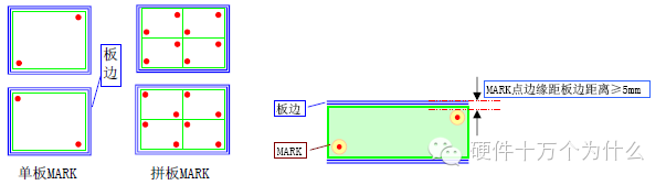 硬十 PCB生产中Mark点设计 1.pcb必须在板长边对角线上有一对应整板定位的Mark点,板上集成电路引脚中心距小于0.65mm的芯片需在集成电路长边对角线上有一对对应芯片定位的Mark点;pcb双面都有贴片件时,则pcb的两面都按此条加Mark点。 2.pcb边需留5mm工艺边(机器夹持PCB最小间距要求),同时应保证集成电路引脚中心距小于0.65mm的芯片要距离板边大于13mm(含工艺边);板四角用Ф5圆弧倒角。pcb应采用拼板方式,从目前pcb卷曲程度考虑,最佳拼接长度约为200mm,(设备加工尺寸:长度最大为330mm;宽度最大为250mm),在宽度方向尽量不拼板以防止在生产过程中弯曲。如下图: 3.MARK点作用及类别 Mark点也叫基准点,为装配工艺中的所有步骤提供共同的可测量点,保证了装配使用的每个设备能精确地定位电路图案。因此,Mark点对SMT生产至关重要 4.我部推荐的MARK点设计规范 1) 形状:建议Mark点标记为直径:R=1.0mm实心圆; 2) 组成一个完整的MARK点包括:标记点(或特征点)和空旷区域。 3) 位置:Mark点位于单板或拼板上的对角线相对位置且尽可能大的距离分开;最好分布在最长对角线位置(如MARK点位置图)。 4) 为保证贴装精度的要求,SMT要求:每块PCB内必须至少有一对符合设计要求的可供SMT机器识别的MARK点,同时必须有单板MARK(拼板时),拼板MARK或组合MARK只起辅助定位的作用。 5) 拼板时,每一单板的MARK点相对位置必须一样。不能因为任何原因而挪动拼板中任一单板上MARK点的位置,而导致各单板MARK点位置不对称; 6) PCB上所有MARK点只有满足:在同一对角线上且成对出现的两个MARK,方才有效。因此MARK点都必须成对出现,才能使用(MARK点位置图)。 7) MARK点(空旷区边缘)距离PCB边缘必须≥5.0mm(机器夹持PCB最小间距要求)(如MARK点位置图)。 (MARK点位置图) 8) 尺寸 A. Mark点标记最小的直径为1.0mm,最大直径是3.0mm,Mark点标记在同一块印制板上尺寸变化不能超过25 微米; B. 特别强调:同一板号PCB上所有Mark点的大小必须一致(包括不同厂家生产的同一板号的PCB); C. 建议将所有的Mark点标记直径统一设为1.0mm。 9) 空旷区要求 在Mark点标记周围,必须有一块没有其它电路特征或标记的空旷面积。空旷区圆半径 r≥2R , R为MARK点半径,r达到3R时,机器识别效果更好。 10) 材料 Mark点标记可以是裸铜、清澈的防氧化涂层保护的裸铜。如果使用阻焊(soldermask),不应该覆盖Mark点或其空旷区域 11) MARK点的光亮度应保持一致。 12) 平整度:Mark点标记的表面平整度应该在15 微米之内。 13) 对比度 A. 当Mark点标记与印制板的基质材料之间有高对比度时可达到最佳的识别性能 B. 对于所有Mark点的内层背景必须相同 以下在补点他人这方面的经验,作为参考 MARK点分类: 1)Mark点用于锡膏印刷和元件贴片时的光学定位。根据Mark点在PCB上的作用,可分为拼板Mark点、单板Mark点、局部Mark点(也称器件级MARK点), 2)拼板的工艺边上和不需拼板的单板上应至少有三个Mark点,呈L形分布,且对角Mark点关于中心不对称。 3)如果双面都有贴装元器件,则每一面都应该有Mark点。 4)需要拼板的单板上尽量有Mark点,如果没有放置Mark点的位置,在单板上可不放置Mark点。 5)引线中心距≤0.5 mm的QFP以及中心距≤0.8 mm的BGA等器件,应在通过该元件中心点对角线附近的对角设置局部Mark点,以便对其精确定位。 6)如果几个SOP器件比较靠近(≤100mm)形成阵列,可以把它们看作一个整体,在其对角位置设计两个局部Mark点。 设计说明和尺寸要求: 1)Mark点的形状是直径为1mm的实心圆,材料为铜,表面喷锡,需注意平整度,边缘光滑、齐整,颜色与周围的背景色有明显区别;阻焊开窗与Mark点同 心,对于拼板和单板直径为3mm,对于局部的Mark点直径为1mm, 2)单板上的Mark点,中心距板边不小于5mm;工艺边上的Mark点,中心距板边不小于3mm。 3)为了保证印刷和贴片的识别效果,Mark点范围内应无焊盘、过孔、测试点、走线及丝印标识等,不能被V-CUT槽所切造成机器无法辨识。 4)为了增加Mark点和基板之间的对比度,可以在Mark点下面敷设铜箔。同一板上的Mark点其内层背景要相同,即Mark点下有无铜箔应一致。 5)对于单板和拼板的Mark点应当作元件来设计,对于局部的Mark点应作为元件封装的一部分设计。便于赋予准确的坐标值进行定位。 PCB设计之光学基准点! 在有贴片元件的PCB板上,为了对PCB整板进行定位,通常需要在PCB板的四个角放置光学定位点,一般放三个即可。常见的基准点主要有三种:拼板基准点,单元基准点,局部基准点。 基准点结构 (1)拼板基准点和单元基准点 形状/大小:直径为40mil 的实心圆。阻焊开窗:和基准点同心的圆形,大小为基准点直径的两倍。在 2mm直径的边缘处要求有一圆形或八边形的铜线作保护圈用。同一板上的光学定位基准符号其内层背景要相同,即三个基准符号下有无铜箔应一致。 ![]() (2)局部基准点 间距≤0.4mm的QFP和间距≤0.8mm BGA、CSP、FC等器件需要放置局部基准点。 大小/形状:直径为40mil 的实心圆。 阻焊开窗:大小按普通焊盘处理,外圈铜环可不要。 基准点放置: 一般原则 : 过SMT设备加工的单板必须放置基准点。单面基准点数量≥3。 单面布局时,只需元件面放置基准点。. A5 I5 ^0 L- z1 m+ P PCB双面布局时,基准点双面放置。双面放置的基准点,除镜像拼板外,正反两面的基准点位置要求基本一致。见下图。 (1) 拼板的基准点放置 拼板需要放置拼板基准点、单元基准点。 拼板基准点和单元基准点