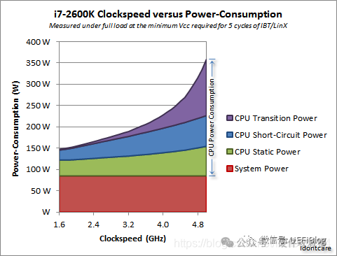 采取低电压是为了降低功耗。为什么CPU会发热 从含有1亿4000万个场效应晶体管FET的奔腾4到高达80多亿的Kabylake,Intel忠实的按照摩尔定律增加着晶体管的数目。这么多个FET随着每一次的翻转都在消耗者能量。一个FET的简单示意图如下: 当输入低电平时,CL被充电,我们假设a焦耳的电能被储存在电容中。而当输入变成高电平后,这些电能则被释放,a焦耳的能量被释放了出来。因为CL很小,这个a也十分的小,几乎可以忽略不计。但如果我们以1GHz频率翻转这个FET,则能量消耗就是a × 10^9,这就不能忽略了,再加上CPU中有几十亿个FET,消耗的能量变得相当可观。 实际上能耗和频率成线性相关。能耗关系公示是: P代表能耗。C可以简单看作一个常数,它由制程等因素决定,制程越小,C越小;V代表电压,和P是二次方的关系;而f就是频率了。理想情况,提高一倍频率,则能耗提高一倍。 通俗的讲,CPU可以看作由几十亿到上百亿个小开关组成的。开关切换的速度f决定了计算机的性能。为了高性能,必须提高开关速度f,这才是大家关心的。而V则因为省电的原因越小越好。那为什么不把V定成很低很低不到1V呢? 这里要引入门延迟(Gate Delay)的概念。简单来说,组成CPU的FET充放电需要一定时间,这个时间就是门延迟。只有在充放电完成后采样才能保证信号的完整性。而这个充放电时间和电压负相关,即电压高,则充放电时间就短。也和制程正相关,即制程越小,充放电时间就短。让我们去除制程的干扰因素,当我们不断提高频率f后,过了某个节点,太快的翻转会造成门延迟跟不上,从而影响数字信号的完整性,从而造成错误。这也是为什么超频到某个阶段会不稳定,随机出错的原因。那么怎么办呢?聪明的你也许想到了超频中常用的办法:加压。对了,可以通过提高电压来减小门延迟,让系统重新稳定下来。 也就是说,为了省电,要降低V,但为了达到数G的主频,而不得不提高电压V到一个可以接受的最小值,达到一个平衡。Vcore现在约1V。
