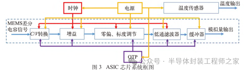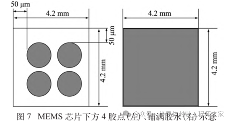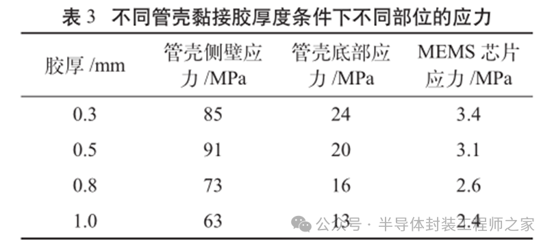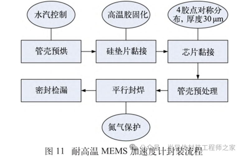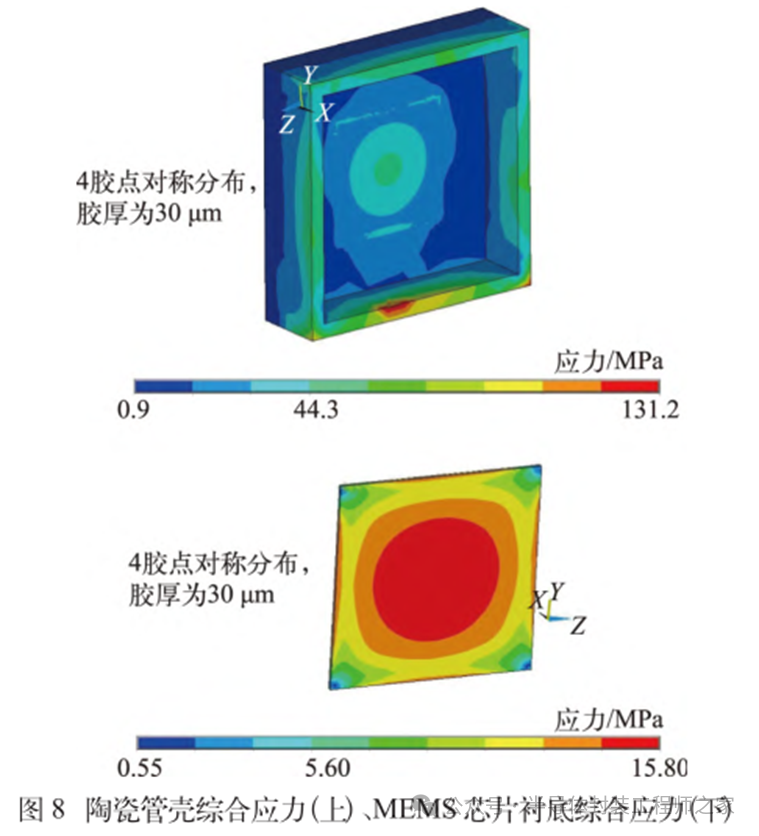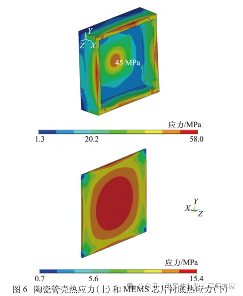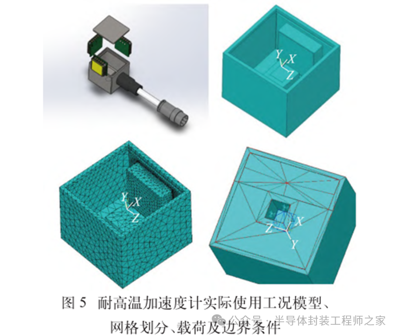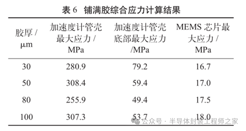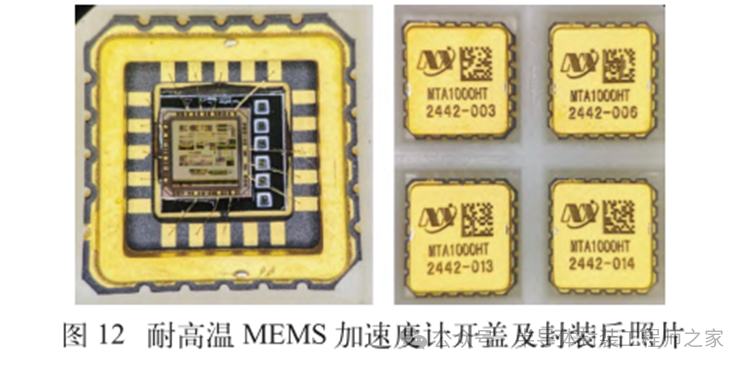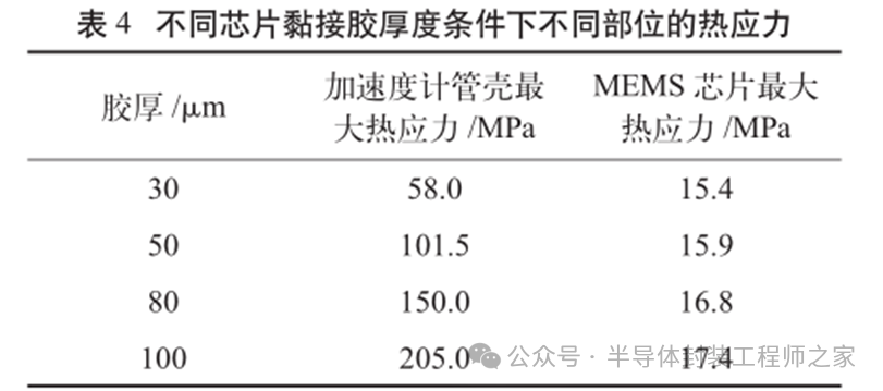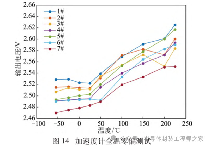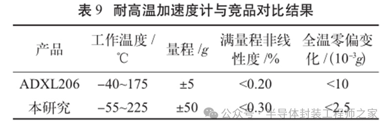 耐高温MEMS 加速度计设计及温度特性优化摘要: 利用高温 SOI ASIC 制造工艺和微机电系统 (MEMS) 技术,研制了更宽温区 (-55~225 ℃)的耐高温 MEMS 加速度计,拓宽了 MEMS 加速度计的使用范围。并对高温环境下的 MEMS 加速度计的温度特性进行研究。影响加速度计零偏温度系数的主要因素是应力,在应力过大的情况下,MEMS 加速度计的结构会发生形变,导致零位偏移、温度漂移过大。基于有限元分析,从高温加速度计封装入手,通过优化封装应力,提高 MEMS 加速度计的温度性能,将全温零偏变化量减小至0.002 5g 以内。加速度计量程达到了±50g,满量程线性度优于 0.3%,可以满足航空航天、石油钻井等各种复杂高温环境的应用要求。 0 引言 微机电系统(MEMS)是将机械、电子、光学及其他一些功能元件集成在单芯片或多个芯片上,能够对声、光、电、热、磁、运动等自然信息进行感知、识别、控制和处理的微型系统[1]。MEMS 加速度计具有成本低、体积小、可靠度高、易于批量生产等优点。常见的MEMS 加速度计工作温度为-55~85 ℃,无法满足更高温工作环境的应用需求。耐高温加速度计的典型应用环境包括钻井勘探、深井测振、航空航天等,部分装备的电子器件需要工作在超高温的环境中[2-5],工作温度至少为 200 ℃。目前国内耐高温类型的传感器主要为压力传感器,在航空、航天、国防、能源开发等领域有着广阔的应用需求。耐高温 MEMS 压力传感器主要以硅(Si)基压力传感器为主,利用绝缘体上硅(SOI)技术,实现耐高温加速度计的制作[6]。国外 AD 公司推出一款-40~175 ℃的耐高温 MEMS 加速度计 ADXL206,量程为±5g,其工作温度也未能达到上述航空航天等应用需求。本文针对耐高温 MEMS 加速度计展开研究,在完成其设计与加工的基础上,进一步提出了封装优化方案。高温加速度计的封装难点在于常规有机材料在超过 200 ℃的环境下易老化分解[7],导致可靠性显著下降。此外,在 MEMS 加速度计的生产加工过程中,材料性能易受工艺及外界条件影响,致使器件结构内部产生应力,最终影响加速度计全温区性能。而影响加速度计温度性能的主要因素是材料膨胀系数不匹配[7]和封装应力[8]。通过有限元分析手段[9],对高温加速度计的封装工艺进行了优化,尤其是芯片黏接胶的形貌和厚度等;对热应力和安装应力进行仿真分析,从而合理地控制、改善加速度计的温度特性。利用耐高温的陶瓷封装搭配平行缝焊的封装工艺,提高了耐高温加速度计的可靠性。 1 加速度计敏感结构及 ASIC 电路 1.1 MEMS 加速度计敏感结构 加速度计敏感结构模型如图 1 所示。开环工作方式下,支撑梁提供的弹性力与加速度产生的惯性力相平衡,平面运动的微机械加速度计的敏感结构可以等效为质量块-弹簧-阻尼二阶系统,XY 轴 MEMS 加速度计原理如图 2 所示,其动力学方程为 其中 M 为敏感结构的质量,D 为芯片内部封装气体阻尼系数,K 为弹簧刚度,x 为质量块相对于被测对象的位移,a 为被测对象的加速度。 ![]() 平面轴加速度计的检测电极采用变间隙电容形式,可以最大程度增加结构电容检测灵敏度。由于变间隙电容的尺寸比带梳齿结构的变面积电容小很多,在相同芯片面积条件下可以分布更多的电容对数。 变间隙差分电容检测灵敏度 ΔC 为 其中 A 为电容极板面积,ε 为介电常数,d0 为初始电容间隙,n 为检测电容对数。 加速 度 计设 计 量 程 覆 盖 5g~200g,本 文 以 50g为 例 进 行 阐 述 。满 量程 线 性 度 < 0.3 % ,结构 工作频 率 5500 Hz。 MEMS 芯片 结 构 主 要 参 数 如 表 1所示。 1.2 耐高温 ASIC 电路 基于高温 SOI 工艺平台完成了ASIC 电路设计及加工,该芯片能在-55~225 ℃高温环境中持续工作。图3 为 ASIC 芯片系统框图。 2 加速度计封装设计及优化 2.1 加速度计封装方案 耐高温加速度计采用陶瓷封装,如图 4 所示,MEMS 芯片 和 ASIC 芯片采用 叠 层 封装 ,MEMS 在下,ASIC 在上。MEMS与陶瓷管壳之间通过硅垫片过渡,可以提高两者的热膨胀系数匹配度。芯片黏接选择耐高温黏接胶。整个产品体系中,陶瓷管壳、黏接胶、键合金丝、MEMS 芯片、ASIC 芯片均采用耐高温设计,满足产品-55~225 ℃的温度使用范围要求。 ASIC 和 MEMS 芯片均 采 用 SOI 工 艺 ,能 满 足-55~225 ℃的工作温度范围。采用的某型号黏接胶玻璃化转变温度和工作温度均大于 250 ℃,因此在该封装体系中,高温加速度计的工作温度可以满足 225 ℃的要求。耐高温加速度计利用陶瓷管壳进行密封处理,内部填充高纯氮气,即使在 225 ℃的高温环境中,也能防止金属的氧化失效。 2.2 加速度计封装优化 加速度计是对应力敏感的器件,MEMS 的压力敏感结构为梳齿电容结构(见图 1),可动极板容易受到应力的影响产生变形,导致加速度计的电容发生变化,从而产生零偏变化。无论是外部的安装应力还是内部的热应力都会对 MEMS 敏感结构的电极施加应力,导致加速度计零偏变化。外部应力可通过金属壳体传递到加速度计陶瓷管壳上,再通过陶瓷管壳传递到内部的 MEMS 芯片上。加速度计本身的封装材料产生的热应力会直接作用到 MEMS 芯片上,使敏感结构产生变形,导致加速度计零偏变化,不同温度下的热应力变形反映到加速度计 指 标 上 即零偏变化量。 2.2.1 装配应力仿真 加速度计的工作温度高,需对加速度计的封装进行优化,利用有限元分析的手段,通过模拟不同的胶水形貌、胶水厚度,选择一种温度性能