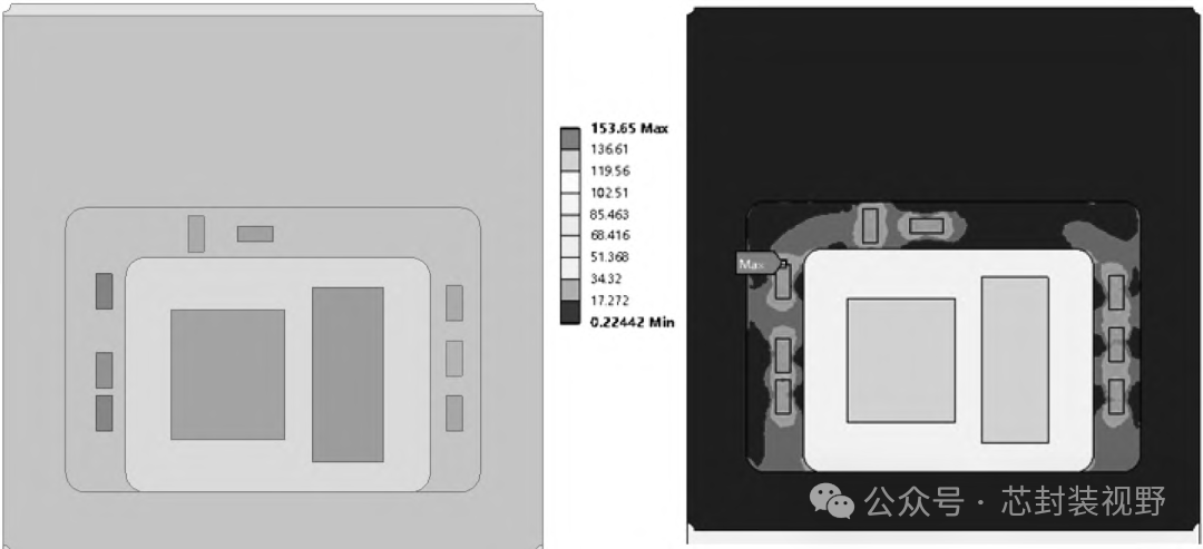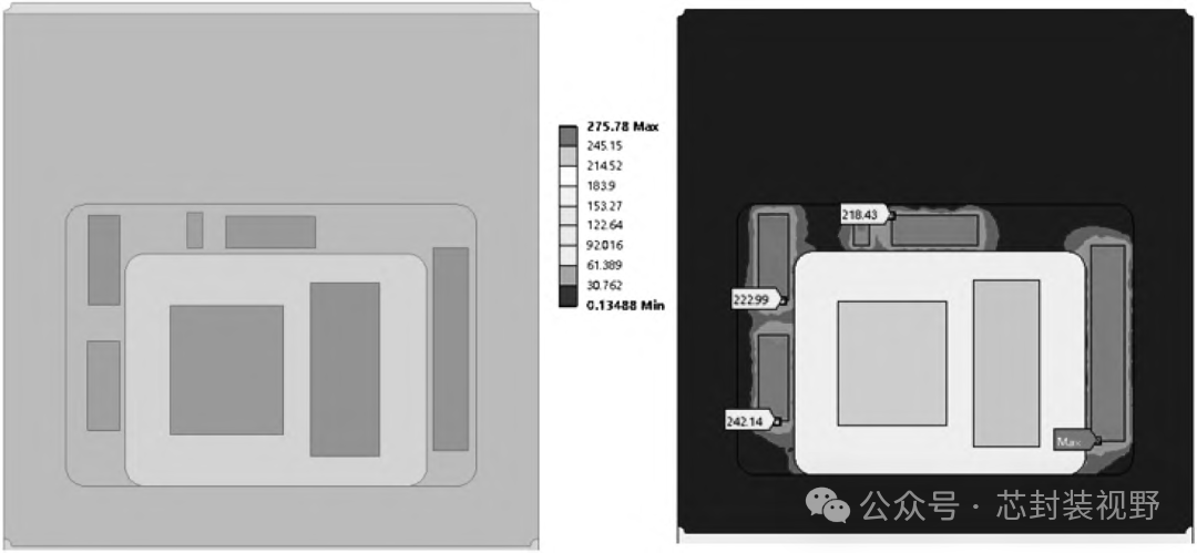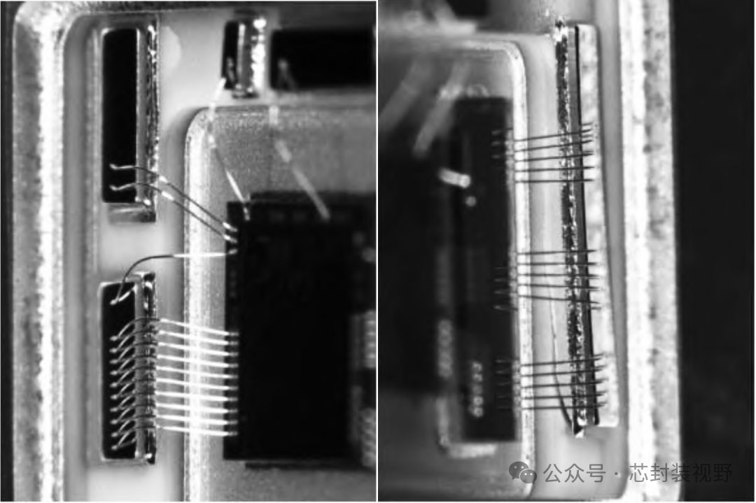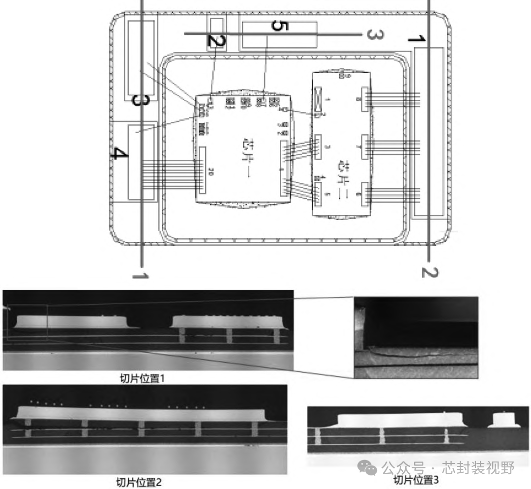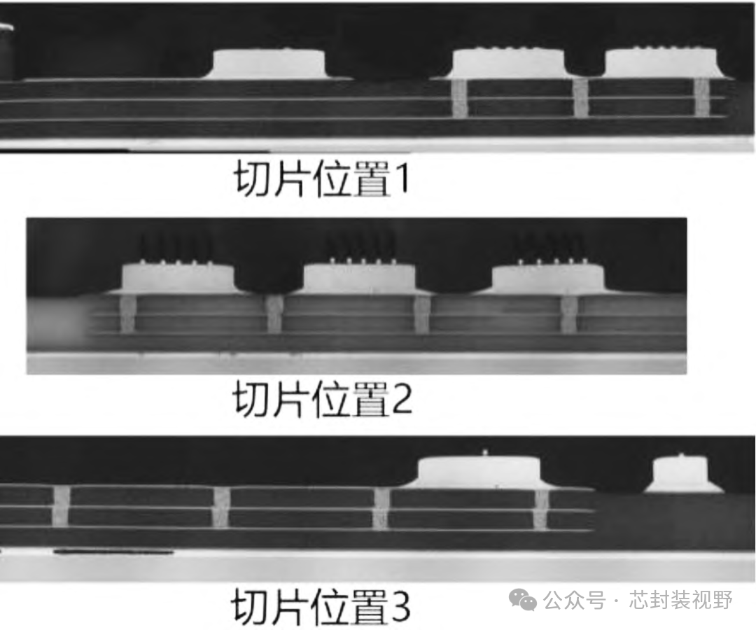 摘要随着深空探测、石油勘探、航空航天领域的极速发展,针对长期应用于200℃以上的高温封装器件需求日益倍增。本文提出了一种键合和指上安装过渡片并采用硅铝丝键合的陶瓷封装结构,规避了集成电路金铝(Au-Al)键合界面高温可靠性问题。同时开展了-65℃~250℃极限温度循环试验,针对过渡片与陶瓷外壳热膨胀系数(CTE)不匹配的问题,优化得到一种微型过渡片高温封装结构,实际产品在-65℃~250℃极限温度循环200次后功能正常,为高温封装产品可靠性设计提供了新的解决方案。 0 引言 在深空探测、超深井石油勘探及航空航天等极端环境中,电子器件需长时间承受超过200℃的高温环境。以深空探测为例,着陆器电源模块表面温度可高达200℃;而航空发动机舱内温度峰值突破250℃,传统封装器件在此严苛环境下,容易出现键合失效、材料退化等问题。同时目前军用级集成电路产品仅能承受-65℃~150℃温度循环的条件,已经无法满足未来高温应用的集成电路,故本文将对高温封装集成电路在-65℃~250℃的极限温度循环条件下的可靠性开展研究。 高温封装集成电路的难点主要在于键合界面的可靠性,由于传统集成电路焊盘(PAD)为Al材质,而陶瓷外壳键和指表面为Au材质,无论采用硅铝丝还是金丝,都不可避免的存在Au-Al键合体系。Au/Al界面在高温环境下会快速形成Au4Al、Au5Al2等脆性金属间化合物(IMC),引发柯肯达尔空洞并导致键合强度衰减,以及250℃下Au-Al之间IMC层厚度呈指数增长现象。本文采用键合和指上安装镍(Ni)镀层的过渡片,避免Au-Al键合界面的出现,并在温度循环试验中针对过渡片与陶瓷外壳CTE不匹配的问题,提出了一种微型过渡片封装结构,实际产品通过了-65℃~250℃200次温度循环,为高温封装可靠性设计提供新思路。 1 高温集成电路封装设计 某高温集成电路芯片采用高温绝缘体上硅技术(SOI)互补金属氧化物(CMOS)工艺设计,封装形式为TO-254(其外壳结构如图1所示)。内部包含2颗芯片,器件最大功耗为6W。为便于芯片在恶劣环境下的散热,封装外壳底部采用钼铜合金(MoCu30)热沉,经过布线设计的陶瓷基板通过银铜焊料钎焊在热沉上,陶瓷基板上方采用银铜焊料钎焊封口环用于平行缝焊,封口环材质为柯伐材质。 常规的高温导电胶无法承受250℃环境,因为金锡共晶合金(Au80Sn20)熔点在280℃,在250℃高温环境中较为稳定,同时金锡材料热导率较高,有助于芯片散热;故采用Au80Sn20作为芯片的装片材料。 图1 TO-254高温集成电路陶瓷外壳设计图 另外,由于芯片PAD材质为Al,陶瓷基板键合指采用厚金工艺,镀涂Ni(1.30-8.90)μm、Au(1.30-5.70)μm,无论采用Au丝还是Al丝键合工艺,都不可避免地存在Au-Al键合界面。鉴此,如图2所示,在键合指镀金层上方安装铜基过渡片,过渡片上下两面分别镀Ni和Au,过渡片采用Au80Sn20与键合指进行烧结,采用硅铝丝键合在Ni层上,避免封装中出现Au-Al键合的化合物生长问题。同时采用平行缝焊工艺,保障器件的可靠性与气密性。图3显示了芯片封装内部装片键合方案图,互联关系根据芯片设计要求进行引线键合。 图2 高温集成电路封装设计示意图 图3 封装内部装片键合图 2 温度循环失效分析 极限温度循环试验参考我国GJB548C-2021《微电子器件试验方法和程序》方法的1010.1温度循环试验条件(低温为-65℃,高温为250℃,转换时间1min,停留时间10min),对该产品进行温度循环试验后,产品电测试参数发现异常,经进一步分析定位为接地(GND)管脚开路。对产品进行开盖检查,发现与过渡片安装的键和指出现开裂(见图4)。 图4 键和指下方陶瓷开裂 为进一步明确失效原因,按照图5对开裂位置进行切片检查。 图5 失效电路切片检查结果 对失效电路进行切片,切片检查结果如图5所示,图5左侧为三次切片位置分布,右侧为每一次切片后的光学照片。从图中可以发现:5个位置的过渡片中除2号键和指位置未发现裂纹,其余位置均发现裂纹和陶瓷的剥离。1号、4号与5号键合指下方仍有部分过孔连接,而3号键和指仅通过表层金属连接到引脚,故测试结果出现了3号键和指与外部GND管脚开路。 原因分析:过渡片材质为铜,热膨胀系数为16PPM/℃、陶瓷基板热膨胀系数为7PPM/℃,在温度循环过程中,由于过渡片与下方陶瓷基板膨胀系数差异较大,热应力较大引发陶瓷开裂。 3 设计改进与验证 通过对现有封装结构建立三维模型,并进行有限元仿真分析,模拟极限温度循环条件。如图6所示,在键和指与过渡片接触位置的两端存在应力较大区域,过渡片3号、4号、5号最大应力范围在218MPa-242MPa;过渡片1号最大应力为275MPa,该处陶瓷开裂也是最严重的;过渡片2号尺寸为0.9mm*0.4mm*0.2mm,应力值为218.43MPa,应力值最低。 图6 温度循环仿真结果 由此说明,陶瓷键和指处热应力与过渡片的尺寸有关,设计改进措施为减小过渡片尺寸,同时为保障键合可行性,将原过渡片优化为微型过渡片(0.9mm*0.4mm*0.2mm),具体方案为原1号过渡片优化为3颗微型过渡片,原2号过渡片不做优化,原3号过渡片优化为1颗微型过渡片,原4号过渡片优化为2颗微型过渡片,原5号过渡片优化为1颗微型过渡片按照优化的设计方案,进行有限元仿真分析,结果显示,每一个过渡片与键合指连接位置的应力均在150MPa左右,其中最大值为153MPa,较改进前较小30%~40%。 图7 微型过渡片方案温度循环仿真结果 采用改进后的设计封装,对产品进行封装后开展-65℃~250℃200次极限温度循环试验,