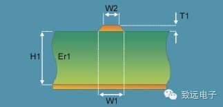 为什么要讲返回路径 我们为什么要讲返回路径,返回路径是信号传播的原动力,只有让返回路径畅通,信号传播途中才有电压差,才使信号向前走。所以返回路径是电子电路必不可少 的,是设计PCB特别是高速电路一定要考虑的,否则,就有串扰,反射,过冲,波形畸变等各种情况产生,电路工作不正常。返回路径就是参考面,参考平面是阻 抗的一大因子。 在下图中,是单端导线的截面图,阻抗与H1成正比,与Er成反比,与W1、W2、T1成反比,大家可以看出,W1,W2,T1是一个梯形面,这三个参数组 成的就是导体截面,实际阻抗与导线截面积成反比。也就是说,特性阻抗是与导体截面积、导体到参考平面的距离和导体到参考平面间介质的介电常数有关的。