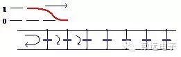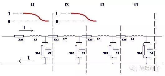 在上图里,以t1时间段来说,电阻Ra1的阻值很小,电感L1也很小,电容C1也很小,电阻Rb1很大。电信号从低电平变高电平高电平,它不是整条导线上 一下子就变为高电平了,而是像钱塘江大潮涨潮或波浪推进时,是有一个过程的。钱塘江大潮来后,就把江面从低水位变到高水位了,波浪是一个一个的来,就像高 频信号不停的传输。信号电场也如潮水一样,它是后面的推前边的,前面的继续向前。