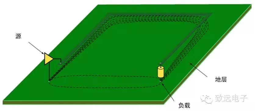 高速信号地回路路径 高速信号和低速信号不一样,它的波形一个接一个的,所以绝大部分返回电流从信号传播路径返回。