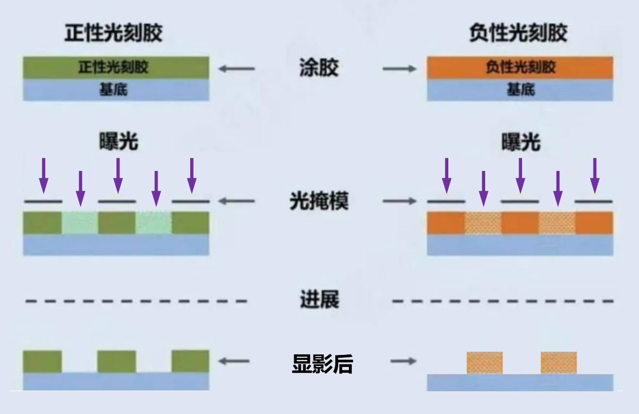 硅锭和晶圆 █ 氧化 首先,在切割和抛光后的晶圆上,我们要先做一层氧化。氧化的目的,是在脆弱的晶圆表面,形成一层保护膜(氧化层)。氧化层可以防止晶圆受到化学杂质、漏电流和刻蚀等影响。 ![]() ![]() 干法氧化,通过输入纯氧,使其在晶圆表面流动,从硅进行反应,形成二氧化硅层。湿法氧化,是同时使用氧气和高溶解度的水蒸气。 █ 光刻(涂胶、前烘、曝光、后烘、显影) 所谓“光刻”,其实简单来说,就是像印刷机一样,把芯片电路图给“刻”在晶圆上。 光刻可以分为涂胶、曝光、显影三个主要步骤。我们逐一来看。 首先,是涂胶。这个胶,叫做光刻胶,有时候也叫光阻,是一种光敏材料。 光刻胶有两种类型:正胶和负胶。 正胶,被特定的光束照射(曝光)之后,分子结构会发生变化,变得容易溶解。负胶,恰好相反,被照射之后,会变得难以溶解。大部分情况,用正胶。 ![]() 涂胶 掩模是一块带有不透明材料(如铬)图案层的玻璃或石英板。上面的图案,其实就是芯片的蓝图,也就是集成电路版图。 掩模 在光刻机中,晶圆和掩模都被精准固定。然后,光刻机的特殊光源(汞蒸气灯或准分子激光器)会发出光束(紫外线),光束会通过掩模版的镂空部分,以及多层透镜(将光进行汇聚),最终投射到晶圆的一小块面积上。 精细的电路图案,就这样“投影”在晶圆上。 以正性光刻胶为例,被照射位置的光刻胶,会变得容易溶解。未被照射的光刻胶,则毫发无损。 固定晶圆和掩模的机械位不停地移动,光束不停地照射。最终,在整个晶圆上,完成数十个至数百个芯片的电路“绘制”。 光刻机工作过程 硅片从光刻机出来后,还要经历一次加热烘焙的过程(120~180℃的环境下,烘焙20分钟),简称后烘。 后烘的目的,是让光刻胶中的光化学反应充分完成,弥补曝光强度不足的问题。同时,后烘还能减少光刻胶显影后,因为驻波效应产生的一圈圈纹路。 接下来,是显影。曝光之后,将晶圆浸泡在显影溶液中。显影溶液会去除被照射过的光刻胶(正胶),露出图案。 ![]() █ 刻蚀 好了,继续聊芯片制造流程。现在,图案虽然是显现出来了,但我们只是去掉了一部分的光刻胶。我们真正要去掉的,是下面的氧化层(未被光刻胶保护的那部分)。 也就是说,我们还要继续往下“挖洞”。这时要采用的工艺,就是刻蚀。刻蚀工艺分为湿法刻蚀和干法刻蚀两种。 湿法刻蚀,是将晶圆片浸入到含有特定化学剂的液体溶液中,利用化学反应来溶解掉未被光刻胶保护的半导体结构(氧化膜)。 干法刻蚀,是使用等离子体或者离子束等来对晶圆片进行轰击,将未被保护的半导体结构去除。 刻蚀工艺中,有两个概念需要关注。一是各向同性(各向异性),二是选择比。 如上图所示,湿法刻蚀的时候,会朝各个方向进行刻蚀,这就叫“各向同性”。而干法刻蚀,只朝垂直方向进行刻蚀,叫“各向异性”。显然后者更好。 刻蚀的时候,既刻蚀了氧化层,也刻蚀了光刻胶。在同一刻蚀条件下,光刻胶的刻蚀速率与被刻蚀材料(氧化层)的刻蚀速率之比,就是选择比。显然,我们需要尽可能少刻蚀光刻胶,多刻蚀氧化层。 █ 掺杂(离子注入) 好啦,“挖洞”的工艺,介绍完了。此时的晶圆表面,已经被刻出了各式各样的沟槽和图形。接下来,我们再来看看掺杂工艺。 之前介绍芯片基础知识(半导体芯片,到底是如何工作的?)的时候,小枣君提过,晶体管是芯片的基本组成单元。而每一个晶体管,都是基于PN结。如下图(MOSFET晶体管,NPN)所示,包括了P阱、N阱、沟道、栅极,等等。 前面的光刻和刻蚀,我们只是挖了洞。接下来,我们要基于这些洞,构造出P阱、N阱。纯硅本身是不导电的,我们需要让不导电的纯硅成为半导体,就必然需要向硅内掺入一些杂质(称为掺杂剂),改变它的电学特性。 例如,向硅材料内掺入磷、锑和砷,就可以得到N阱。掺入硼、铝、镓和铟,就可以得到P阱。 N是有自由电子的。P有很多空穴,也有少量的自由电子。通过在通道上加一个栅极,加一个电压,可以吸引P里面的电子,形成一个电子的通道(沟道)。在两个N加电压,NPN之间就形成了电流。 如下图所示: 图中,底下就是P阱衬底。两个洞是N阱。也就是说,做这个NPN晶体管时,在最开始氧化之前,就已经采用了离子注入,先把衬底做了硼元素(含少量磷元素)掺杂,变成了P阱衬底。(为了方便阅读,这个步骤我前面没讲。)现在,挖洞的部分,就可以做磷元素掺杂,变成N阱。大家看懂了没?掺杂的目的,就是创造PN结,创造晶体管。 掺杂,包括热扩散(Diffusion)和离子注入(Implant)两种工艺。因为热扩散工艺因其难以实现选择性扩散,所以,除特定需求之外,目前大部分都是使用离子注入工艺。 离子注入,就是用高能粒子束,将杂质直接射入到硅片中。 |