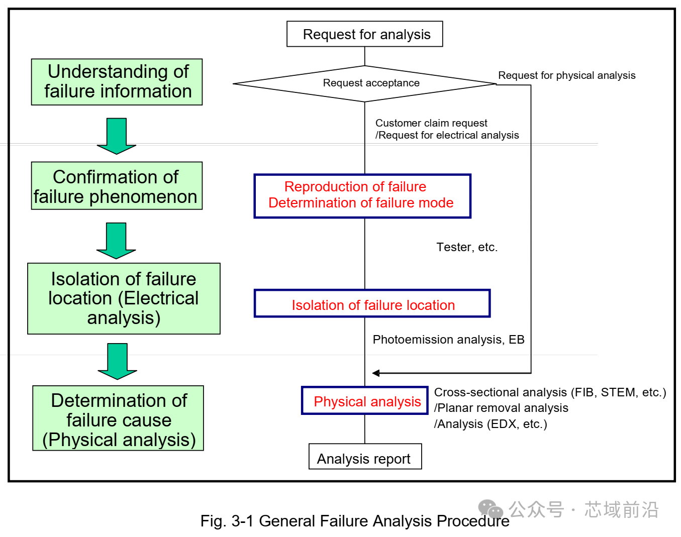 为什么先进芯片越难做,越离不开FA?半导体失效分析全景图 很多人第一次听到半导体失效分析FA(Failure Analysis),脑子里会自动浮现一个画面:工程师拿着工具,把坏芯片切开、磨开、看一看,然后找出哪里烧了、裂了、短了。 这个画面不算错,但只说对了最表层的一小部分。 真正的FA,更像一场“芯片法医”式破案。 它不是单纯证明“这颗芯片坏了”,而是要回答三个更难的问题: 坏在哪里、为什么会坏、怎样才能不再坏。 Intel 公开资料很早就指出,FA直接关系到产品量产爬坡、缺陷率和上市节奏; Sony 的失效分析资料则用一个非常形象的比喻来说明今天做FA有多难:在高集成芯片里,把失效位置缩到约1微米量级,难度就像在“一个棒球场大小、八层楼高的建筑里找一枚掉落的硬币”。 也正因为如此,FA从来不是“拿到坏样就上刀”。 相反,优秀的FA流程最看重两件事: 第一,尽量保留失效证据;第二,尽量在不破坏样品的情况下,把故障范围一步步缩小。 从收集失效背景、复现故障现象、判定失效模式,到电性定位、无损成像、局部开盖、逐层去层、截面观察、材料成分分析,最后再回到设计、工艺、封装、可靠性和测试环节去闭环,这才是现代半导体FA真正的样子。 文章篇幅原因,作者分享了几篇相关资料,感兴趣的小伙伴可以在公众号【芯域前沿】对话框输入:306,获取资料研读。一张表先看懂:FA到底在“干什么”