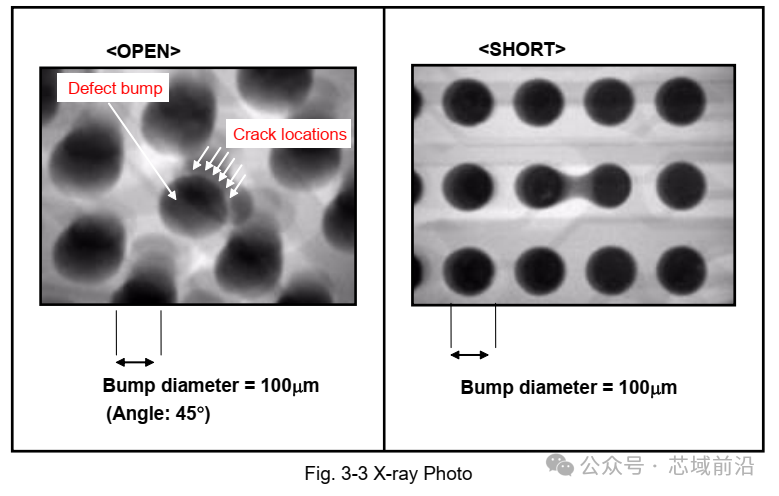 这张表综合了 Sony 的FA流程资料、SGS 的方法分类、Jim Colvin 的FA教程,以及 Thermo Fisher、Bruker 的器件分析资料。 ![]() 01FA不是“把芯片切开”,而是先把问题问对 一颗芯片失效,表面上可能只是“功耗偏高”“不启动”“某个接口失灵”或者“通过老化后突然漏电”。 但在FA工程师眼里,这些都只是外在表现。 真正重要的是:它是稳定漏电还是偶发异常,是热相关还是时序相关 ,是电压一升就坏还是特定工作模式才坏。 Jim Colvin 的教程里提到,I-V特性实际上是选择后续分析路线的重要依据:线性响应更适合热方法,非线性问题往往更容易在光发射类方法里出现信号。 也就是说,FA第一步不是“拆”,而是“先把故障性格摸清楚”。 Sony 给出的通用流程也非常典型:先理解失效信息,再确认并复现失效现象,接着判定失效模式,之后才进入失效位置隔离,最后再做物理分析并形成报告。 这个顺序看似啰嗦,其实非常关键——因为一旦你在没有定位的情况下盲目去层、抛光或切截面,等于在一个本来就极小的嫌疑区域里又主动“抹掉现场”。 FA最怕的,不是找不到,而是把本来能找到的证据亲手破坏掉。 ![]() 02先不拆:无损方法是FA里最像“医学影像科”的部分 现代FA的一个核心原则是: 能不破坏,就先不破坏。 因为封装一旦被打开、金属一旦被去掉、介质层一旦被刻蚀,原始失效状态就可能改变。所以很多分析会先从无损方法入手。 X-ray与3D XRM 最常见的一类是 X-ray(X射线)与 3D XRM(X-ray Microscopy,X射线显微成像)。 它们特别适合看封装级问题,比如焊线断裂、焊线偏移、焊点空洞、die attach(芯片贴装)异常、内部裂纹等。 Matsusada 的资料提到,在树脂封装后,细至20到30微米量级的焊线已经无法通过肉眼直接观察,只能依赖高分辨率X射线系统; ZEISS 的封装FA资料则说明,3D X-ray可以把一系列二维投影重建成三维体数据,实现数字化“虚拟切片”,在不真正切开器件的情况下查看内部结构。 C-SAM 第二类是 C-SAM(Confocal Scanning Acoustic Microscopy,共焦扫描声学显微镜)。 如果说 X-ray 更像“透视骨骼”,那 C-SAM 更像在找“层间脱粘”。 它利用声波在不同材料界面的反射差异,去识别封装内部的分层、空洞、die crack(芯片裂纹)、underfill(底部填充)空洞、bump(凸点)异常等问题。 Sage 的说明很直接:C-SAM 是一种非破坏、非侵入式方法,尤其适合在进入破坏性步骤之前,先确认这些界面缺陷是否原本就存在。 对封装分析来说,这一步很重要,因为它可以帮助区分“产品本来就坏了”与“样品在后续处理里被弄坏了”。 LIT 第三类是LIT(Lock-In Thermography,锁相热成像)。 Fraunhofer IISB 的资料显示,它通过给被测器件施加周期性激励,再用红外相机测量热响应的幅值和相位图,从而锁定电活性缺陷产生的热点。 短路、ESD(Electrostatic Discharge,静电放电)损伤、氧化层损伤、边缘终端缺陷、导电污染等,都可能在热图里露出马脚。 它的强项不是“看见金属长什么样”,而是“告诉你哪里在异常耗能”。在很多案例里,这一步恰恰是后续FIB截面的导航图。 ![]() 03给芯片“通上电”追凶:EFA是把坏点缩到足够小的关键一步 如果无损方法解决的是“里面可能哪里有问题”,那么 EFA(Electrical Failure Analysis,电性失效分析)解决的就是“哪一块区域真的在电学上不正常”。 EMMI 其中最经典的方法之一,是 EMMI(Emission Microscope,发光显微镜), 也常被称作 PEM(Photon Emission Microscopy,光子发射显微镜)。 它的原理并不神秘:当器件内部某些缺陷区域在偏压下发生电子—空穴复合、结击穿或局部高场效应时,会发出极其微弱的光; EMMI 用高灵敏度探测器把这种“失效微光”抓出来,再叠加到版图或显微图上,工程师就能看到热点在哪里。 iST 和 MA-tek 的公开说明都指出,EMMI 对 gate oxide(栅氧)缺陷、ESD失效、latch-up(闩锁)、junction leakage(结漏电)等特别有用,但对纯欧姆短路、金属短路,或者被大面积金属遮挡的埋藏点,效果可能有限。 OBIRCH 另一把“电学手电筒”是 OBIRCH(Optical Beam Induced Resistance Change,光束诱导电阻变化)。 iST 的定义非常清楚:它在器件功能测试期间,用激光从正面或背面扫描芯片,激光造成的局部温升会让异常区域的电阻变化比正常区域更明显,系统再把这种变化转成图像,定位可疑缺陷。 说得更直白一点,EMMI擅长“找会发光的异常”,OBIRCH更擅长“找受热后电阻反应异常的地方”。 很多不太发光、但有局部高阻、微短、漏电路径的故障,用 OBIRCH 反而更容易抓住。 为什么很多先进器件喜欢从背面做这些分析? Springer 的经典章节给了答案: 硅对红外光有相对透明性 ,因此背面访问在不少情况下更容易接近电活性区域,尤其当正面被多层金属和复杂互连遮挡时,这一点格外重要。 也正因为工艺越来越先进、金属层越来越复杂,背面分析的重要性这几年只会越来越高,不会下降。 ![]() 04真正剖开真相:PFA的本质,是把“怀疑”变成“证据” 当故障位置已经被缩小到足够小的范围,PFA(Physical Failure Analysis,物理失效分析)才真正登场。 这个阶段才是很多人想象中的“把芯片拆开看”。 但严格来说,它不是粗暴拆解,而是 带着定位信息的精密手术 。 开盖与逐层去层 PFA通常从 decap(开盖)开始。 Sony 的资料提到,针对常见树脂封装,基本思路是通过化学方法去除封装树脂,暴露芯片表面。 拿到芯片表面后,很多故障还看不见,因为真正的问题可能