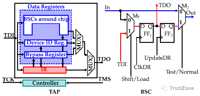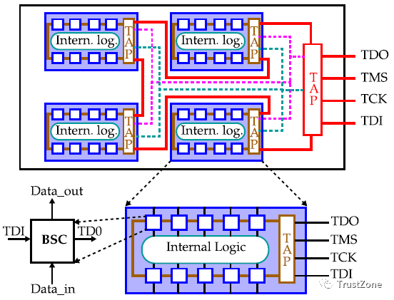 这个寄存器中的每个单元都位于设备的边界上,位于它的核心逻辑和与板卡相连的针脚之间——所以JTAG测试也被称为边界扫描。