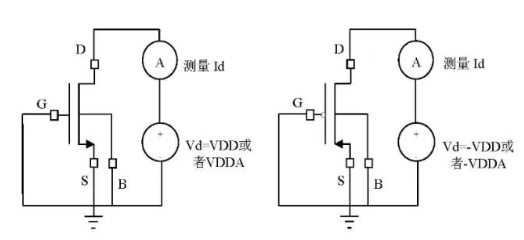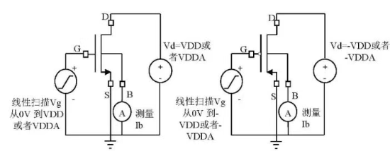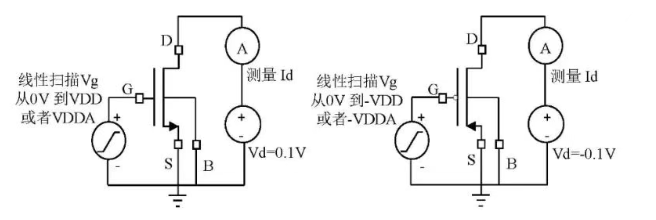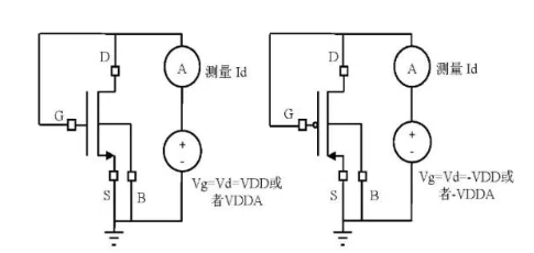 MOS参数1. 阈值电压Vt第一种测试方法是最大电导测量,也是线性外推法:a. 对于NMOS,首先设定Vd=0.1V和Vb=Vs=0V,然后线性扫描Vg从0V到VDD或者VDDA(VDD为低压器件的最大工作电压,VDDA为中压器件的最大工作电压。),测得最大电导时Vg的值,求该点的斜率,通过该点利用斜率作斜线相交于x轴得到数值Vg(x),那么Vt=Vg(x)-0.5Vd。 b. 对于PMOS,首先设定Vd=-0.1V和Vb=Vs=0V,然后线性扫描Vg从0V到-VDD或者-VDDA,测得最大电导时Vg的值,求该点的斜率,通过该点利用斜率作斜线相交于x轴得到数值Vg(x),那么Vt=Vg(x)0.5Vd 。 ![]() 第二种方法是利用电流常数测阈值电压: a. 对于NMOS,首先设定Vd=0.1V和Vs=Vb=0V,然后线性扫描Vg从OV到VDD或者VDDA,测得Vg在I/W=0.1uA/um时的值,那么Vt=Vg。 b. 对于PMOS,首先设定Vd=-0.1V和Vs=Vb=0V,然后线性扫描Vg从OV到-VDD或者-VDDA,测得Vg在I/W=0.1uA/um时的值,那么Vt=Vg. ![]() 阈值电压的影响因素: a. 阱离子注入异常:这个在inline中一般没有监控参数; b.离子注入损伤在退火过程中没有激活:这个在inline中一般没有监控参数; c.AA或多品硅栅刻蚀后的尺寸异常:这个主要关注AA AEI CD POLY CD以及MG等相关参数; d.栅氧化层的厚度异常导致:这个关注DG相关的工艺参数; e. 对于NMOS,关注SMT loop 相关工艺参数;PMOS,应该还要关注SiGe loop相关工艺参数。 2.饱和电流Isat 这个目的在于测试MOS工作在饱和区,也就是刚刚沟道发生夹断的电流大小。 a. NMOS饱和电流Idsat,设定Vd=Vg=VDD或者VDDA,Vs=Vb=0V,测量电流Id,那么Idsat=Id/W; b. PMOS饱和电流Idsat,设定Vd=Vg=-VDD或者-VDDA,Vs=Vb=0V,测量电流Id,那么Idsat=Id/W. 饱和电流的影响因素: a. 阱离子注入异常导致; b. N+或者P+离子注入异常; c. LDD离子注入异常; d. 离子注入损伤在退火过程中没有激活; e. AA或多晶硅栅刻蚀后的尺寸异常; f. 栅氧化层的厚度异常; g. 对于NMOS,关注SMT loop 相关工艺参数;PMOS,应该还要关注SiGe loop相关工艺参数。 3.漏电流Ioff 测试在MOS管没有开启时,沟道中通过电流 a. NMOS漏电流Ioff,首先设定Vd=1.1VDD或者1.1VDDA,Vg=Vs=Vb=0V,测量电流Id,那么Ioff-=Id/W; b. PMOS漏电流Ioff,首先设定Vd=-1.1VDD或者-1.1VDDA,Vg=Vs=Vb=0V,测量电流Id,那么Ioff-=Id/W. 漏电流的影响因素: a. 阱离子注入异常; b. LDD离子注入异常; c. AA刻蚀损伤在退火过程中没有消除, d. 接触孔刻蚀异常。 4. 击穿电压BVD测试 测试在截止区时,源漏之间电流突然增大,一般达到微安量级时的电压。 a. NMOS击穿电压BVD,首先设定Vg=Vs=Vb=0V,然后线性扫描Vd, 从0V到12V,得到Vd在Id/W=0.1uA/um时的值,该点的电压值就是击穿申压BVD; b. PMOS击穿电压BVD,首先设定Vg=Vs=Vb=0V,然后线性扫描Vd, 从0V到-12V,得到Vd在Id/W=0.1uA/um时的值,该点的电压值就是击穿申压BVD。 ![]() 击穿电压的影响因素: a. 阱离子注入异常; b. LDD离子注入异常; c. 离子注入损伤在退火过程中没有激活: d. 多品硅栅刻蚀后的尺寸异常; e. 接触孔刻蚀异常。 5. 衬底电流Isub测试 在理想的MOSFET模型中,我们认为栅极控制沟道,而源、漏和衬底之间是绝对绝缘的。但在实际工作中,特别是当晶体管处于饱和区时,会有一个非零的电流从沟道流入衬底。这个电流就是衬底电流。它对电路的主要危害是引起可靠性退化(热载流子效应)、逻辑错误和功耗增加。 a. 测量NMOS衬底电流,首先设定Vd=VDD或者VDDA,Vs=Vb=0V,然后线性扫描Vg从0V到VDD或者VDDA,测得最大衬底电流,那么Isub=Ib/W; b. 测量PMOS衬底电流.,首先设定Vd=VDD或者VDDA,Vs=Vb=0V,然后线性扫描Vg从0V到-VDD或者-VDDA,测得最大衬底电流,那么Isub=Ib/W。 ![]() 衬底电流的影响因素: a. 阱离子注入异常; b. LDD离子注入异常; c. 离子注入损伤在退火过程中没有激活. 栅氧化层参数1.栅氧电容Cgoxa. 测量NMOS栅氧化层电容Cox,首先在栅电容的一端多品硅栅上加载AC100KHz(VDD或者VDDA)扫描电压,另一端PW衬底接地,来测试电容C,Cox=C/Area。 b. 测量PMOS栅氧化层电容Cox。,首先在栅电容的一端NW衬底上加载AC100KHz(VDD或者VDDA)扫描电压,另一端栅极接地,来测试电容C,Cox=C/Area。 栅氧电容影响因素: a. 阱离子注入异常; b. 离子注入损伤在退火过程中没有激活; c. 栅氧化层的厚度异常:这个厚度主要和DG工艺相关。 2.电容击穿电压BVgox a. 测量NMOS栅氧化层击穿电压BVgox,首先在栅电容的一端栅上加载DC扫描电压,Vg从0V到12V,另一端PW衬底接地,测试电流Ig,得到Vg在Ig/Area=100pA/um2时的值,BVgox=Vg,就是击穿电压。 b. 测量PMOS栅氧化层击穿电压BVgox,首先在栅电容的一端衬底上加载DC扫描电压,Vb从0V到12V,另一端栅接地测试电流Ib,得到Vb在Ib/Area=100pA/um2时的值,BVgox=Vb就是击穿电压。 影响电容BVgox的因素与影响电容Cox |