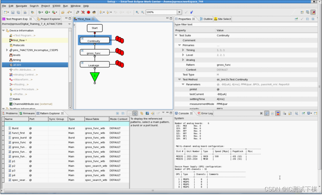 文章介绍了V93k这种高级ATE机台,用于半导体测试,具备高速、多功能、高可靠性和灵活性等特点。硬件包括测试头、板卡等,软件基于Linux但易用。DPS64和PS1600是两种重要的板卡资源,Smartest是其软件系统,包含EWC、testflow等多个方面。 摘要由CSDN通过智能技术生成 1.入芯片测试行业已经接近两年,想要系统的把知识罗列起来,便于之后的学习以及回顾,遂开始 93k机台学习指南 1 了解93k机台 1.1什么是93k机台? 1.93k是一种ATE机台,ATE是自动测试设备(Automatic Test Equipment)的缩写,是一种用于测试电子元器件、集成电路、电路板和系统的设备。ATE可以自动执行测试程序,对被测试物品进行电性能、功能性能、可靠性等多方面的测试和分析,以确保产品的质量和性能符合要求。ATE通常由测试仪器、测试程序、测试夹具和控制软件等组成。V93000是一种比较高端的半导体测试平台,由美国公司Advantest开发。V93000机台具有高度的可靠性、灵活性和可扩展性,可以满足不同客户的测试需求。它是半导体行业中最受欢迎的测试平台之一。 1.2 93k机台有哪些特点? 高速测试:V93000可以实现高达100GHz的测试速度,能够满足高速、高精度的测试需求。 多功能测试:V93000支持多种测试模式,包括数字、模拟、射频、混合信号等多种测试模式,能够满足不同类型芯片的测试需求。 高可靠性:V93000采用了先进的测试技术和可靠的测试方法,能够保证测试结果的准确性和可靠性。 灵活性:V93000具有高度的灵活性,可以根据不同的测试需求进行定制化配置,同时还支持多种测试接口和测试方案。 易于操作:V93000采用了直观的用户界面和易于操作的软件,使得测试人员可以快速上手并进行测试。 2学习93k机台的基础知识 2.1 93k机台的硬件结构 主要有测试头,测试板卡,控制器,测试床,电源和冷却系统,不过对于ATE开发工程师来说,只需要掌握机台的板卡资源.V93K大概可分为四个系列,分别是L S C A,它们的可扩展性有区别,像测试工厂基本上是C系列以上,设计公司或者实验室做调试基本上以A系列为主. DPS64是电源板卡,93K的电源板卡有很多,比如DPS128,AVI64,PVI8,FVI16等等,这里主要简单的介绍公司实验室中用的DPS64 顾名思义,DPS64有64个DPS资源,HC:-2,5V到+7V,HV:-6V到15V ![]() 2.11 PS1600介绍 PS1600板卡是IO资源板卡,与胜达克的DIGI板卡,Chrome的MXLPC类似 速率理论上可达1600Mbit/s,PS1600具有8个channel module ,每个module有16个资源(128个IO资源,128个PPMU) 支持HV 最高13.5V 可做AVG 通道 2.12 DPS64介绍 2.2 93k机台的软件系统 93k的软件操作系统基于Linux系统,但是保留的Windows操作的逻辑,使测试开发人员更容易上手,93k机台的软件系统称之为"smartest" 文件结构 ![]() 如图所示,在创建完一个device之后,你的project里面的文件如上图,可以在对应的文件夹里面修改开发,也可以使用smartest开发. smartest内容比较多,下一篇较详细的介绍一下. 包括 1.EWC介绍 2.testflow建立 3.pin configuration建立 4.level建立 5.timming建立 6.pattern导入 7.testable(分bin)建立 ![]() |