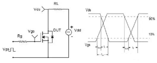 6.栅极电阻 对于栅极的驱动,功率MOSFET栅极呈现和RC网络类似的阻抗。等效的电阻就是指栅极的电阻Rg。栅极的电阻由栅极多晶硅导体,金属和连接结构的电阻产生。连接结构就是为了连接外部封装的管脚,所布设的到焊盘的栅极信号线。 对于多晶硅栅极功率沟漕MOSFET,栅极的电阻取决于掺杂的程度和多晶硅材料的类型(N或P型),栅极沟漕的几何特性和器件设计的安排。对于同样器件设计,N型沟漕功率MOSFET通常比P型有更低栅极电阻,因为在合适掺杂的多晶硅中,N型具有更低的薄膜电阻。许多开关器件最后要使用LCR仪,100%的测量Rg。 7.开通和关断 功率MOSFET数据表通常有阻性负载的开关特性,取决于Rg,Ciss和Crss。当寄生的电感和栅极驱动细节因素影响到实际的测量时,可以检查基本的物理特性。图9示出了功率MOSFET阻性负载开关测试电路和波形。