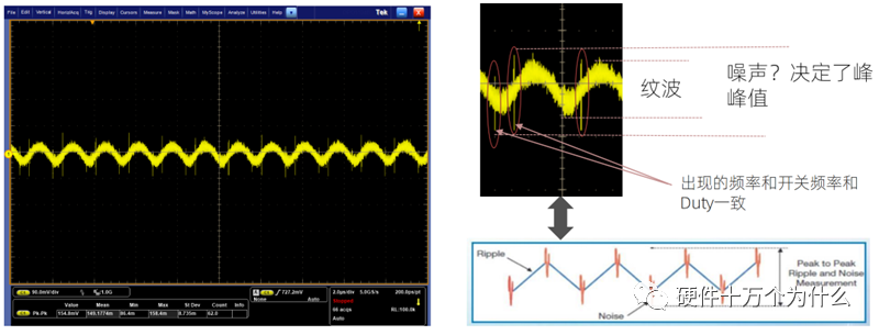 如图所示输出电压的波形,包含开关的纹波,负载跳变的引起的跳变,还有耦合进来的噪声。