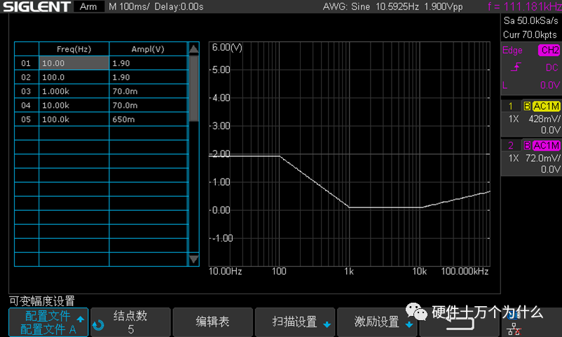 这一小节主要介绍了完成本次测量所需的关键设置,关于 Bode Plot 完整的使用说明,在进入 Bode Plot 软件之前,建议先把要用到的通道设置为 20 MHz 带宽限制。本次测量的频率范围是 10 Hz 到 100 kHz,这于一个预期的穿越频率在 10 kHz 左右的电路来说足够了。在 Bode Plot 的主菜单按配置信息进入配置菜单,编辑配置信息。进行通道设置,将 DUT 输 入和 DUT 输出设置到相应的通道上,设置好 DUT 输入为 C1,DUT 输出为C2。测试与 SAG1021I 的连接是否成功。将扫描类型设置为可变幅度,设置扫描参数。将频率模式设置为对数,在配置文件编辑里面建立5 个结点,分别是 10Hz,100Hz,1KHz,10KHz,100KHz,对应的幅度分别为 1.9V,1.9V,80mV,80mV,1V,如下图所示,将点数/十倍频设置为 40。