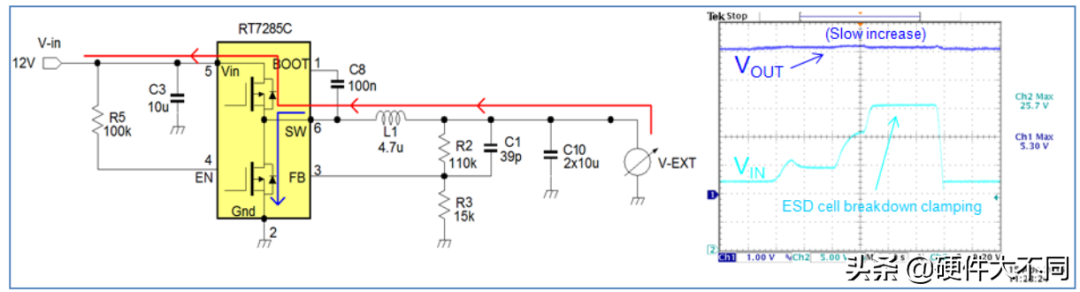 假如转换器的输出端由高于预设输出电压的外部电源供电时, IC 内部的下桥 MOSFET 会从输出端吸入电流,再与上桥 MOSFET 一起形成一个Boost 转换器。如下图所示,该电路的输出端就由一个缓慢上升的 5V 电源供电,它的输入端电压将上升并最终将其 ESD 单元击穿。