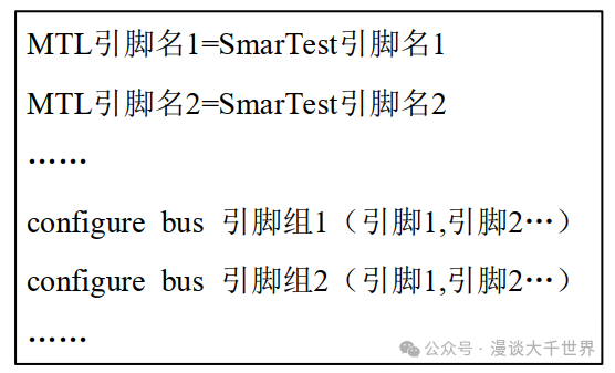 的作用就是把在V93000机台软件Smartest里面定义的器件引脚与MTL文件里面的引脚定义联系起来。可以在引脚映射文件中为引脚定义同Smartest中不同的名字,还可以把一些引脚定义成一个引脚组,方便在.dvac文件中同时调用具有相同性质或用途的引脚,简化程序代码。 引脚映射文件结构如图所示: