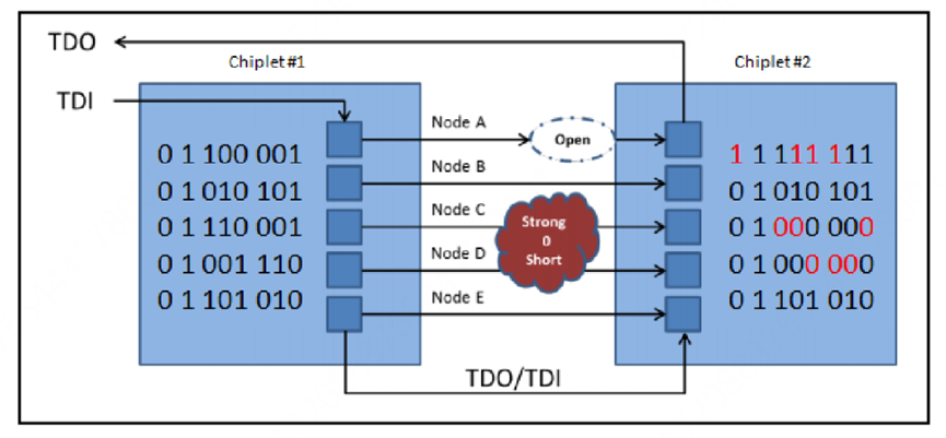 ATE与Handler用于边界扫描的芯片级互连测试一.概述 基于芯片的多芯片器件作为异构集成设计方法的产物,在当今芯片设计和实现策略中扮演着重要角色。实现多芯片器件的动力始于20世纪70年代,当时采用了一种封装创新方法,包括在封装规模的基板上放置多个互连的芯片。 这些器件被称为多芯片模块 (MCMs)。随着时间的推移,出现了其他的封装创新,如系统级封装 (SiP) 、系统级集成芯片 (SoIC)。2.5D集成电路 (ICs) 和3D-IC封装。多芯片封装创新使得半导体行业能够创造出更小、更快、可配置和更低功耗的IC。 图1.先进封装技术的时间线 类似于放置在印刷电路板 (PCB) 上的封装芯片,多芯片封装内小芯片之间的互连必须经过结构完整性测试。结构测试通常在制造过程中在芯片级自动化测试设备上进行,然后再将器件运送给最终用户。 Chiplet die到die(D2D) 结构测试涉及数字测试向量的应用,这些向量被格式化为在芯片级测试中使用。这些数字测试向量可能是用于设计小芯片的电子设计自动化 (EDA) 工具的产物。测试向量由嵌入式仪器使用小芯片的输入/输出 (IO) 资源进行应用。本文研究导致半导体行业异构集成设计和D2D互连测试方法发展的行业趋势。 二.基于芯片级封装的多裸片器件 随着半导体行业继续朝着创造更高效、成本更低的芯片制造和设计方法迈进,一种创新封装趋势已经出现。这种趋势最初是在20世纪60年代提出的。这种方法建议将多个晶片器件封装在一个单个芯片封装内,这是一种被称为异质集成的设计方法。 异构集成涉及将各种不同的元素结合成一个功能系统。这些不同元素是硅芯片(以下简称“小芯片”);当它们组合在一个中介层或硅基板上时,就构成了一个结构化的功能性系统。小芯片是一种集成电路,专门设计为与其他小芯片一起工作,以形成更大、更复杂的芯片。多片器件中的小芯片可以根据所需的芯片功能进行选择、排列和组装。 异构集成允许封装具有不同功能、不同工艺技术,有时甚至来自不同芯片制造商的片上系统。这些组合在一起的芯片可以有不同的功能(例如处理器、信号处理器、缓存器、传感器、光子学、射频和MEMS)和技术(例如:一个优化了晶片尺寸而另一个则优化了低功耗)。这些组装而成的不同硅芯片可以在各种选项中进行封装。单片晶片难以超过一定尺寸,制造包含更多功能的大芯片成本更高。考虑到这些事实,半导体行业需要一种方法来扩大产品规模以提高性能、提供高硅产量并降低成本。作为先进封装技术发展的例子,AMD的第一代EPYC处理器。从单一设计迁移到利用四个相互连接的八核处理器的MCM。 图2.从单片芯片到基于小芯片的封装架构 展望未来,AMD设计了芯片级组件来处理特定的处理器任务。AMD第二代EPYC和第三代Ryzen处理器提供了更高的扩展性,并允许每个硅片优化以使用小型7纳米和14纳米芯片级组件提供最佳延迟和功率特性。先进的封装创新产生了: 1. 更小的封装 2. 低功率器件 3. 更大的芯片可配置性 4. 更快的芯片上市时间 5. 整体制造成本降低 三.多芯片器件D2D互连 多芯片器件内的高速D2D互连可以在GHz范围内运行,同时提供GT/s的数据。与异构集成设计相关的一个挑战是在操作模式下适应每个小芯片之间移动的大量数据。为了适应这种高速传输,在尽量减少噪声的同时,数字串行器/解串器(也称为SerDes)被用作小芯片D2D互连。 虽然在先进的封装解决方案方面取得了巨大进步,但选择一种能够容纳大量数据且与封装解决方案兼容的互连技术非常重要。理想的多芯片互连技术是可扩展、低功耗、面积效率高,并且可以在低成本硅和封装技术中构建。多芯片器件中使用的D2D互连技术有两类: · 中程和长距串行器/解串器(SerDes) · 短距离超距离SerDes(USR/XSR) 图3. SerDes D2D互连 这些D2D互连适应高速数据传输,同时最小化噪声和最小化D2D互连的数量。诸如高带宽存储器、高级接口总线、束线(HBM,AIB,BoW)等并行接口链路技术易于实现且具有高带宽;但可能需要许多导线才能完全实施。 图4.并行D2D互连 图中的MCM是一个以太网芯片,有8个周边的芯片小块,在操作模式下为交换机核心提供6.4TB的数据。为了适应这种高速传输,并尽量减少噪声,SerDes用于芯片小块之间的D2D互连。在信号方案方面,D2D互连有几个技术选择: 01并行 02 非零返回(NRZ) 03 脉冲幅度调制4级(PAM4) 当需要较低带宽时,使用并行接口。在选择SerDes方法时,会利用NRZ和PAM4信号方案来实现较高带宽。多芯片器件中最佳的D2D通信在于优化六个经常相互竞争但又相互关联的因素: • 可用的晶片面积 • 功耗 • 可扩展性 图5. 8个芯片的以太网交换机芯片 一个关键的设计考虑因素是封装上的D2D接口,如上图中黄色突出显示。下表对用于评估D2D互连的技术选项进行了分类。 芯片级分布式数据处理需要在芯片之间进行高速数据传输。并行和串行是两种数据传输方式。与仅需一对连接的串行数据传输相比, 并行数据传输需要多个芯片之间的连接。互连比并行D2D互连具有几个优点。 表1.用于D2D互连的评估技术选项 四.测试多芯片器件的D2D互连 IEEE 1149.1测试访问端口(TAP)和边界扫描架构的标准是在1980年代构思并在1990年被采用为标准的。边界扫描测试通过连接器和四线串行接口 称为测试访问端口 (TAP) 应用于PCB。实现时,这个接口通常被称为 “JTAG端口”。 边