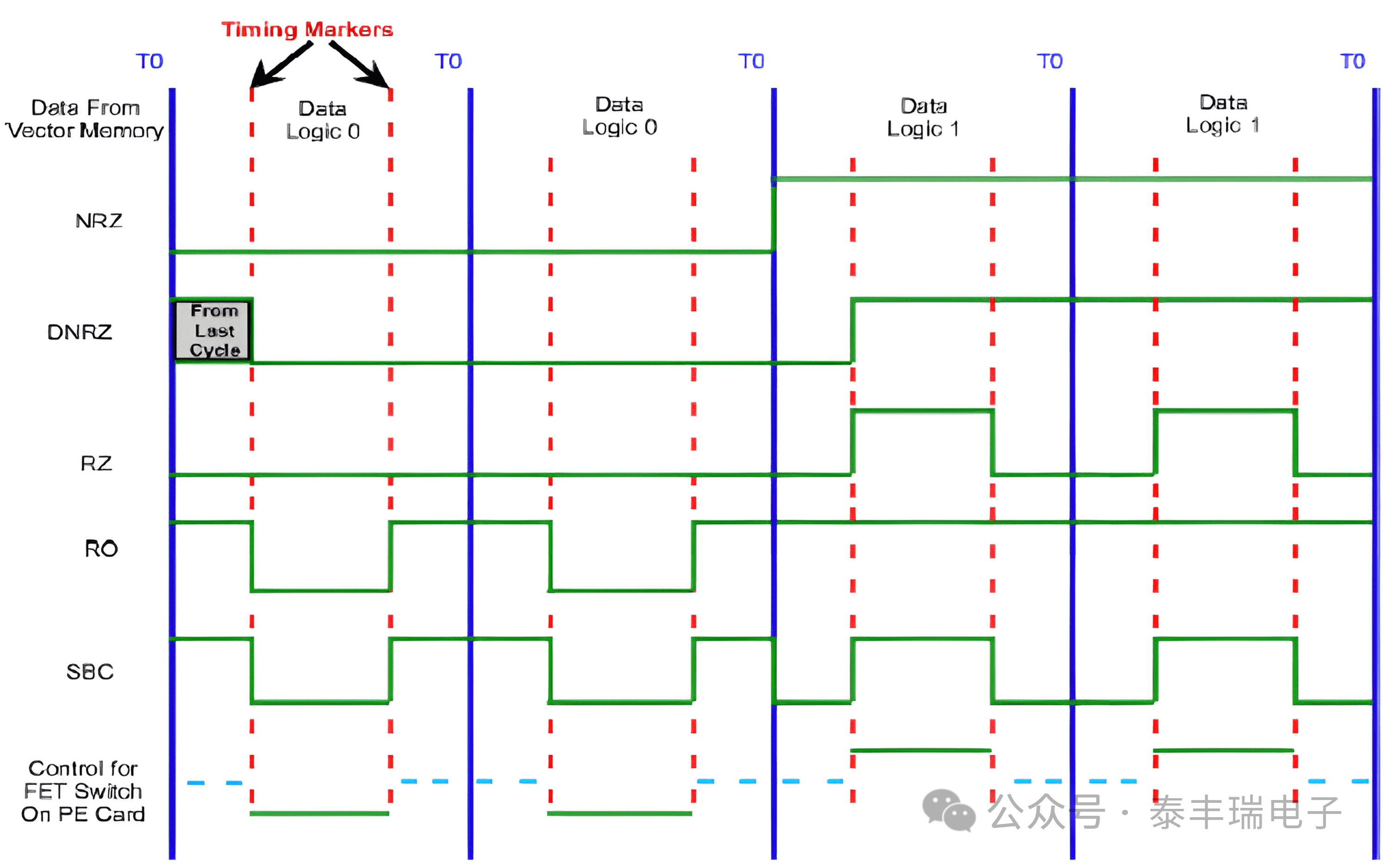 半导体测试 - 基本概念随着芯片集成度越来越高,手动测试已无法满足需求,因此要用到自动化测试设备(ATE,Automated Test Equipment)。因为现在的芯片原来越复杂,普通的 Bench 测试没法满足需求。ATE 可检测集成电路功能之完整性,是集成电路生产制造最终的流程,确保产品质量。芯片测试算是半导体产业链上游里面最末端的一个组成部分。受测试的器件主要分几类:储器、数字电路、模拟电路和混合信号电路。 ATE 内部有很多子系统,包括提供高低电平的驱动电路、可编程的电流负载、检测输出电压的比较器、PMU 连接电路、高速电流比较器、高速开关等。 ATE 测试系统图 从上图可以看出,测试系统主要由输入、输出和动态负载三部分组成: 1.输入部分 给 DUT 提供 VIL/VIH 电压 2.输出部分 将 DUT 的输出电压与 VOL/VOH 作比较 3.动态负载 通过加载 IOL/IOH 电流,得到输出电压,与 VOL/VOH 作比较 直接将输出电流与 ILow/IHigh 作比较(一般高端机台才有) 测试最基础的是测 DC 和 AC 参数。DC 参数用的方法可以是 Static,就是用 PE 卡的 Driver 和 PMU,然后 Force V Measure I 或 Force I Measure V ;也可以用 Functional 的方法,就是 Current Load 和 Voltage Comparator,然后跑 Pattern 来测试。 信号的输入与输出 信号是如何生成并输入 DUT 的: 信号是如何从 DUT 读出并测试的: 输入信号的格式 ![]() · RZ(Return to Zero):归零码,在一个周期内用二进制传输数据位,当数据位脉冲结束后,需要维持低电平。这种编码能同时传输时钟与数据信号,但因为一部分带宽被归零占用,所以传输效率相对不高。上升下降沿的位置可受 Edge Timing 控制。 · RO(Return to One):归一码,与 RZ 相反,需要维持在高电平。上升下降沿的位置可受 Edge Timing 控制。 · NRZ(Non Return to Zero):不归零码与 RZ 的区别是它不必归零,所以一个周期可以全部用来传输数据,带宽利用率 100%。如果传输低速异步数据,可以不加时钟线,但要约定通信波特率(如 UART);传输高速同步数据,需要另外配时钟线。NRZ不受 Edge Timing 的控制。 · DNRZ(Delayed Non Return to Zero):延时不归零码是 NRZ 加了时间延迟的波形。延时的时间受 Edge Timing 控制 · SBC(Surrounded By Complement) :补码环绕相当于 RZ 和 RO 的叠加。它每个周期内最多可以有 3 个边沿,在 T0 时反转数据,延迟一定时间后表现为预设的值,维持一定时间后又反转回去。SBC 多用于建立 / 保持信号的控制。 · ZD(Impedance Drive):阻抗驱动用于控制引脚开启或关断(高阻态)。 时钟信号通常使用 RZ/RO 格式,上升沿有效的信号(如片选 CS 或读 READ)常使用 RZ 格式;下降沿有效的信号(如输出始能 OE 常使用 RO 格式;拥有建立和保持时间要求的数据信号常使用 SBC 格式;其他的输入信号则可以使用 NRZ 或 DNRZ 格式。 输入信号的格式 高低电平输出: 引脚输出高低电平逻辑时,高电平必须至少要比 VOH 高,低电平至少比 VOL 低。 高阻态输出: DUT 引脚由外部负载将电压拉到 VOL 与 VOH 之间,不能输出电压电流。 负载电流输出 DUT 有些引脚可以输出负载电流。如果测试系统有可编程电流负载就可以直接测试,如果没有就可能要外加电阻测试。负载电流输出需要在 VOL/VOH 达标的情况下输出指定的 IOL/IOH 电流。 CP 测试与 FT 测试 CP(Chip Probe)测试是芯片还在 Wafer 阶段时,就通过探针卡扎到芯片管脚上对芯片进行性能及功能测试。FT(Final Test)是芯片在封装完成以后进行的最终测试。 测试设备 · DUT(Device Under Test):待测设备,外部信号通过 DUT 的引脚对其进行测试。也称为 UUT(Device Under Test)。 · DPS(Device Power Supplies):为 DUT 直接提供电压与电流的设备。 · PMU(Precision Measurement Unit):精密测量单元,用于精确测量器件的直流特性。 · PPMU(Per Pin Measurement Unit):每个引脚上都有 PMU 用于测量。 · DIB(Device Interface Board):设备接口板,也称 LOAD board。 · PIB(Probe Interface Board):探针接口板,用于 Wafer Probe。 · PDP(Prober docking plate):探针台对接板。 · PROBE CARD:带探针的 PCB,用于 Wafer Probe。 · BINNING:根据测试结果对 DUT 进行筛选。 · MANIPULATOR:支撑测试头并允许其向多个方向移动的结构。 · HANDLER:全称IC pick up and place handler,自动分选机,用于将 DUT 放置在测试头插座中的机械。 · PROBER:探针台,在测试探针下移动晶片的机械单元。 芯片设计与测试的流程 基本测试项目 接触/连续性测试(Contact/Continuity Test):检查器件引脚中开路 / 短路问题。 直流特性测试(DC PARAMETRICS TEST):验证设备 DC 电流和电压参数,包括 IDD。 数字功能测试(DIGITAL FUNCTIONAL TEST):测试 DUT 的逻辑功能。交流时序测试(AC TIMING TEST):验证 AC 规格,包括输出信号质量和信号时序参数。 混合信号测试(MIXED SIGNAL TEST):验证 DUT 的模拟和数字电路的逻辑。 其他的测试项:射频器件(RF Devices)汽车器件(Automotive Devices)存储器件(Memory Devices)电源管理器件(Power Management Devices)RFID 器件、高速数字器件(High Speed Digital devices)等的测试。 测试中的参数介绍 VCC:对 TTL 器件的供电。 VDD:对 CMOS 器件的供电。 ICC:对 TTL 器件的驱动电流。 IDD:对 CMOS 器件的驱动电流。 VSS:提供电源回流路径。 GND:参考电平,在单电源供电设备上常等价于 VSS。 IDD:从 CMOS 设备中消耗的电流。 ICC:从 TTL 设备中消耗的电流。 VIH:高电平输入时的最低电压限制(不会被识别成 0)。 VIL:低电平输入时的最高电压限制(不会被识别成 1)。 VOH:高电平输出时的最低电压限制(不会被识别成 0)。 VOL:低电