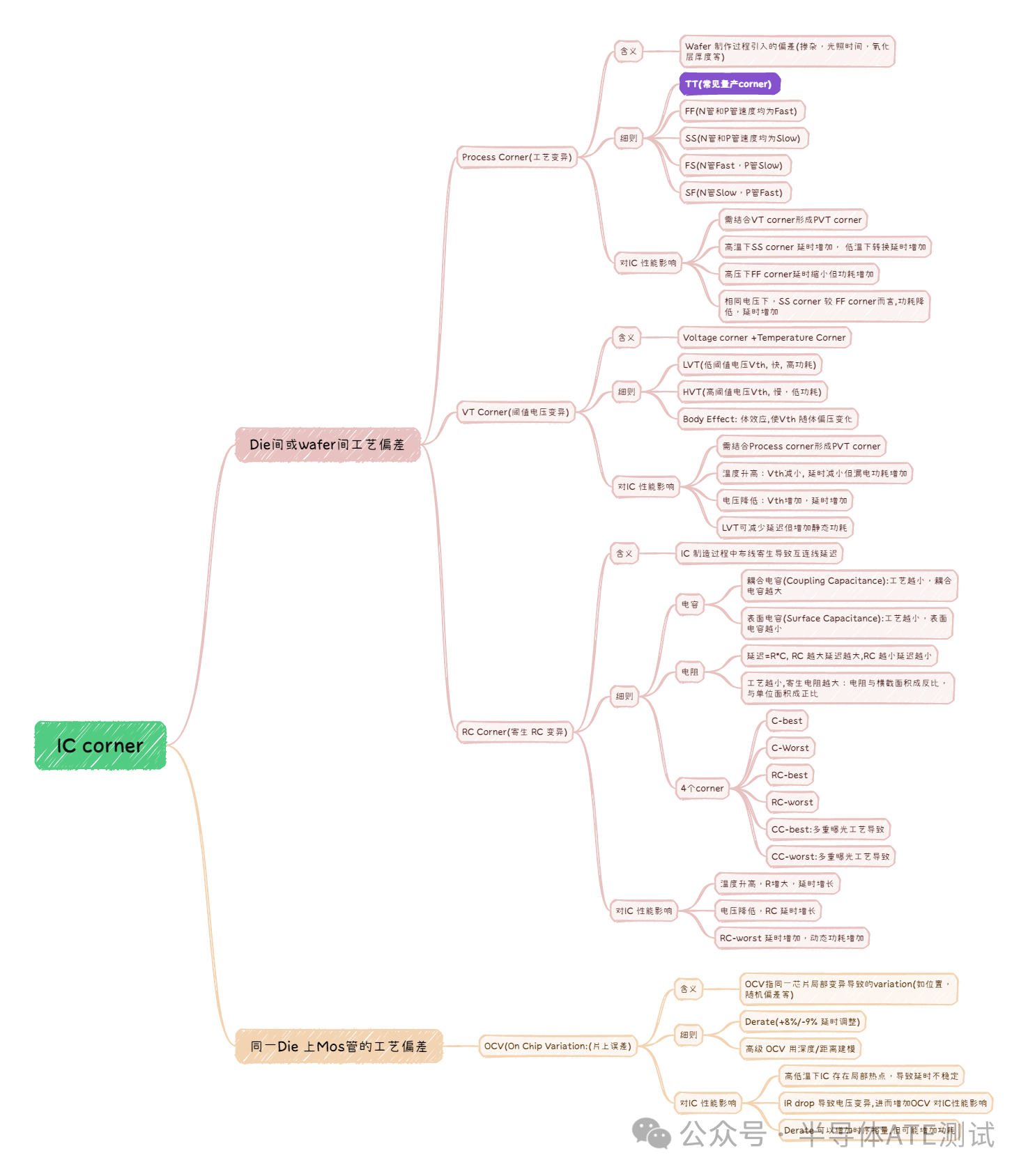 "为确保实际制造出的芯片与设计功能一致,芯片正式流片前,Design 团队必须向代工厂“签字画押”:“只要工艺在以下边界内,我设计的芯片一定工作.” 这张“保证书”就是Sign-Off Corner. Sign-Off Corner 将晶圆制造,电压,温度,互连线,片上波动等所有不确定性打包成一套“极端环境”,以尽力确保实际制造出来的芯片与设计仿真结果一致。进而减少芯片迭代,提升ROI。"作为ATE 测试工程师,在NPI 的CQS 阶段(Pre Release to Mass Production)我们需要对Corner Wafer 进行character 测试,以确保大批量量产时良率稳定。(良率不随Fab 制造的工艺参数变化而变化)。 Summary IC Sign off Corner 相关知识点如下: ![]() Sign-off Corner 的“四大家族”公式一句话记住:Sign-off Corner = Process Corner + VT Corner + RC Corner + OCV 1. Process Corner(晶体管“快慢”角)来源:晶圆之间、批次之间掺杂、氧化层厚度、沟道长度等全局偏差。 五兄弟: – TT:典型 NMOS + 典型 PMOS(Nominal) – SS:慢 NMOS + 慢 PMOS(最慢) – FF:快 NMOS + 快 PMOS(最快) – SF / FS:一慢一快,称“skew”角,用于发现奇怪路径。 对芯片影响: Reference:idc-online.com 高温下 SS corner 延时增(迁移率降 T^{-3/2}),可能增 20%+; 低温下(<-50°C),延时增因阈值效应。 电压:高压 FF 减延时(饱和电流增),但增动态功耗 (P=CV^2f)。 延时/功耗:FF 减延时,提升 AI 计算速度;SS增延时,但降低功耗。整体:影响时序裕度,忽略导致性能不稳。 2. VT Corner(电压-温度角) V 角:代工厂给出电压窗口,例如 0.72 V ~ 0.88 V。 – 高压:晶体管快,setup 容易过,hold 难过; – 低压:晶体管慢,setup 难过,hold 容易过。 T 角:-40 °C ~ 125 °C。 – 低温: mobility ↑,速度 ↑; – 高温: leakage ↑,速度 ↓。 对芯片影响:Reference:chu.berkeley.edu 高温减Vth(每°C降~1mV),减延时但增漏电功耗(静态P = V I_off 增);低温增Vth,增延时。 电压:低压下HVT增延时(开关慢);高压下LVT增功耗。 延时/功耗:LVT 减延时15%(高速 AI 核心),但静态功耗增;HVT 节能但延时紧。体效应加剧电压变异影响。 3. RC Corner(互联线“走线”角)