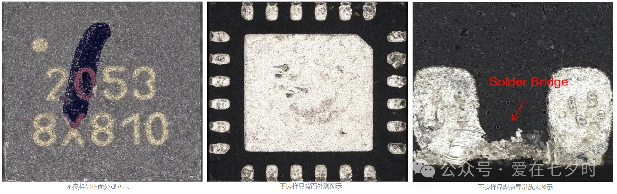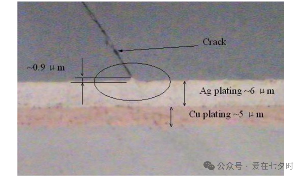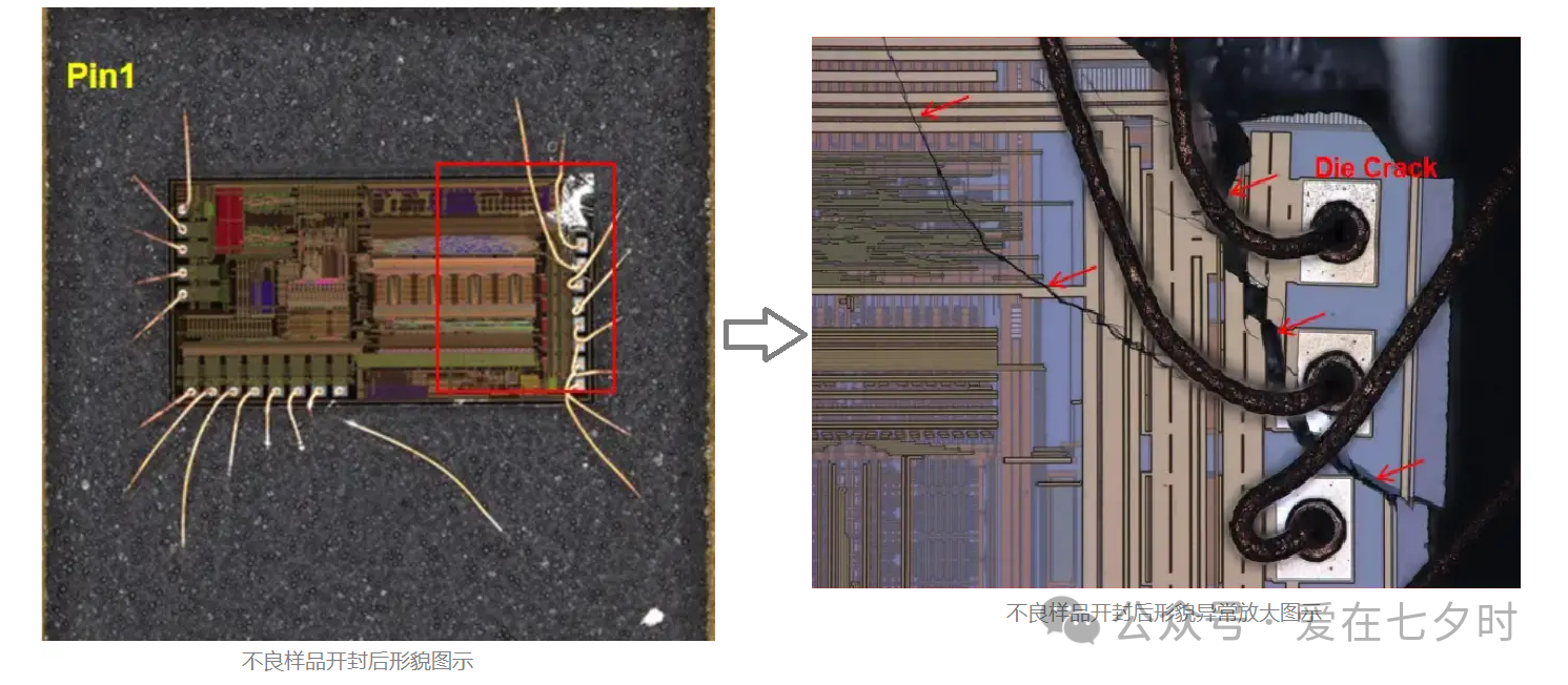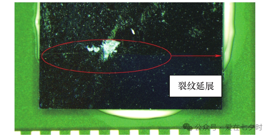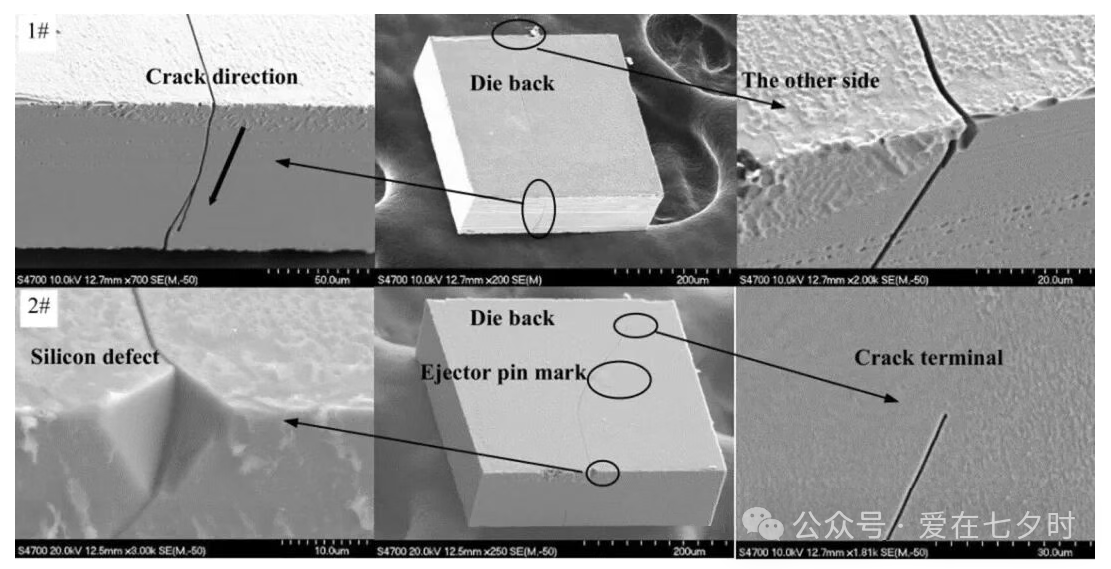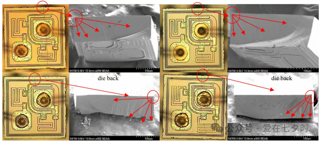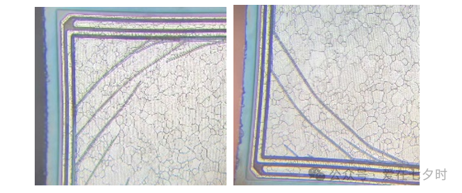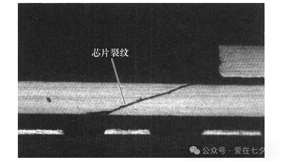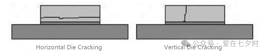 【博主简介】本人系一名半导体行业质量管理从业者,旨在业余时间不定期的分享半导体行业中的:产品质量、失效分析、可靠性分析和产品基础应用等相关知识。常言:真知不问出处,所分享的内容如有雷同或是不当之处,还请大家海涵,如有需要可留意文末联系方式,当前在网络平台上均以“爱在七夕时”的昵称为ID跟大家一起交流学习!相信在半导体封装工序工作的朋友,肯定对“芯片裂纹”(也有的叫芯片开裂或是裸片裂纹)这种非常典型的失效模式并不陌生。随着集成电路(IC)技术的发展,芯片尺寸不断缩小,厚度持续降低。这在提升单位晶圆产出、降低封装高度的同时,也带来了新的挑战。硅片的易碎特性使其在组装和测试过程中,即便受到中等强度的应力,也可能发生开裂。 而且更让人疑惑的是:DB、WB和Molding乃至后面的Final Test都没啥问题,Test Yield也可能会达标。但是,一经过可靠性的高低温循环测试,突然就可能有比较大量的芯片失效,拆开塑封料一看,硅片上全是从边缘延伸的裂纹。这种 “电测看不破,循环现原形” 的缺陷,堪称封装环节的 “隐形杀手”,也是一种导致灾难性的产品失效,每年能给行业造成的损失超十几亿,甚至更多。 所以,本章节想要跟大家分享的就是芯片封装中典型失效之一的“芯片裂纹”模式。会从硅芯片的 “先天脆弱性” 入手,拆解裂纹产生的工艺诱因、检测难点,再给出行之有效的工艺改进方案等等。 一、芯片裂纹的定义 芯片裂纹,英文常常称作:Die Crack,中文定义也可称作:裸片裂纹或是芯片开裂。它是指在半导体集成电路封装过程中或使用过程中,芯片表面或内部产生的开裂(裂纹)的一种现象。 二、芯片裂纹(Die Crack)的分类 当前按开裂(裂纹)方向去定义的话,主要分为以下两大类: 1、垂直方向裂纹 起源于芯片背面,通常由芯片弯曲,导致其背面受到拉伸应力而产生。裂纹从背面缺陷处(如研磨划痕)开始,并向芯片表面扩展。这种模式需要较大的应力才能触发。 2、水平/边缘裂纹 多由晶圆切片过程中形成的边缘缺陷引发,裂纹从边缘向芯片内部扩展,常见于倒装芯片(PBA)封装中,也是较为常见的模式。 三、芯片裂纹(Die Crack)产生的原因 芯片裂纹(Die Crack)的根源,首先在于硅本身的 “材质特性”—— 咱们常说单晶硅是 “硬而脆” 的典型,这可不是随口说的,而是由它的晶体结构和力学性能决定的。 1、芯片裂纹(Die Crack)的失效机理 从晶体结构来看,单晶硅是金刚石型面心立方结构,原子间通过强共价键结合,这种结构让它硬度极高(莫氏硬度 7,仅次于蓝宝石),但也导致它 “缺乏塑性”—— 一旦受到外力或应力,原子没办法通过滑移来缓解,只能在应力集中处形成裂纹,而且裂纹会沿着原子结合力较弱的 “解理面”(比如 {111} 晶面)快速扩展,最后导致脆断。就像玻璃一样,哪怕只是表面有个微小划痕,稍微受力就会碎。 从力学性能来看,硅的关键指标 “断裂韧性(KIC)” 极低,仅 0.7-1.0 MPa・m^1/2,而金属铜的断裂韧性是它的 50 倍以上。这意味着,硅芯片只要表面存在微米级的微裂纹(比如减薄后留下的 1μm 划痕),在很小的应力(比如 100MPa)作用下,裂纹就会瞬间扩展。更麻烦的是,硅的热膨胀系数(CTE)仅 3.5×10^-6/℃,和封装里的环氧塑封料(12-18×10^-6/℃)、引线框架铜(17×10^-6/℃)差异巨大,温度变化时产生的热应力,会成为裂纹扩展的 “助推器”。 简单来说,因为IC 裸芯片的制造原料通常均为单晶硅,因为特殊特性,在遭受外力作用或表面存在瑕疵时,极容易出现破裂情况。在晶圆减薄、晶圆切割、芯片贴装和引线键合等一系列需要施加应力的工艺操作过程中,芯片开裂的风险大幅增加,这一问题已成为致使 IC 封装失效的重要因素之一。 若芯片裂纹(Die Crack)未蔓延至引线区域,通过常规手段很难发现;更有部分存在裂纹的芯片,在常规工艺检查与电学性能检测时,其性能表现与正常芯片并无明显差异,使得裂纹问题极易被忽略。然而,这些隐藏的裂纹会对封装后器件的稳定性与使用寿命造成严重威胁。由于常规电学性能测试无法有效识别芯片裂纹(Die Crack),因此需要借助高低温热循环实验进行检测。在加热和冷却交替过程中,材料间产生的热应力会促使裂纹逐步扩展,直至芯片彻底破裂,最终在电学性能上呈现出异常状态。 鉴于外部应力是引发芯片裂纹(Die Crack)的主因,一旦检测到芯片存在裂纹,就必须立即对芯片封装的工艺流程和参数进行优化,最大程度减少工艺环节对芯片产生的应力影响。例如,在晶圆减薄工序中,采用更为精细的加工方式,提高芯片表面的平整度,以此消除潜在应力;晶圆切割时,运用激光切割技术替代传统方法,降低切割过程对芯片表面造成的应力损伤;在引线键合环节,精准调控键合温度和压力参数,确保键合过程平稳安全。 因此,硅芯片表面不能有瑕疵,也经不起剧烈的温度变化 —— 这是它容易开裂的先天因素,也是我们后续工艺控制的核心依据。 2、芯片裂纹(Die Crack)的影响 芯片裂纹(Die Crack)的失效模式多种多样,所以,失效的影响也各有不同,主要包括: a.电性能失效 当裂纹穿过结区时,可能导致短路或者漏电,这是最常见的失效表现。例如在表面贴装MOSFET产品中,经过SMT工艺后发现的D、S间漏电和短路现象,超过50%的失效比例都是由芯片内部裂纹引起的。 b.电路中断失效 裂纹也可能全部或者部分截断电路,造成器件功