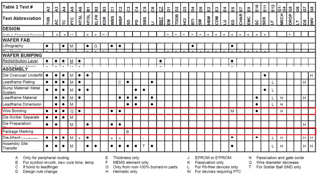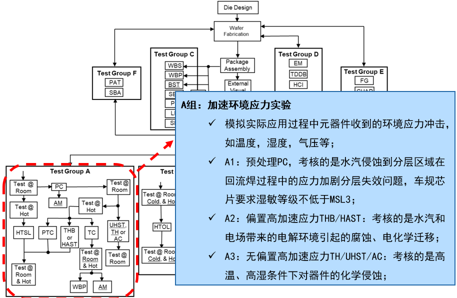 AEC-Q100的常见问题 Q.芯片参加 AEC-Q100 测试认证需要做哪些准备? 芯片需要确认以下信息: Wire Bonding及其材质 AEC-Q100标准中包含了与Wire Bonding相关的测试项(如WBS、WBP)。车规芯片内部是否存在Wire Bonding决定了是否需要执行这些测试项。此外,Wire Bonding的材质也至关重要,金线参考AEC Q100标准,而铜线(含铜)则在AEC- Q100的基础上增加了AEC-Q006的要求。 应用等级 车规芯片的应用等级根据其在汽车中使用的环境温度进行划分,等级从0(最高)到3(最低)。应用等级决定了测试认证时参考的具体测试条件。 湿度敏感等级(MSL) 湿度敏感等级(MSL)的选取应参考JESD22-A113/J-STD-020标准。车规芯片的湿度敏感等级最低要求为MSL 3。 点击查看大图 Q.每一款芯片都需要参加AEC-Q100的所有测试项吗? AEC-Q100 测试认证包含多个项目,但并非所有芯片都需要参加所有测试项,有些测试项是为特定类型的芯片“量身定制”的,例如: ●B3 EDR仅针对非易失性存储芯片/含非易失性存储模块的芯片 ●C5 SBS仅针对BGA封装芯片 ●E10 SC仅针对智能电源管理芯片 ●E11 SER仅适用于≥ 1Mbit的SRAM和DRAM ●G组测试仅针对内含空腔封装的产品 Q.如何判断一款芯片是否要做功率温度循环(Power Temperature Cycling, PTC)测试? PTC测试针对那些在预期应用中功率耗散反复变化≥1瓦特且功率上升时间<0.1秒而导致结温变化≥40ºC的芯片,如用于感应负载的智能功率开关。 Q.有哪些测试涉及到硬件/夹具制作? AEC-Q100标准中涉及硬件/夹具制作的主要有THB/HAST、PTC、HTOL、ELFR、EDR、ESD、EMC、MS、VFV等。 Q.静电放电测试(ESD)和闩锁测试(LU)要求是什么? ESD测试包括人体模型(HBM)和机器模型(CDM),针对不同类型和频率的芯片有不同的电压要求。LU测试则是针对信号Pin和电源Pin的过压测试。 Q.家族系列产品是否都需要通过完整的AEC Q100测试认证? 不需要。AEC-Q100提供了关于通用数据使用的指导原则,允许在系列中的一个代表产品成功完成资格认定后,通过关联性使系列内其他产品(除ESD、LU、ED)获得资格认定。只需根据系列内产品与代表产品的差异,依据AEC-Q100 Table 3(见下表)执行必要的补充测试即可。 点击查看大图 AEC-Q100 测试流程 下文将围绕AEC-Q100标准,简单介绍其测试流程,以及各个测试项的测试原理,旨在让读者了解各个测试项考核的内容以及大致的原理,具体的测试规范和方法将不在此展开深入介绍。 从Test Flow中可以看出,AEC-Q100测试项包含A/B/C/D/E/F/G共七组,各组测试项的考核侧重点不同,覆盖了从Wafer到封装后的产品。 E组实验项 D组实验项 C组实验项 F组实验项 E组实验项 A组实验项 B组实验项 G组实验项 车规芯片变更,如何通过AEC-Q100验证? AEC-Q100是汽车电子委员会(AEC)制定的一系列标准之一,专为汽车电子组件的质量认证而设计。当某款车规芯片发生变更时,此时需根据AEC-Q100 3.2.2的要求,执行必要的测试项目,以确保变更后的芯片能够满足车规要求。 ![]() 点击图片查看大图 变更项目验证流程 以ASSEMBLY中New Package为例: 按照标准要求,需要对以下22项(视芯片参数选取)进行测试并确保通过,从而证明芯片符合车规认证要求。 A组 (含PC) THB、AC、TC、PTC、HTSL B组 HTOL、ELFR C组 WBS、WBP、SD、PD、SBS、LI E组 HBM、CDM、ED、SC、LF G组 MECH、DS、IWV 点击图片查看大图 如果芯片的变更仅限于表面字符,那么仅需补测C组中的SD即可。对于其他类型的变更,以ASSEMBLY中Wire Bonding为例,则需要补测以下项目: A组 (含PC) THB、AC、TC、PTC、HTSL C组 WBS、WBP E组 ED、SC、LF G组 MECH 综上 变更验证的基本原则是清晰识别具体发生变更的内容,然后对照AEC-Q100标准中的测试项目表格,选定必要的补测项目并执行。只有当所有选定的测试项目都通过时,才能证明新样品符合车规认证。 华碧检测芯片测试能力及AEC-Q100整体技术要求 ![]() 华碧实验室是国内领先的集检测、鉴定、认证和研发为一体的第三方检测与分析的新型综合实验室,拥有丰富的车规级电子认证经验,已成功帮助300多家企业顺利通过AEC-Q系列认证,通过AEC-Q100对每一个芯片个案进行严格的质量与可靠度确认。 |