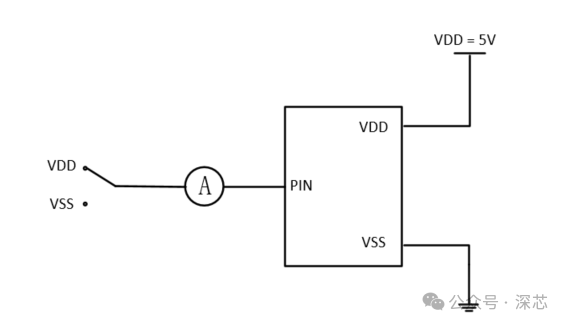 做芯片测试的同学经常会涉及到Continuity测试、Leakage测试、GPIO drive capability测试、GPIO pullup/pulldown resistor测试、standby idd、run idd、IDDQ、MBIST、SCAN等测试,小编在此带大家总结一下这些测试的基本原理。1. Continuity测试(即OS测试) 该测试主要是测试芯片的open/short特性,即测量芯片pin脚对VDD或者GND有没有短路(short)或断路(open)。 当测某一pin的OS时,应使VDD=0V,同时其他pin的电压也全为0。下图为测某一pin对GND的OS测试时的示意图,ATE会从pin抽一个100uA的电流,下方的二极管导通,在正常工作的情况下,测得的电压应该在-0.2V~-0.7V之间。 ![]() 下图为测某一pin对VDD的OS测试时的示意图,ATE会从pin灌入100uA的电流,上方的二极管导通,在正常工作的情况下,测得的电压应该在0.2V~0.7V之间。 ![]() 如果有short情况发生,测得的电压一般接近0V;如果是open的情况,则测得的电压一般为5V/-5V(测试程序中设置的钳位电压)。 2. Leakage测试即漏电流测试。在该测试过程中一般将芯片正常上电,然后将pin配置成input状态,给pin上分别灌入VSS(0V)和VDD的电压,测量该pin上的电流,一般测量值为-1uA~1uA。 ![]() 当pin电压等于VDD时,测得的电流为对GND的漏电流当pin电压等于VSS时,测得的电流为对VDD的漏电流 3. GPIO drive capability测试即为GPIO的驱动能力测试 GPIO drive capability一般对应datasheet中的VOH/VOL或者IOH/IOL指标,其实VOH/VOL和IOH/IOL是同一个指标,只不过测试方法不同。 下图为VOH或者IOH的测试示意图。将GPIO配置成output模式,并且输出高电平(逻辑1)。当测量IOH时,则ATE在pin上施加VDD-0.8V电压,此时该pin上电流即为IOH。当测量VOH时,则ATE从该pin拉5mA/20mA电流(视该pin的驱动能力而定),此时该pin上测得的电压即为VOH。 ![]() 下图为VOL或者IOL的测试示意图,同样将GPIO配置成output模式,只不过此时输出低电平(逻辑0)。当测量IOL时,则ATE在pin上施加0.8V电压,此时该pin上电流即为IOL。当测量VOL时,则ATE从该pin灌入5mA/20mA电流(视该pin的驱动能力而定),此时该pin上测得的电压即为VOL。 ![]() 4. Pullup/Pulldown resistor测试 该测试目的是测试芯片引脚内部的上拉/下拉电阻的大小。在测试时该pin需要配置成input模式。 下图为上拉电阻的测试示意图。当测试上拉电阻时需将该pin配置成input状态,同时打开pullup设置,给pin脚施加电压0V,测量pin脚上电流,然后根据R=U/I可以计算出上拉电阻的阻值。 ![]() 下图为下拉电阻的测试示意图。当测试下拉电阻时需将该pin配置成input状态,同时打开pulldown设置,给pin脚施加VDD电压5V,测量pin脚上电流,然后根据R=U/I可以计算出下拉拉电阻的阻值。 ![]() 5. standby idd 对于MCU来说,standby idd即是在standby mode下测量VDD pin上电流。Standby mode一般为芯片的低功耗模式,芯片内部大部分时钟均处于关闭的状态,只保留LPO时钟作为芯片的唤醒时钟。需要注意的是一般测standby idd时候需要将VDD pin上并接的电容去掉,因为电容存在充放电的过程,可能会对电流的测量产生影响。 ![]() 6. Run iddRun idd的测试与standby idd基本一致,只不过会让芯片处于run mode,有些会要求将外设的时钟打开进行测试。 7. IDDQIDDQ即静态电流,指CMOS电路在稳定状态(无信号跳变)下的电源电流。在无缺陷的CMOS电路中,静态电流应接近零(仅有漏电流,一般微安级)。正常CMOS逻辑在稳态下,PMOS和NMOS管不同时导通,理论静态电流很小。缺陷影响:物理缺陷(如栅极氧化物短路、电源/地桥接)会形成额外电流路径,导致IDDQ升高。 8. MBISTMBIST一般指SRAM的测试,采用芯片内部自建的一些测试逻辑来进行测试,机台只需要通过JTAG接口下达测试的指令,即可从TDO接口获取测试结果。MBIST测试结束后一般会有两个信号输出BIST_DONE和BIST_FAIL。 9. SCANscan就是把普通寄存器替换成可扫描的寄存器,目的是创建control和observation点,然后把所有的可扫描寄存器连接在一起串成扫描链(scan chain),利用扫描链,工具自动产生测试patterns,让寄存器处于一个特定的值(control),然后将期望的值移出来进行对比(observe),来判断芯片是否有缺陷。SCAN测试一般分stuck-at和transition测试,stuch-at测试覆盖固定电平缺陷,但对时序敏感缺陷无效;transition则主要针对时序路径的延迟缺陷。 |