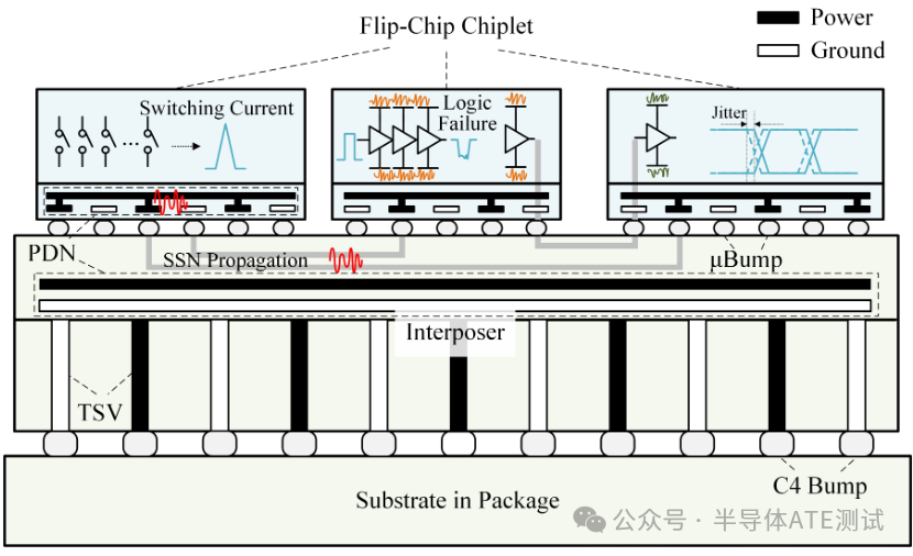 感恩科技的发展,AI 正在逐步改写我们的工作学习模式,Q4各家半导体设备厂商举办的技术峰会里,对AI的讨论也层出不穷。高速接口是谈及AI,一个无法绕过的话题。如今,数据传输速率已从兆赫兹级跃升至百吉赫兹级。尖端的高速接口,如:SerDes、DDR5、PCIe Gen6/7,它们是现代计算的性能基石,但测试它们的速度和精度,已经成为产品能否快速上市(TTM)和制造成(COT)的核心瓶颈。我们不得不正视一个残酷的现实:DUT数据传输的增长速度,如同脱缰的野马,传统的 ATE 架构和测试方法论正在被“甩在身后”,高频高速带来的物理极限——信号完整性(SI)与电源完整性(PI)的挑战,以及海量数据吞吐压力,正不断挤压着测试的边界。本文将尝试解读这场半导体测试领域的“速度与激情”,从高速测试PCB PI&SI约束及限制,笔者了解到的最新ATE系统架构,ATE+SLT+AECQ一体化测试方案,这三个方向进行剖析,争取能窥探这场架构和效率革命一二。 一. 高频高速测试:负载板SI 与 PI 约束探索 ![]() 1.1 PAM4 的“三只小眼睛”:信号容忍度的崩塌危机为了在有限的带宽内传输更多数据,行业不得不采用更复杂的调制方式。从非归零码(NRZ)到四电平脉冲幅度调制(PAM4)的转变,是带宽“压榨”技术的典型代表。PAM4:通过四个电压电平在同一周期内传输两个比特,理论上速度翻倍了,但这真是免费的午餐吗?代价就是信号容忍度(Signal Margin)的急剧下降。PAM4 将信号的垂直裕度压缩成了传统 NRZ 的三分之一 1。这意味着,眼图被“压扁”成了三只小眼睛,对噪声和抖动的容忍度比以往低得多1。随着数据速率飙升,位错误率(BER)对于设计和测试的容错空间变得越来越小。当测试精度必须追上信号幅度的衰减速度时,任何微小的误差都会被放大,否则你测出的结果就是“盲人摸象”,毫无意义!先进的数字协议(如 PAM4、PAM8)对信号质量变化的容忍度极低 1,这迫使 ATE 设备必须具备更高带宽、更低噪声和更精细的抖动分析能力 1.2 SI 的“隐形杀手”:PCB 走线与“残铜桩”的噩梦高频高速信号在PCB上传输,如同在城市的“高速公路”上行驶,面临着物理世界的种种“陷阱” 。 首先是 PCB走线的困境。随着芯片集成度提高,PCB 上的元器件密度也随之增加,走线必须变窄。窄迹线比宽迹线更有可能成为阻抗不连续的“断崖”。元器件密度的增加还使得走线间的空间越来越小,这直接导致了串扰(Crosstalk)风险急剧上升。串扰是由于感应磁场或寄生电容导致的,你的信号在传输时被邻居的“噪音”吵到了! 这种信号间的“噪音污染”严重恶化了信号质量。 其次是Via Stub(残铜桩)的“噩梦”。传统的贯穿性 Via(通孔)在多层板中连接不同层,但通孔底部未使用的部分会形成一段“线头”。这段“残铜桩”在高频下会成为一个谐振腔,引起严重的信号反射,破坏眼图 。 例如,对于 Nyquist 频率大于 10GHz 的 PAM4 信号,Via Stub 长度被要求小于10mils。为了消除这些影响,必须采用更复杂的制造工艺,如背钻技术(BackDrilling)。背钻能移除通孔底部的残铜桩,但这不仅增加了 PCB 成本,更要求你的 ATE Loadboard 必须达到近乎完美的 SI 标准,否则ATE测的只是负载板! 1.3 PI 的“隐形地基”:目标阻抗与 VVI 的最终防线如果说 SI 是保障信号清晰的“高速公路”,那么 PI(Power Integrity,电源完整性)就是保障这条公路拥有稳定“电力供应”的“地基”。在高速测试中,数字芯片的瞬态电流需求巨大且变化剧烈,任何电源网络的噪声都会直接耦合到信号线上。你的信号之所以“摇摇晃晃”,可能就是“地基”不稳。电源分配网络(PDN)设计必须满足一个核心原则:目标阻抗(Target Impedance)。在频域内,PDN的阻抗在器件工作频率范围内必须低于这个目标阻抗。只有满足目标阻抗要求,才能保证电源轨上的电压波动(Ripple)在可接受的范围内。 为了“打好地基”,**去耦电容(Decaps)**的选择和放置至关重要。 1.Decaps 的选择: 必须利用基于零点和极点的特殊算法,确定使用最少数量的电容来实现目标阻抗,否则就是过度设计,徒增成本! 2.Decaps 的放置: 在频域优化中,目标是优化 Decaps 的物理放置以降低 PDN 阻抗。 然而,即使经过频域优化,时域中的电压违规(Voltage Violations) 仍然可能存在。因此,资深工程师必须进行瞬态电流仿真,并引入电压违规积分(VVI) 作为关键度量。VVI 能够量化电压波动对系统的影响,通过策略性地增加 Decaps 来缓解时域上的电源噪声问题,这是确保数字系统长期可靠工作的“最终防线。 二. 高频高速测试:ATE系统架构变革 2.1 ATE 的“I/O 延迟陷阱”:为何你的测试程序跑不快?传统ATE架构的效率瓶颈,在于其高度依赖主测试程序对硬件资源的集中控制。在测试流程中,程序需要频繁地、串行地访问数量众多的引脚电路芯片(PE)来完成配置和读取数据 2。这种串行、低效的 I/O 访问机制,造成了配置和读取时间的显著延长。随着数据率和通道数的几何级数增长,主程序与 PE 芯片之间的 I/O 延迟,成为了缩短芯片测试时间的主要障碍。 现场可编程门阵列(FPGA)的引入,为解决这一效率困境提供了新的解决思路。 数据并行读取: 通过在ATE业务板上部署 FPGA,将其配置为一个专用的、高效的 I/O 管理器 。FPGA 在预设时间间隔内,能够并行地读取该业务板上所有 PE 中的测试数据,并将数据批量存储在板载缓存中 2。 批量访问: 传统的测试程序现在无需再与速度较慢的PE芯片进行频繁