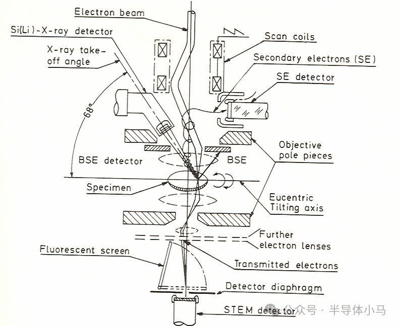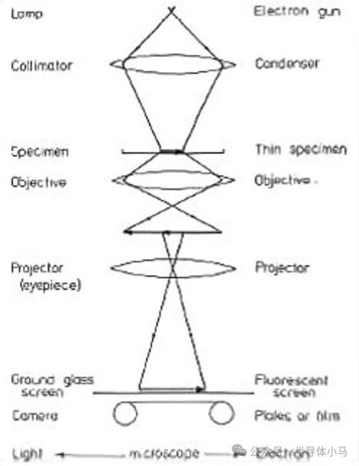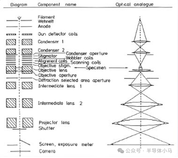 一、TEM 简介1. TEM 的加速电压远高于扫描电子显微镜(SEM); 2. 中压电镜加速电压为 200-500 kV,相比低压电镜(80-120 kV)具备更优的透射效果和分辨率,超高压电镜加速电压可达 500 kV-3 MV; 3. 与 SEM 一致,TEM 电子枪通过热电子发射、肖特基发射或场发射产生电子(高亮度、高相干性要求时采用场发射); 4. 2-3 级聚光镜系统可调节样品的电子照明区域; 5. 电子束穿过 5-100 nm 薄样品后,其强度分布通过 3-4 级透镜系统成像于荧光屏。 6. 7. △更多更详细的资料扫码获取 二、TEM 仪器结构核心部件 灯丝、阳极、韦氏筒、电子枪偏转线圈、聚光镜 1、聚光镜 2、聚光镜消像散器、聚光镜光阑、摇摆线圈、对中线圈、扫描线圈、物镜消像散器、样品、物镜、物镜光阑、选区衍射光阑、中间镜 1、中间镜 2、投影镜、快门、荧光屏 / 曝光计、相机。