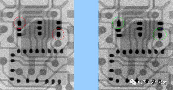 需要注意的是,X射线检测存在一个缺陷,通过X射线将立体的缺陷投影到平面上,因此无法确定缺陷的具体位置和大小,有时还会引起误判,例如下图所示。此种情况需要从垂直的两个方向来进行X射线成像。