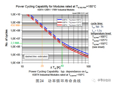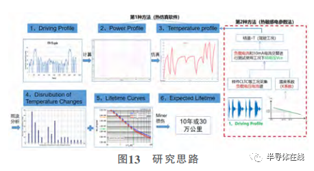 3 IGBT使用寿命分析与评估 3.1 研究思路 根据IGBT失效模式可知,结温变化是影响其使用寿命的主要因素。评估IGBT的使用寿命就需要首先获得其在用 户工况下的结温曲线,然后结合IGBT功率循环寿命曲线, 应用累积损伤理论评估IGBT的使用寿命,具体分析步骤如 图13所示。这其中主要关键点及难点如下所述。 1) 用户代表工况选取,目前采用NEDC或者CLTC工况。 2) 工况中结温测量和结温曲线的获取,实车中很难通 过布置传感器的方案来直接获取结温曲线。目前有两种可 行方法:一种是通过计算功率损耗,结合热仿真模型获得;另一种是通过间接的热敏感电参数法获取相应的结温曲线, 详见3.3.2分析。 3) 温度分布:采用雨流法分析。 4) IGBT寿命曲线,一般由IGBT模块厂家提供。 5) 寿命评估,使用温度分布数据和IGBT寿命曲线结合 损伤理论进行寿命评估。 3.2 IGBT结温测试的几种方法 3.2.1 物理接触测量法 把热敏电阻或热电偶等测温元器件焊接于IGBT内部, 从而获取模块内部基板的温度。测试方便但存在较大测量 误差,如图14所示。 3.2.2 光学非接触测量法 先将IGBT模块打开, 除去透明硅脂,然后将IG- BT芯片表面涂黑,以提高 温度测量准确性,最后通 过热像仪等采用红外热成像 方法测试结温。属于破坏性 测量方法,如图15所示。3.2.3 热敏感电参数法 利用半导体功率器件内部微观物理参数与器件温度具 有一一对应的映射关系,将芯片本身作为温度传感部件, 将其自身难测的内部温度信息反映在模块外部易测的电气 信号上,对芯片结温进行逆向提取,如图16所示。 3.3 试验方案 3.3.1 任务曲线建立 为了保证IGBT模块使用寿命的可比性,通常采用标准 的驾驶循环作为基本工况。国内一般采用NEDC (New Eu- ropean Driving Cycle,新标欧洲循环测试) 或CLTC (China Light-duty Vehicle Test Cycle,中国轻型汽车行驶工况) 作 为基本工况。以CLTC工况为例,采集电机控制器在此工况 下的电压电流值,如图17所示。 3.3.2 结温曲线 本文采用热敏感电参数法反推获得IGBT模块在CLTC工 况下的结温曲线。 1) 温度系数 (K-factor) 测试 参考JESD51-1 《集成电路热测试方法》 测试K系数。测 试步骤如下:设定好温度环境TL0,当器件外壳温度稳定时 给IGBT模块施加小电流 (10mA) 记录集电极和发射极间压 降大小VL0,然后将环境温度升高到THi,按上述要求记录此 时压降。两次温度值的差值除以电压差值即为K系数。 通过Power Tester 1800A功率循环测试仪测试K系数 (图18),结果如下:K-Factor:-2.694mV/℃。 2) 瞬态热测试 (负载) 测试原理图如图19所示。根据任务曲线得到的负载电 流,基于能量守恒,采用MATLAB软件将电流谱处理成300 个恒定电流值便于实际加载测试。测试方法如下:①在IG- BT Gate上加上15V电压,使Gate完全打开,在CE之间用大 电流加热,使之达到热平衡;②在器件达到热平衡之后, 瞬间从大电流切换到小电流 (10mA),测量压降Vce;③测试 结果如图20所示,根据K系数中结温与Vce的之间的关系,得 出CLTC工况下的结温曲线,如图21所示。 3.3.3 温度分布 (ΔT) Ncode雨流分析流程如图22所示。为了将任务曲线引起 的结温变化与功率循环寿命曲线进行比较,采用雨流计 数法统计不同结温变化ΔT出现的频次。温度分布ΔT如图 23所示。 3.3.4 功率循环寿命曲线 研究发现当温度变化过程中的最高结温小于120℃时, 可以利用Coffin-Manson模型进行预测,该模型被广泛用于描 述半导体模块PC过程的失效规律。后经Arrhenuis修正,将 平均结温Tjm纳入考核范围,得到LESIT模型: 随着封装技术的改进,IGBT模块的寿命有了很大提高。焊 料层疲劳成为与键合线同等重要的失效机制。2008年Bayerer 考虑到功率循环试验中温度波动范围、最大结温Tjmax、模块 键合线直径D、直流端电流i、阻断电压V等因素都会对器件 寿命造成影响,得到了CIPS多参数模型: 通过功率循环试验确定模型参数,绘制如图24所示的 功率循环寿命曲线。 3.3.5 IGBT寿命评估 根据温度分布ΔT,并参考功率循环寿命曲线,将一个 驾驶循环中所有ΔT下的损伤相对其出现的频次加权求和, 可得到一个驾驶循环下的累积损伤。该累积损伤的倒数即 是功率模块的使用寿命,即: 式中:ni ———在一个驾驶循环中,ΔTj出现的次数;Ni ———在功率循环寿命曲线中,ΔTj 对应的循环次数;Nf ——— 功率模块使用寿命。 通常整车的使用寿命是30万公里,一个CLTC的行驶里 程大约是14.48km,则整车至少需要运行20718个CLTC才满 足寿命要求,通过计算Nf =13973605,远大于20718,满足整 车的使用寿命要求。 4 电控总成IGBT加速试验 既然IGBT失效占电控总成失效的绝大多数,那么电控总 成试验中IGBT的考核是否足够?如何进行IGBT加速试验呢? 通过上述分析可知,IGBT模块的结温变化是影响其工 作寿命与可靠性的主要因素。因此在总成试验中,结温变 化的幅度和频次将直接影响其使用寿命。以冷热冲击试验 为代表的被动“功率循环试验”将是一个很好的试验方案。 由于该试验工作模式1.1,属于被动加热引起的结温变 化,其中ΔT=125℃、N0=215次,远低于行标要求。根据IG- BT热循环寿命曲线 (图25),当ΔT=125℃时寿命循环数N1约 3000次,故冷热冲击试验考核仅占全寿命周期的7.2%,属 于考核偏弱,可适当增加循环数或加大温度变化范围,如 表2所示。 此外,通过分析NEDC或CLTC等驾驶工况可知,主动 “功率循环”产生的结温变化频次较多,但幅度偏小。以 CLTC工况为例,根据3.3.3雨流