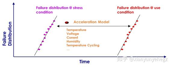 寿命这个概念,严格来讲属于耐久性的范畴,是产品耐久性的一种度量方式。耐久性怎么理解呢?可以认为是可靠性的一种特殊情况,表示产品在规定时间内抵抗腐蚀、热冲击、磨损、裂纹等外来应力损坏的能力。按照这种耐久性的理解,我们推测寿命,最直观的理解,就是让产品处于对应的应力条件下,一直工作到失效,监控这个时间周期,即为使用寿命。但如果这样安排寿命推算,产品还没有进入市场已经丧失竞争力了。因此在可靠性寿命计算的过程中,用到了加速的概念。 在介绍常用的可靠性加速因子模型前,我们再提一下失效率和失效函数的定义。 失效率就是产品在一定时间内失效的数量。将芯片的失效率与工作时间的关系画出一条曲线,横坐标表示器件工作时间,纵坐标表示失效率。器件整个使用寿命分为三个阶段:早期失效期,随机失效期,耗损失效期。其中随机失效期的失效率通常是相对恒定的且较低,是可靠性预测时最常用的是一个时间段。随机失效期的失效率服从指数分布。 模型需要将真正的寿命时间用实验的方式加速推算,形成加速模型,将损耗失效期提前表征出来。比如下图中,实际失效分布为右边曲线,加入加速因子后,曲线左移,表示为应力条件下的失效分布曲线。耗损失效期就可以提前表现出来。 加速因子计算公式为: ![]() 最长使用的加速模型是Arrhenius加速模型。 温度加速因子: 电压加速因子: ![]() ![]() 温度加速因子和电压加速因子的乘积即为综合的加速因子。温度加速因子中,Ea为失效反应的活化能(eV),半导体元器件常见的失效反应活化能如下表所示,HTOL中Ea一般代入0.7eV: MTTF为平均失效前时间,对于不可修复产品,失效时间即产品寿命,MTTF即为平均寿命。MTTF不是真实的测试时间,只是通过概率论和数理统计的方法推算出来的,根据统计学的推导,当器件失效率成指数分布,同时每个失效都是独立的,那么总测试时间的两倍与MTTF的比值呈自由度为r的卡方分布。卡方分布的值可以通过数据手册查表获得。 代入对应的计算场景,举例计算寿命如下: |