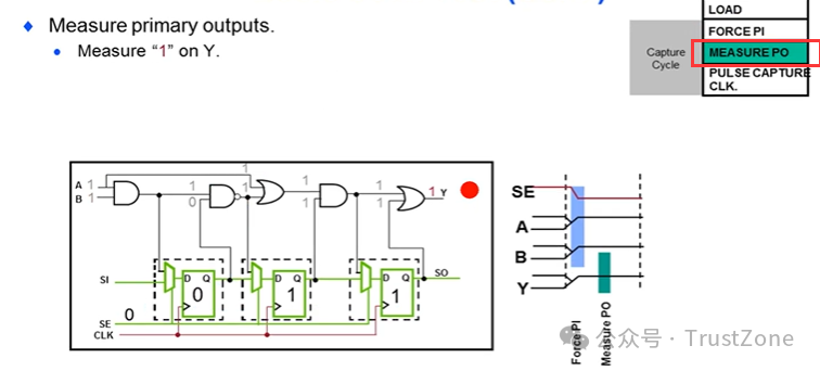 应用由已知值(Scan和Pl)定义的激励,允许组合电路在功能模式下运行,测量输出(PO),将测试结果时钟入扫描链。
