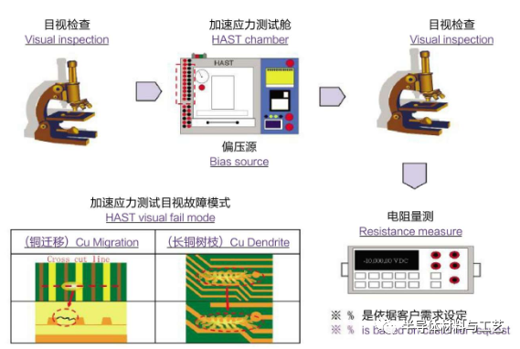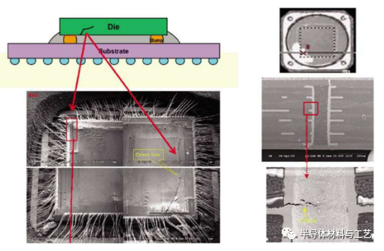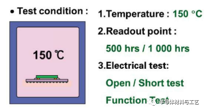 可靠性通常是指芯片封装组件在特定使用环境下以及一定时间内的损坏概率,换言之即表明组件的质量状况,也是电子产品未被商业化量产前与实际上市使用期间,产品性能和价值水平的总认定。所以封装厂必须对芯片封装组件的质量进行监控。如果说功能测试是检测产品目前的状况,那么可靠性测试就是预测产品在出厂后的使用质量。 可靠性测试主要是产品在一些特定的状态(特定使用环境与一定时间),对产品寿命影响的评估,确认产品的质量是否稳定,同时进行最佳的修正。通常客户为了以最快、最经济的方式评估芯片的状况,会通过加速测试,即采用比芯片正常工作状况更严苛的条件来进行测试,以此大幅缩短测试时间,快速评估故障发生率。 加速测试使用的前提是通过加速测试得到的故障机制必须和正常操作状况得到的故障机制相同,唯一的差别应该只有时间的长短差异,如此执行加速测试才有意义,否则就失去加速测试的初衷。一般常用的可靠性测试项目所选用的加速测试条件都与电压、湿度和温度等环境参数有关。 图1 可靠性测试示意图 芯片的可靠性在一定程度上可以说是芯片的寿命体现,作为一个质量控制和评估产品风险的工具,以及一个生产制造与材料供应的稳定度指标,可靠性成为客户在芯片上市量产前必须关注和研发改进的重要指标。在客户对产品质量有要求的前提下,可靠性测试的具体执行就有三大方向:验证什么,如何验证,到哪里验证。解决了这三个问题,质量和可靠性就有了保证,厂商才可以大量地将产品推向市场,也更容易获得消费者的青睐。 目前芯片载板封装的可靠性测试,大部分都是依照各个封装厂客户所要求的采购规范来执行,同时也会参照其他厂家或某些国际公认的可靠性规范来进行检测。以下是进行可靠性测试最常被采用的组织: (1)国际电工委员会(IEC) (2)美国军规(Milstd) (3)国际电子工业联接协会(IPC) (4)半导体工业标准组织(JEDEC) (5)日本工业标准协会(JIS) 通常芯片封装组件的可靠性测试都是围绕着温度、湿度及电压的影响因子,针对产品整体结构的电学性能和机械强度的检测来展开的。 图2 芯片载板封装常用可靠性测试示意图 各封装厂判断可靠性测试项目的标准不完全相同,以下就对目前市场上常用的芯片封装组件用到的可靠性测试项目作简单的归类及阐述。 图3 芯片封装的可靠性测试条件及流程示意图 通常封装厂对封装完成品要执行的可靠性测试项目会有六项,这六项测试项目有些可以同时进行,有些必须等待前面的项目完成后再执行。每个测试项目依采样方式,随机抽取一定数量产品的可靠性测试结果来判定是否通过测试。由封装厂确定抽样的规定与标准,每一家工厂各不相同,企业规模大的工厂的可靠性测试标准通常会较严苛。 以下分别对各项测试的内容与目的作说明: (1)温度循环测试(Temperature Cycling Test, TCT):是由热气腔和冷气腔组成,通过将封装体暴露在高低温气体转换的环境中,测试封装体抵抗温度差异化的能力。常见的测试标准为测试条件2,往复循环1000次,最终根据测试电路的通断情况判断测试是否通过。(见图4) 图4 温度循环测试示意图 测试目的:评估芯片产品中具有不同热膨胀系数的金属间接口的接触良率。方法是通过相对温度差异大的气体环境,从高温到低温往复变化。 测试条件:条件1: -55℃~125℃;条件2: -65℃~150℃。失效机制:电路的短路和断路、材料的破坏及结构机械变形。(见图5) 图5 TCT后的芯片封装失效缺陷图 (2)热冲击测试(Thermal Shock Test, TST):是通过将封装体暴露于高低温液体的转换环境中,测试封装体抗热冲击的能力。常见的测试标准为测试条件2,往复循环1000次,最终根据测试电路的通断情况判断测试是否通过。(见图6) 图6 热冲击测试流程及规范指标示意图 测试目的:评估芯片产品中具有不同热膨胀系数的金属间接口的接触良率。方法是通过循环流动的液体从高温到低温往复变化。测试条件:条件1: -55℃~125℃;条件2: -65℃~150℃。失效机制:电路的短路和断路、材料的破坏及结构机械变形。(见图7) 图7 TST后的导通线路断裂失效缺陷图 TCT与TST的区别在于TCT偏重于芯片封装的测试,而TST偏重于晶圆的测试。 (3)高温储藏试验(High Temperature Storage Test, HTST):通过将封装体长时间暴露于150℃的高温氮气炉中,测试电路通断路情况。(见图8) 图8 高温储藏试验规范指标示意图 测试的目的:主要在于测试长期高温状况下,例如150℃加热1000小时的情况,封装体中可能因为物质活性增强,物质迁移扩散而影响电路性能。测试的条件:温度:150℃;时间:500hrs/1000hrs;电性能测试:开路/短路测试。失效机制:电路的短路和断路、材料的破坏及结构机械变形。 (4)蒸汽锅测试(Pressure Cooker Test, PCT):俗称高压锅测试,主要测试封装产品抵抗环境湿度的能力,并通过增加压强来缩短测试时间。(见图9) 图9 蒸汽锅测试/热应力测试流程示意图 测试目的:评估芯片产品在高温、高湿、高压条件下对湿度的抵抗能力,加速其性能失效的过程。测试条件:130℃, 85%相对湿度,通电加偏压,锅内压力2个标准大气压。失效机制:化学金属腐蚀,封装塑封异常。(见图10) 图10 PCT后的金属电路失效缺陷图 (5)加速应力测试(High Accelerated Temperature and Humidity Stress Test, HAST):通过在高温高湿以及偏压的环境下,测试封装体抗湿度能力。(见图11) 图