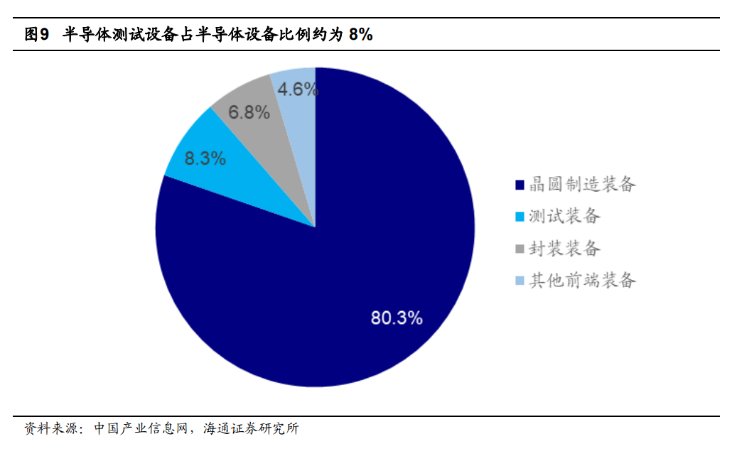 全球半导体市场 2021 年预计同比增长 8.4%,半导体厂商扩大资本开支。 1)2021 年全球半导体市场预计同比增长 8.4%。全球半导体市场 2021 年市场规模约为 4694 亿美元,同比增长 8.4%;分市场来看,模拟器件、逻辑器件、存储器在集成电路中增长较快,预计分别 达 8.6%、7.1%、13.3%,存储与逻辑器件市场空间超千亿美元,是集成电路中最大的 两个市场。 2)台积电、联电等半导体厂商 2020 年资本开支上行。从资本开支上看,2020 年 内台积电、联电、三星、中芯国际等半导体厂商资本开支上行,其中,台积电 2020 年 资本开支预计达 172 亿美元,同比增长 15.44%;此外,联电 2020 年资本开支计划达 10.01 亿美元,相比 2019 年增长 56.65%;三星 2020 年资本开支同比增长 43.15%;中芯国际 2020 年资本开支同比增长 185%,达 57 亿美元。 3)2021 年 9 月北美半导体设备制造商月度出货额同比增长 35.50%,景气度持续。2019 年 10 月北美半导体设备制造商月度出货额同比开始回正,当月 出货额为 20.81 亿元,同比增长 2.5%;2021 年 9 月,北美半导体设备制造商月度出货 额为 37.18 亿美元,同比增长 35.50%。 2.3 市场空间:2019 年全球半导体测试设备市场空间 65 亿美元,国产化率提升下中国市场有较大发展空间 2019 年全球半导体测试设备市场规模预计为 65 亿美元,其中测试机市场规模为 33.5 亿美元;应用领域结构来看,SoC 领域测试占比最大且相较储存测试更具持续增 长力。 1)半导体测试设备占半导体设备比例约为 8.3%,其中 SoC 领域测试占比最大。根测试设备广泛应用于集成电路生产制造的整个流程,对于良 率和品质控制至关重要,半导体测试设备在半导体装备中占比为 8%,仅次于晶圆制造 装备;按领域市场结构看,SOC 测试/储存芯片测试/RF 测试/模拟芯片测试占比分别为 64%/18%/16%/2%。