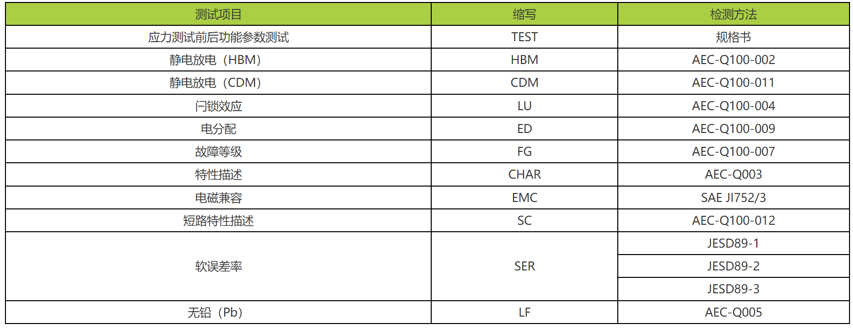 AEC是Automotive Electronics Council汽车电子协会的简称,AEC-Q则是汽车电子协会制定的一系列电子元器件质量标准和规范,旨在确保汽车电子产品在极端环境下的可靠性和稳定性。AEC-Q包括多个方面的标准和规范,其中最重要的是下图所示的几个标准,涵盖了从被动元器件到集成电路等各种类型的电子元器件。 ![]() 其中AEC-Q100是针对集成电路进行测试和认证。主标准全称:Failure Mechanism Based Stress Test Qualification For Integrated Circuits In Automotive Applications,笔者翻译为-汽车级应用中基于失效机理的集成电路应力测试鉴定。除了主标准还有12个子标准,从001-012如下所示: AEC-Q100:汽车级应用中基于失效机理的集成电路应力测试鉴定 AEC-Q100-001:引线键合剪切测试 AEC-Q100-002:HBM静电放电测试 AEC-Q100-003:MM静电放电测试[退役] AEC-Q100-004:IC闩锁测试 AEC-Q100-005:非易失性存储器程序/擦除持久性、数据保持和工作寿命测试 AEC-Q100-006:热电效应引起的寄生门极漏电流测试(GL)[退役] AEC-Q100-007:故障仿真和测试等级 AEC-Q100-008:早期寿命失败率(ELFR) AEC-Q100-009:电分配评估 AEC-Q100-010:锡球剪切测试 AEC-Q100-011:CDM静电放电测试 AEC-Q100-012:用于12V系统的智能功率设备的短路可靠性表征 注:其中AEC-Q100-003和AEC-Q100-006已经废止。 本次解读主要针对主标准。标准文件中包含一套基于故障机制的应力测试,并定义了参考测试条件和鉴定要求,期望在应用中提供一定水平的质量/可靠性。 PART I : 文件中的一些声明和通用要求 1、根据AEC-Q100文件中列出的要求成功地完成和记录测试结果,供应商可以声称该零件通过了AECQ100认证。对于ESD,强烈建议在供应商数据表中通过脚注指定通过的HBM耐压和CDM测试条件,特别是如果这些ESD水平低于2kV HBM或750/500V CDM,不包括:先进的CMOS节点(28nm及以下)和RF工作频率部分。 2、没有关于AEC-Q100资格认证的“证书”,也没有由AEC运行的认证委员会来认证器件。每个供应商都按照AEC标准进行资格认证,考虑客户要求,并将数据提交给用户,以验证是否符合Q100。 3、AEC-Q100定义了器件的4个温度等级。对于测试组B-加速寿命模拟测试:高温运行寿命(HTOL)、早期寿命失效率(ELFR)和NVM耐久性、数据保留和运行寿命(EDR),应力期间器件结温应大于等于该等级的热温度。 ![]() 4、FC-BGA倒装BGA封装构造:图1显示了两种具有代表性的封装配置,其中一个裸die通过凸点或支柱连接到基板上(其他可能的配置可能适用)。该封装还可以使用一个盖子(例如,撒热器)或使用塑料成型化合物进行封装。该基板包含作为与PCB连接的焊球。 5、通用数据:AEC-Q100强烈鼓励使用通用数据来简化资格认证过程。通用数据可以立即提交给用户,以确定是否需要进行任何额外的测试。需要考虑的是通用数据必须基于表3和附录1所示的设备和制造过程各特性相关的具体要求矩阵。如果通用数据包含任何失效,则该数据不能作为通用数据使用,除非供应商已记录并对用户可接受的失效情况实施了纠正措施。 表3定义了一套资格测试,针对器件的任何变更都必须考虑进来,同样也针对与制程改变相关的新工艺制程和重新认证。该表是测试的扩展集,供应商和用户应将其作为讨论相关资格所需测试的基准。供应商有责任说明不需要执行任何推荐测试的理由。 附录1定义了一个标准,它将器件归为一个资格族来考虑器件认证问题,在这个族中所有家庭成员的数据是平等的和一般可接受的。对于每个应力测试,如果推理在技术上是合理的(即,是有数据支持的),则可以组合两个或两个以上的资格家庭。 6、测试样品的批次要求、可重复使用和容量要求 批次要求: 测试样品应由认证家族中有代表性的器件组成,如果缺乏通用数据就需要进行多批次测试,须由非连续晶圆批次中近似均等的数量组成,并在非连续成型批次中组装。也就是说,它们必须在工厂或装配工艺线中被至少一个不做鉴定的批次分开。任何偏离上述情况都需要供应商进行技术说明。 可重复使用:已经用于非破坏性认证测试的器件可用于做其他鉴定测试。已用于破坏性认证测试的器件则除了工程分析外不得进一步使用。 样本容量要求:用于资格测试和/或通用数据提交的样本量必须与表2中规定的最小样本量和验收标准相一致。 如果供应商选择使用通用数据进行资格鉴定,则必须记录特定的测试条件和结果并提供给用户(最好采用附录4中所示的格式)。应首先使用现有的适用的通用数据来满足表2中每个测试要求和第2.3节的要求。如果通用数据不满足这些要求,则应进行器件特定的鉴定测试。 7、应力前和应力后的测试要求:每个试验的终点试验温度(室温、热和/或冷)在表2的“附加要求”列中规定,Test Flow中也有相关示意。 ![]() 8、应力后测试失效的定义:测试失效定义为不符合2.2节中定义的个别器件规格、测试专用标准或供应商数据表的器件。第2.2节提到,如果本标准和任何其他文件的要求发生冲突,则适用下列优先顺序: a. 采购订单(或主采购协议的条款和条件) b.(双方同意的)个别器件规格 c. 本文件标准 d. 本文件第1.2节中的参考文件 e. 供应商的数据表 任何显示由于环境测试造成的外部物理损伤的器件也被认为是失效器件。如果失效原因是由于应力或测试期间的处理不当,如EOS或ESD,或其他与组件可靠性无关的原因,可不计为失效,但作为数据提交的一部分进行报告。 9、认证