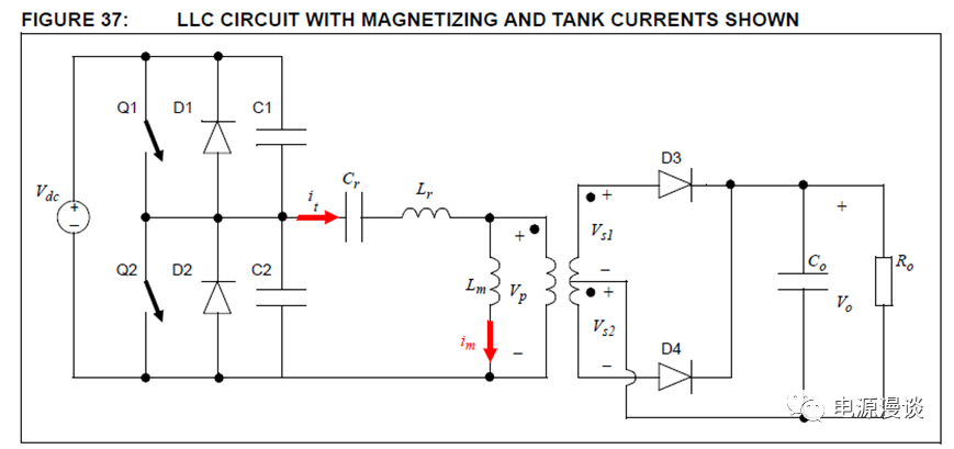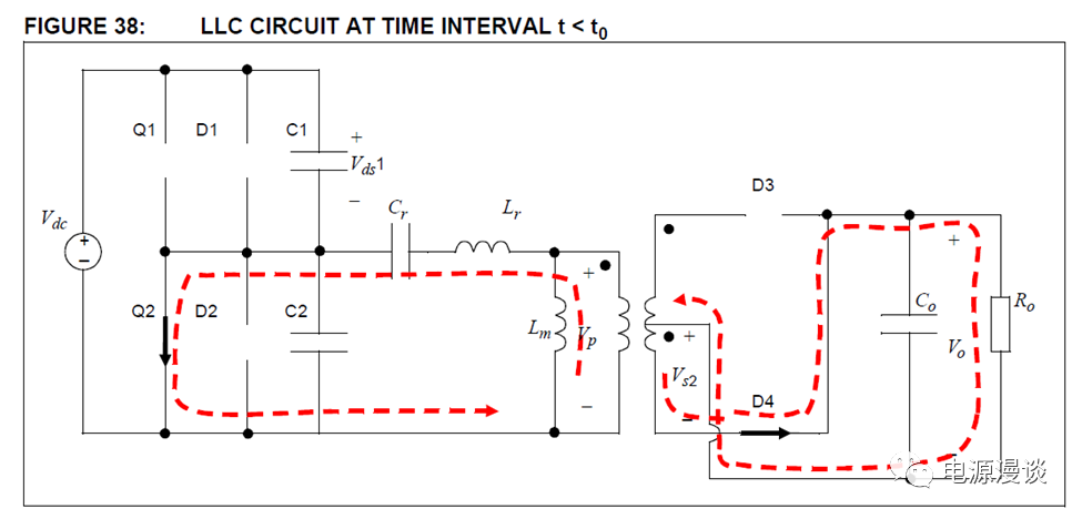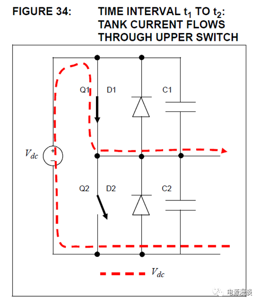 LLC谐振电路是常用的拓扑,广泛应用在目前的热门应用中,本文主要从典型谐振状态来分析其基本工作过程,后续我们将逐步扩展到其它工作状态。一.电路工作基本条件及电路组成 图1 电路主要组成部分 如上图1所示,当Q1,和Q2交替导通时,相当于一个幅值为Vdc的方波电压加在上图中的谐振腔部分,那么必然在谐振腔电路中产生正弦电流。正弦电流和基波电压的基本相位关系主要有三种,电压电流同相位,电压超前于电流相位,电压滞后于电流相位。当电压超前于电流时电路处于感性工作区域,电压滞后于电流相位时电路处于容性工作状态。本文重点分析感性工作状态区域。 这里我们进行开关节点的状态分析,单独将开关部分拿出来作为图2,如下所示。 图2 半桥开关节点状态分析 这个半桥LLC谐振开关主要由上下mosfet Q1和Q2组成的半桥开关,我们定义谐振腔电流留出两个电流中点时为正电流,相反方向为负电流。D1和D2为开关寄生的体二极管,C1和C2为开关的寄生电容。 二.开关的ZVS开通简要分析 图3 开关ZVS开通分析 接下来,我们基于图3所示的驱动波形及谐振腔电流波形进行ZVS开通分析。 图4 t0-t1阶段谐振电流流入D1 在t0时刻,电路中的开关均处于turn off状态,谐振腔电流中只有磁化电流且为负电流,这个电流流入电容中点进入Q1的体二极管,此时若turn on Q1开关,则由于Q1两端的电压非常小,则开通损耗就非常小。所以,一般认为只要在t0-t1之间的时刻开通Q1,则Q1的开通损耗非常小,此时电路处于感性工作区域,且得到ZVS开通特性。 图5 t1-t2之间Q1开通向输出传递能量 t1-t2之间的工作状态比较简单,Q1的开关是导通的,因此谐振腔电压为正,谐振腔电流也为正,输入源Vdc向输出传递能量。 图6 t2-t3之间Q2的ZVS开通 在t2时刻时,Q1是关闭的,而谐振电流为正,因此只能流过Q2的体二极管D2,Q2两端的电压就非常小,在t2和t3之间的时刻开通Q2,这个开关就会得到ZVS开通的特性,开通损耗非常小。 图7 t3-t4 Q2开关开通向输出传递能量 t3-t4之间段,半桥开关的下管Q2导通,谐振电流流入电容中点,因此这个阶段输入源通过Q2开关向输出传递能量,此时电压和电流的方向都是负的。 三.电路谐振状态时序详细分析 说到电路的谐振状态分析,我们先了解一下电路存在的两个谐振工作频率。 图8 电路的谐振频率fr 谐振电路由于存在谐振电感和谐振电容,因此具有一个谐振频率fr如图8所示。另一个谐振频率是由磁化电感Lm和谐振电容导致,如图9所示。 图9 电路的谐振频率fr2 当我们提到谐振频率的时候,我们通常是说fr这个频率。为了方便计算和分析,我们通常会用当前工作频率相对于fr来定义归一化频率,如图10所示。 图10 归一化频率的定义 下面我们主要基于如下的电路进行分析详细工作时序,如图11所示。 图11 LLC电路原理框图 从中可以看出,开关同样包含了寄生体二极管,及寄生电容,寄生电容包含mosfet CDS寄生电容及电路杂散电容,副边整流为了清晰说明原理,我们采用了二极管整流,后续我们会专门讨论同步整流相关的问题。 图12 LLC谐振电路典型工作波形 在图12中的典型工作波形中,我们给出了以下主要信号波形,主要包括Q1,Q2开关驱动波形,原边电流,包含磁化电流和谐振腔负载电流,mosfet开关两端的电压即C1和C2两端电压,副边电流即D3和D4的电流。 电路分析主要以时间间隔来说明,这里重点解释一下原边电流部分,除了负载电流反射到原边的电流之外,谐振腔的磁化电流部分不参与能量传递过程。 图13 t<t0时的电路状态 最初的电路状态假设如图13所示,下管Q2导通,谐振电流为负流入电容节点,副边整流管D4导通,电路向副边传递能量。 图14 t1-t2的死区电路分析 从t0时刻时Q2驱动会关掉,则两个开关都处于turn off状态,电路进入死区时间阶段t0-t1,此阶段没有能量从Vdc传递到输出端,谐振腔电流仅仅为磁化电流进行谐振换流且基本保持固定值。所谓的谐振换流,就是负的磁化电流在对寄生电容C1和C2充放电,在这个阶段电流是负的,所以主要是对C2进行充电同时对C1进行放电。 这里有一个需要设计者注意的是磁化电流需要足够大,以便在特定的死区时间内能够完成对C1的充电和对C2的放电,设计者可以进行合适的死区时间选择和器件寄生参数的选择。当C2电压充电到高于Vdc时开关Q1的体二极管D1就可以随时准备导通。 在死区阶段,由于磁化电流基本不变,变压器副边电压为0,因此副边整流管都不导通。 图15 t1-t2阶段电路分析 这个阶段当Q1还没有导通的时候,谐振电流还是流入寄生二极管D1(不向副边传递能量),因此开关Q1两端的电压非常小,此时若turn on Q1时可以得到ZVS开通特性,一旦开通Q1后,Vdc就把能量传递到输出端,副边整流管D3就可以导通。 图16 t2-t3阶段的能量传递阶段电路分析 上图中即是Q1和D3导通,Vdc向输出传递能量的第一个半周期,输出电压对变压器进行钳位,则磁化电流线性上升,如图17所示,此时谐振腔电流叠加了负载电流所以比较大。 图17 磁化电流变换公式 在典型波形图上的C波形,谐振电流波形上的蓝色部分就是在能量传递过程中,除了磁化电流外获得的谐振腔电流。 图18 t3-t4阶段死区电路分析 在t3时刻时,Q1还是导通状态,此时谐振电流等于磁化电流,此时turn off Q1开关,如果此时谐振腔电流较小时,则Q1关断损耗会比较小。 值得注意的是,这里有两个需要考虑的冲突的点,在这个时刻需要关断Q1时的谐振电流